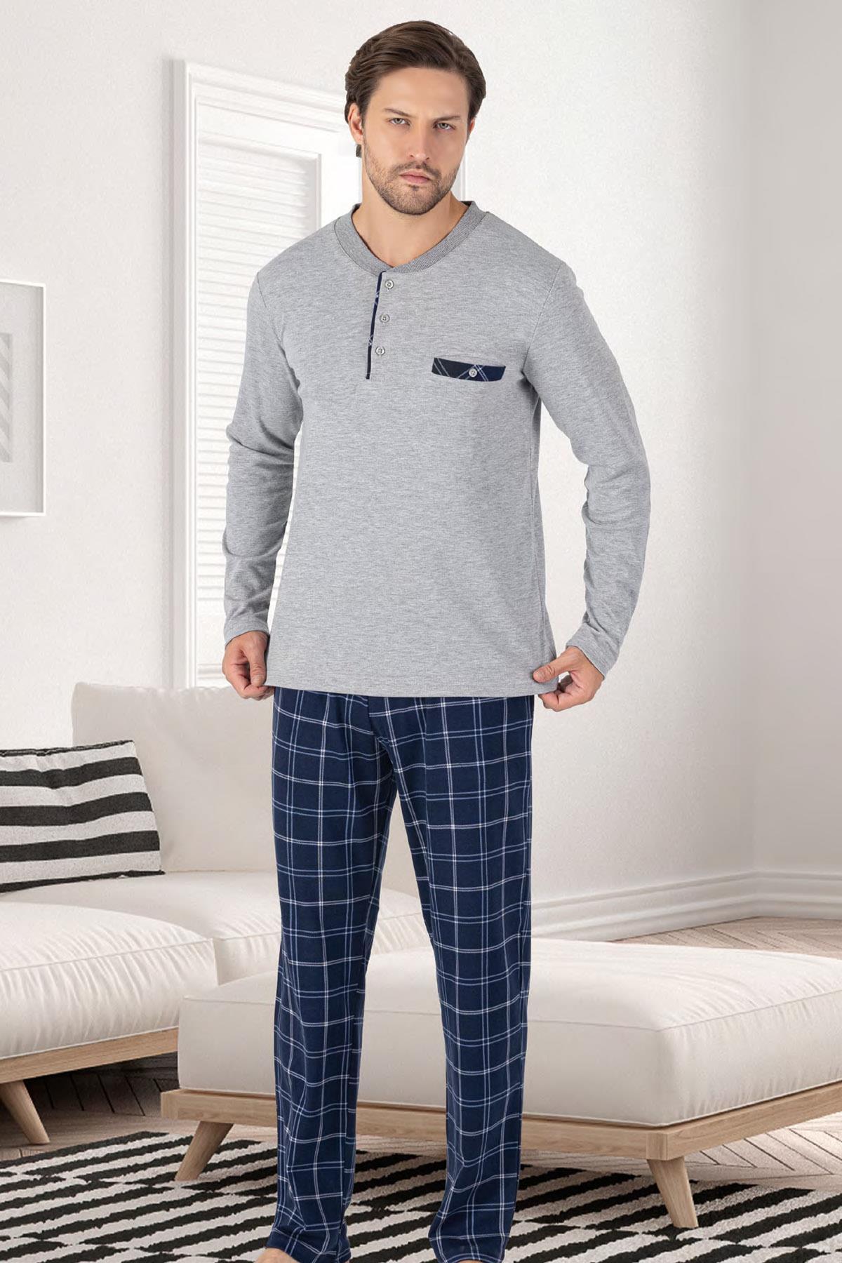 %100 Pamuk Erkek Mevsimlik Uzunkollu Pijama Takım, Altı ekoseli Cep Detaylı, Üst düz renk yuvarlak yaka düğmeli