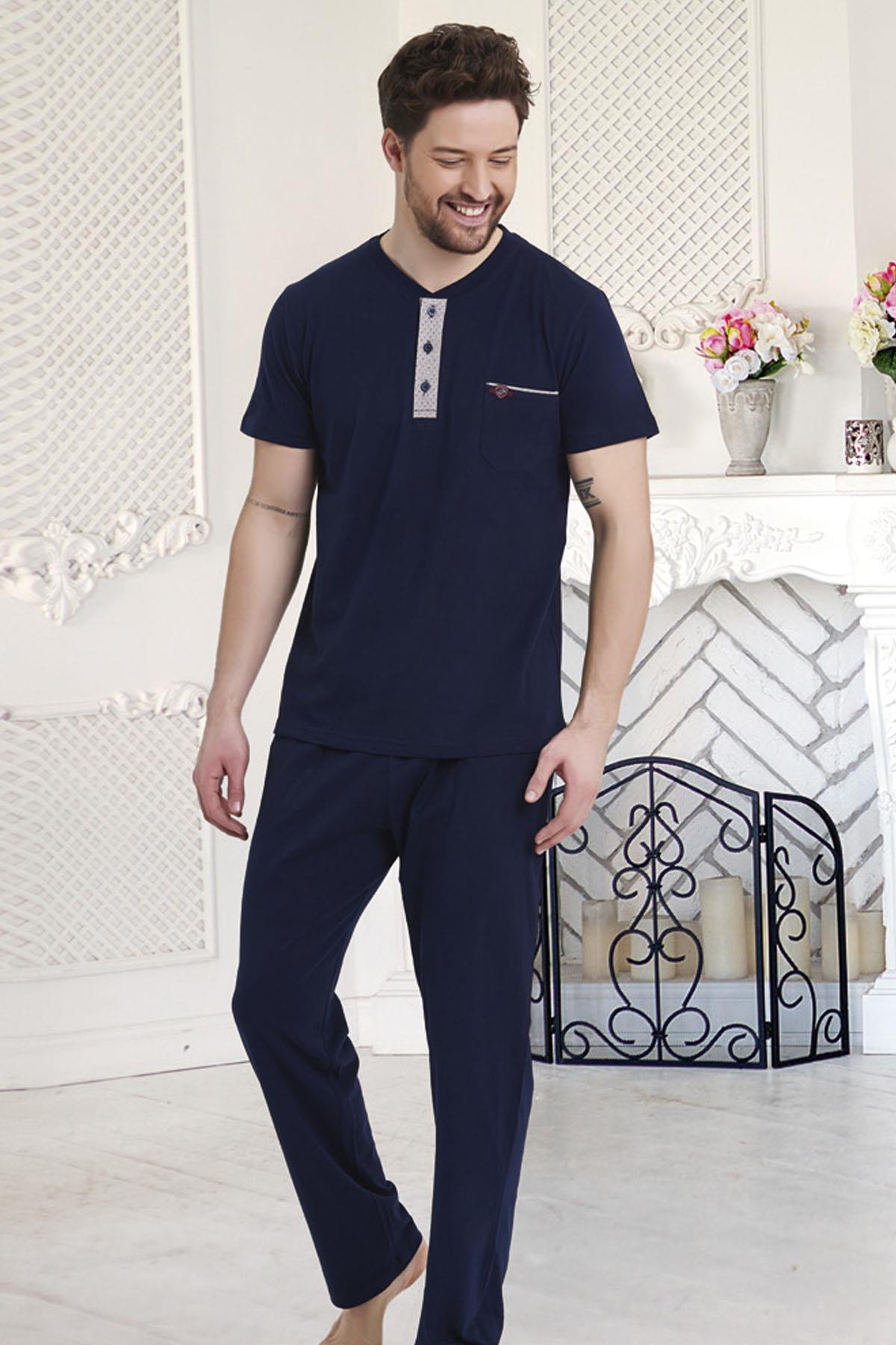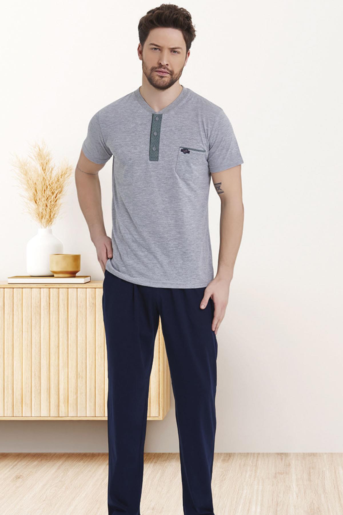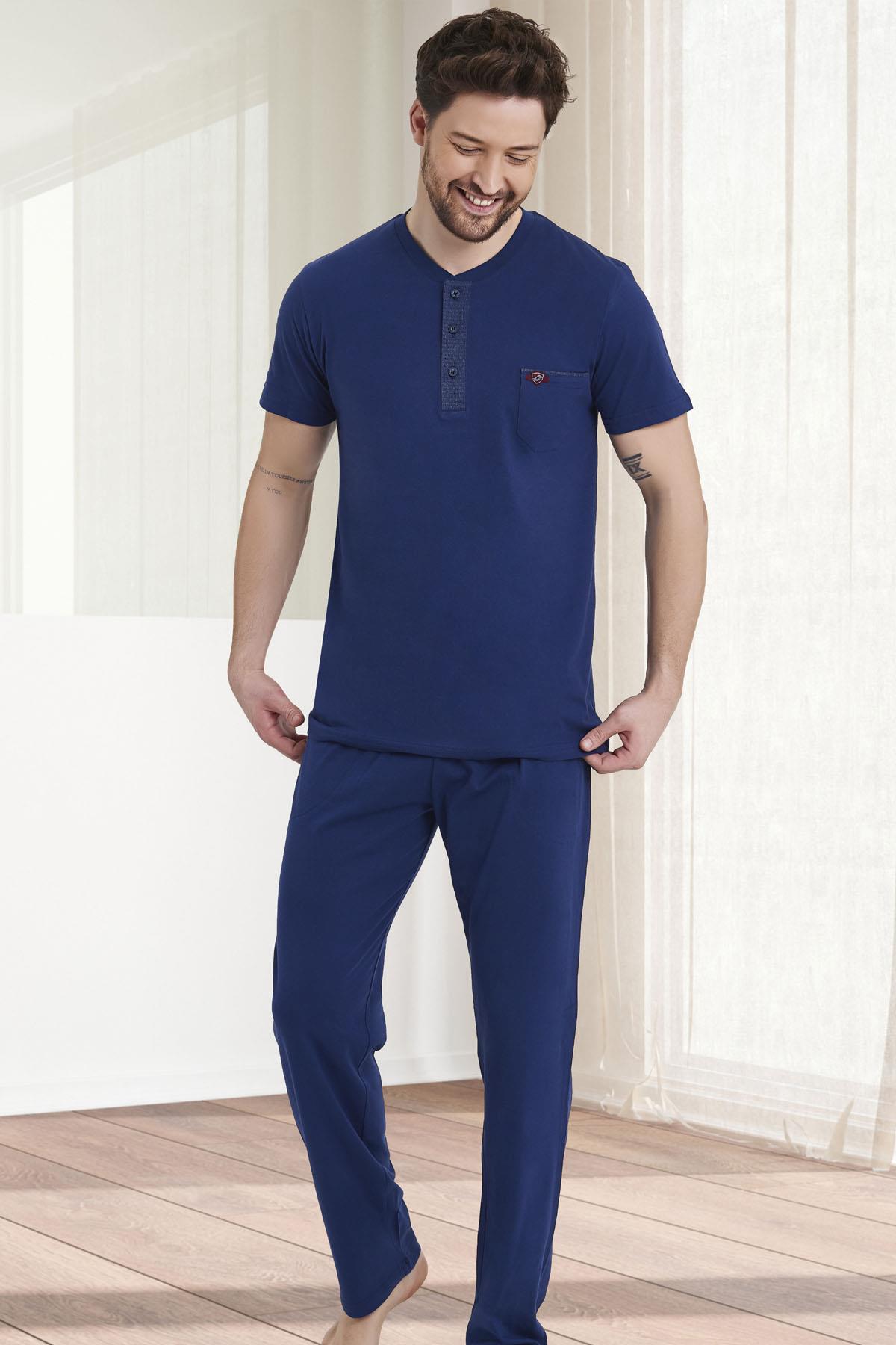 %100 Pamuklu Kısa Kol Yuvarlak Yaka Düğmeli Yazlık Erkek Pijama Takım
