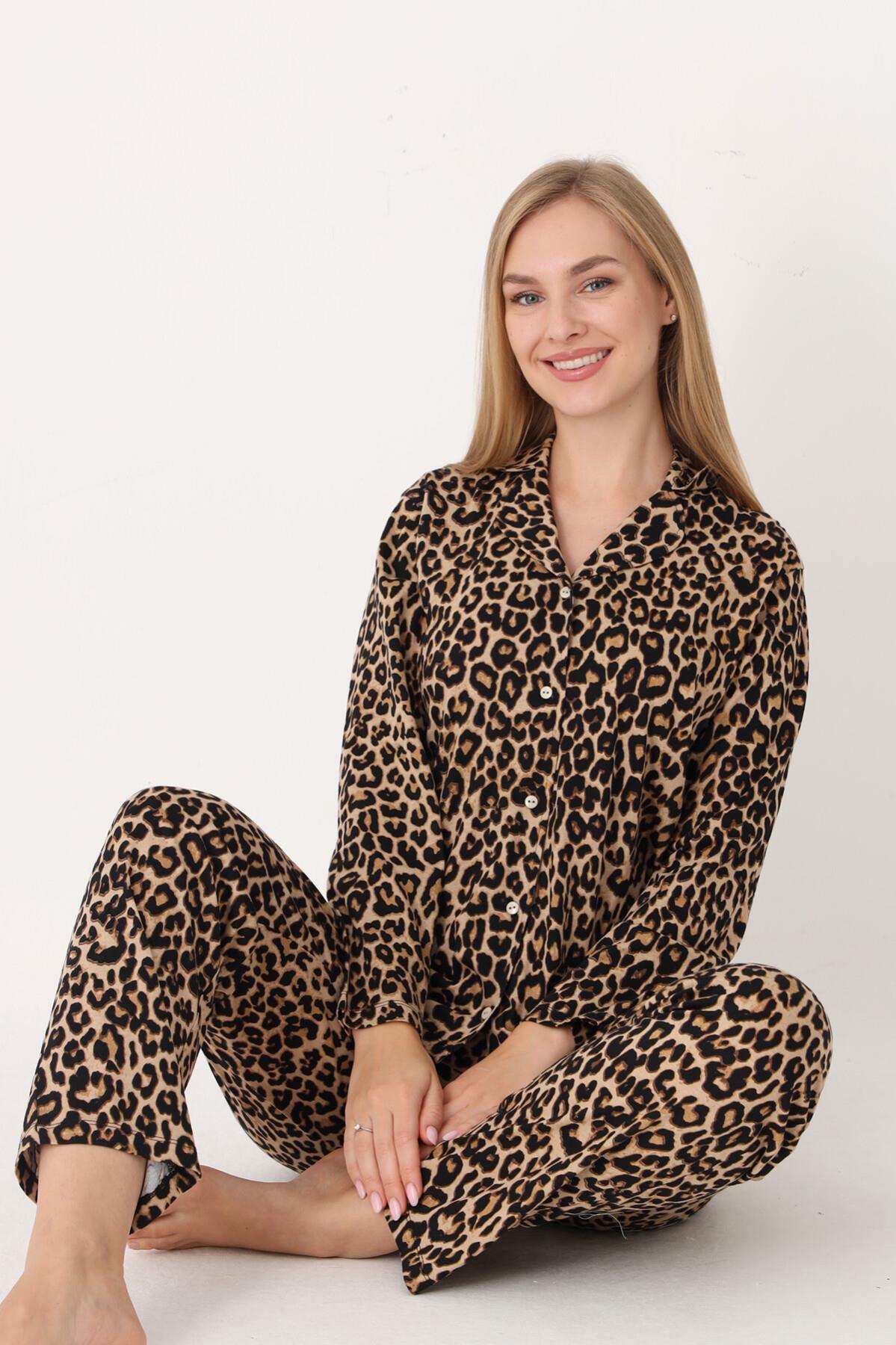 %100 Pamuklu Leopar Pijama Takım, Leopar Desenli Önden Düğmeli, Gömlek Yakalı Kadın Pijama Takım