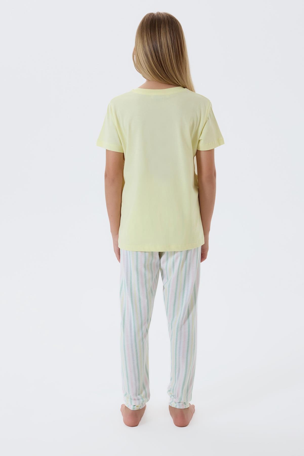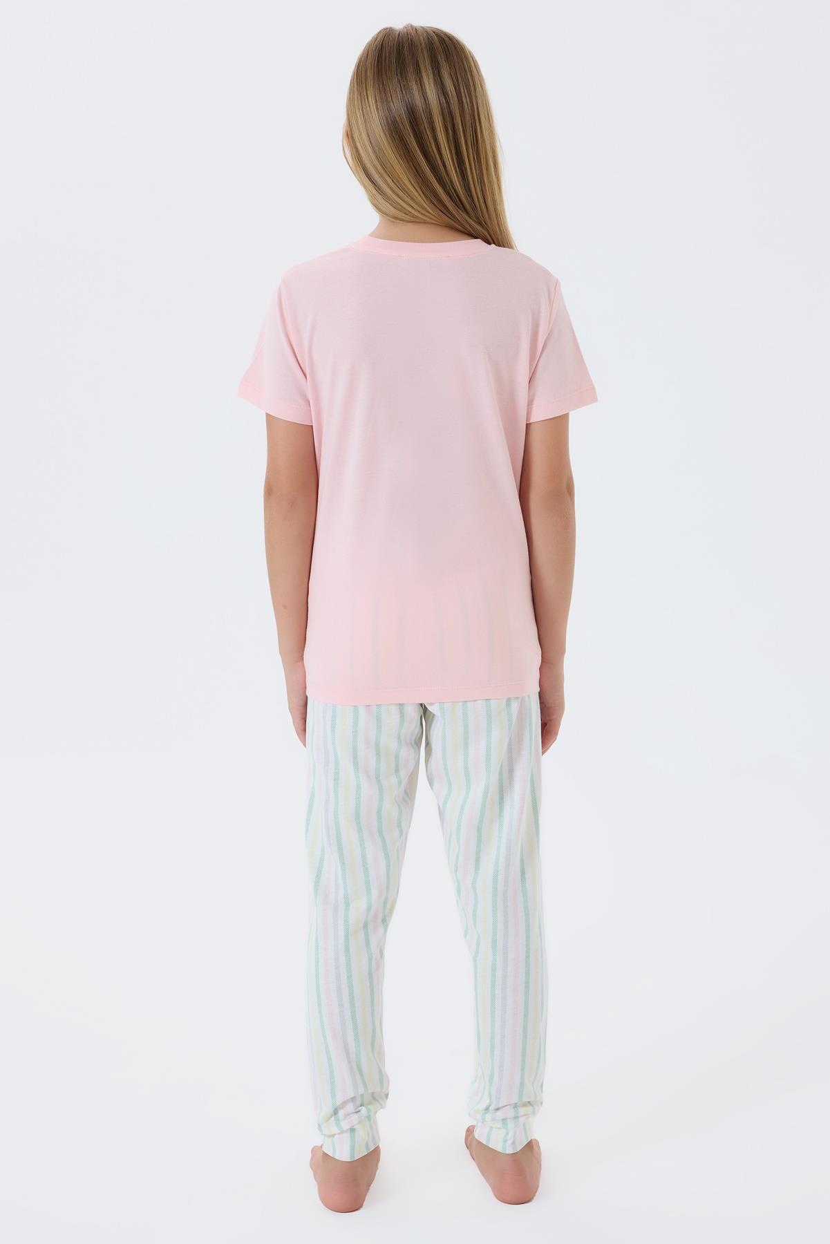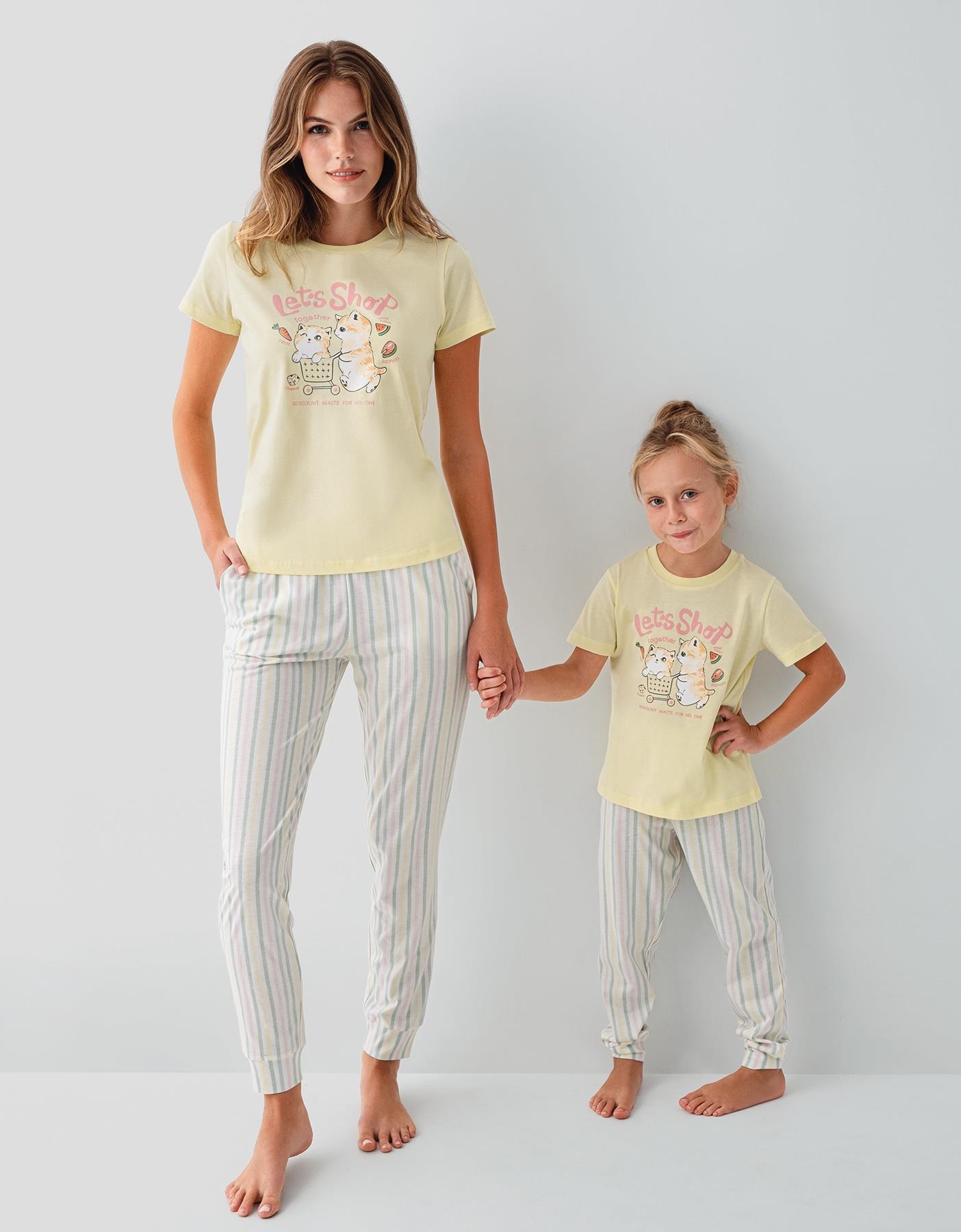 Anne ve kızlar için özel olarak tasarlanan bu pijama takımı, yumuşak dokusu ve neşeli tasarımıyla evde geçirilen anları daha keyifli hale getirir. Üst kısmı kısa kollu tişört, alt kısmı ise çizgili pantolondan oluşan bu takım, hem rahat hem de şık bir kullanım sunar.