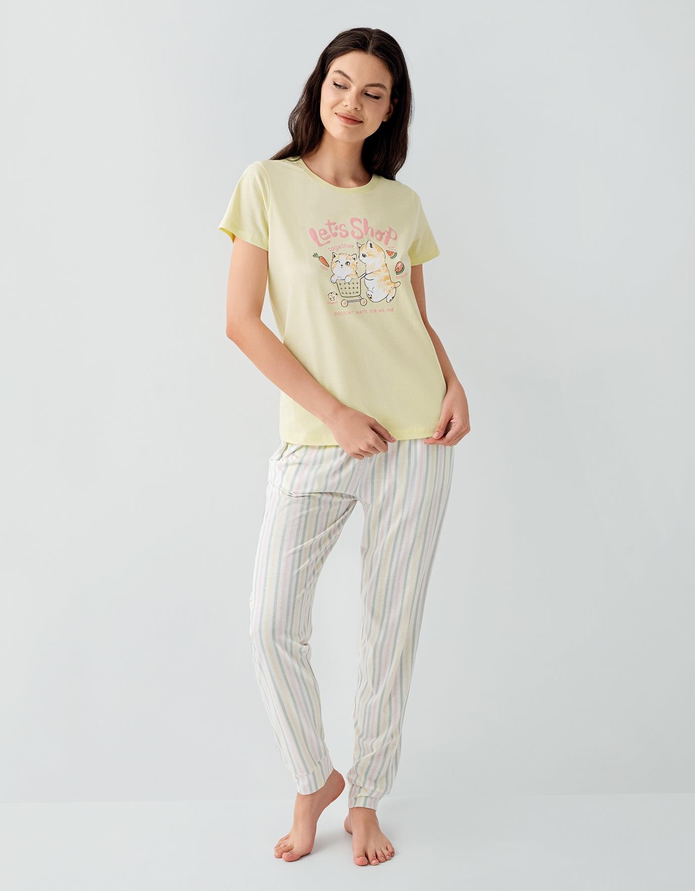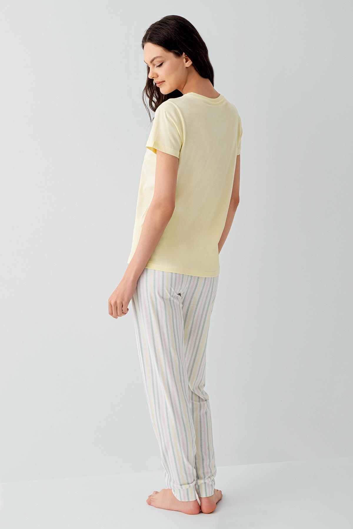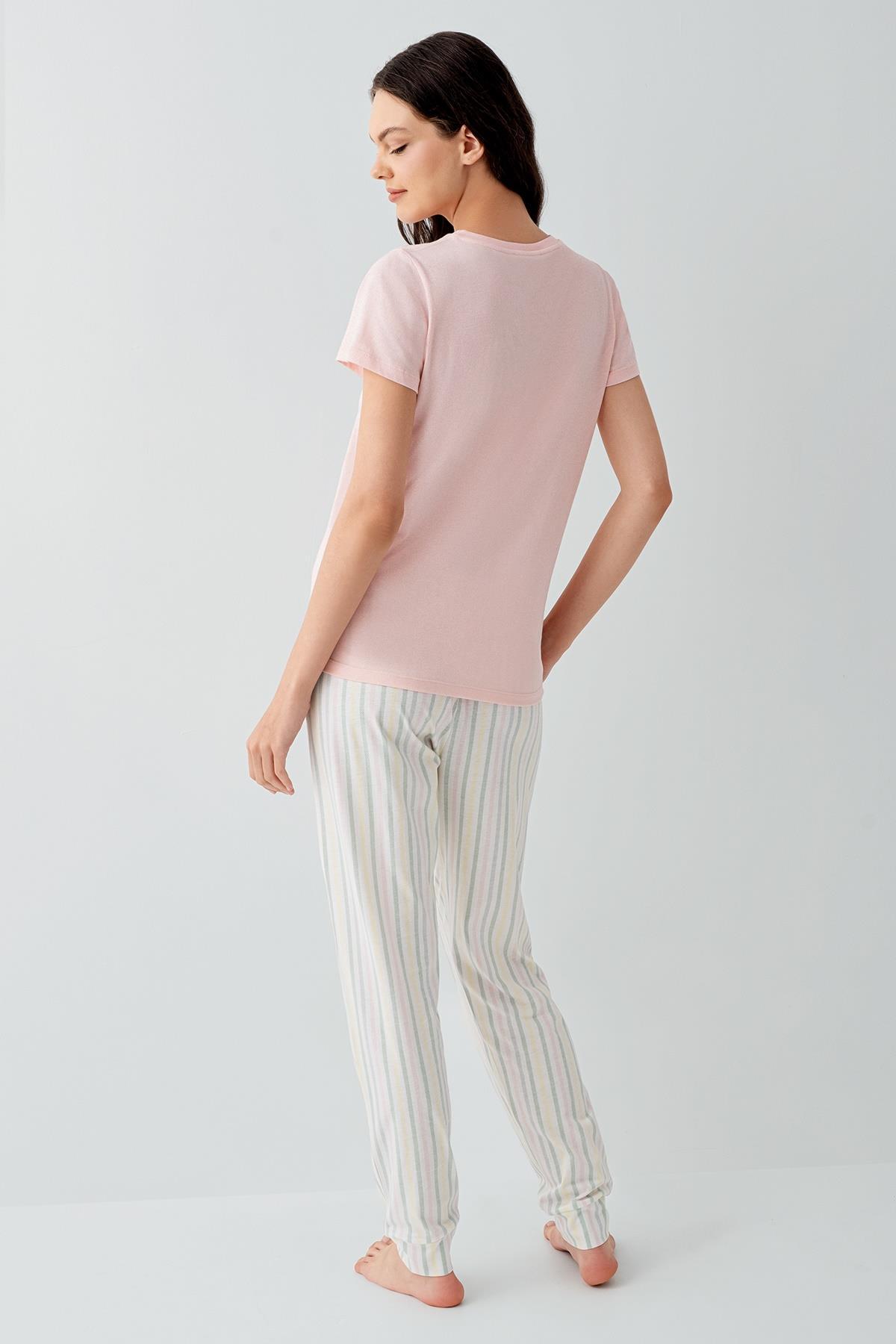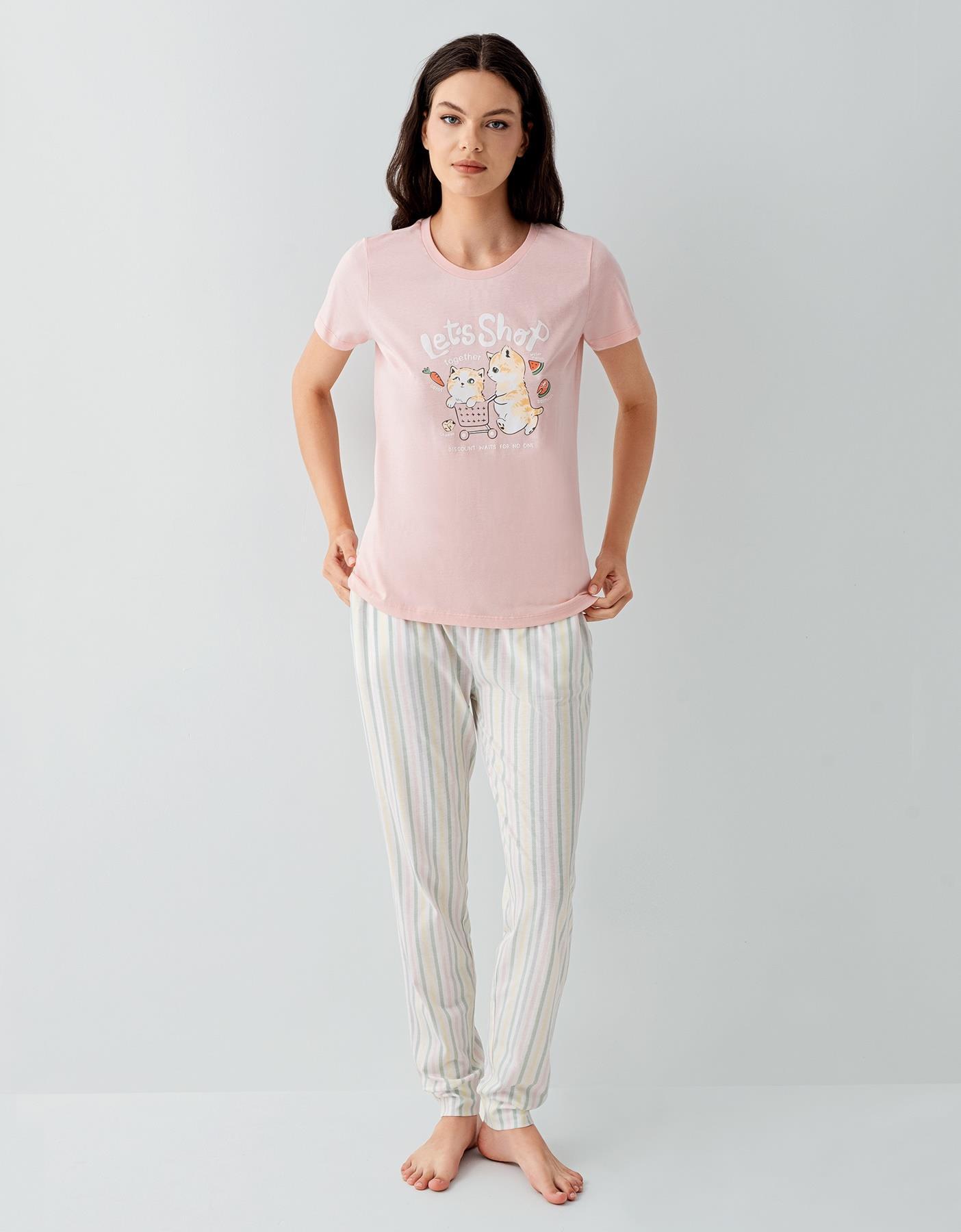 Anne ve kızlar için özel olarak tasarlanan bu pijama takımı, yumuşak dokusu ve neşeli tasarımıyla evde geçirilen anları daha keyifli hale getirir. Üst kısmı kısa kollu tişört, alt kısmı ise çizgili pantolondan oluşan bu takım, hem rahat hem de şık bir kullanım sunar.