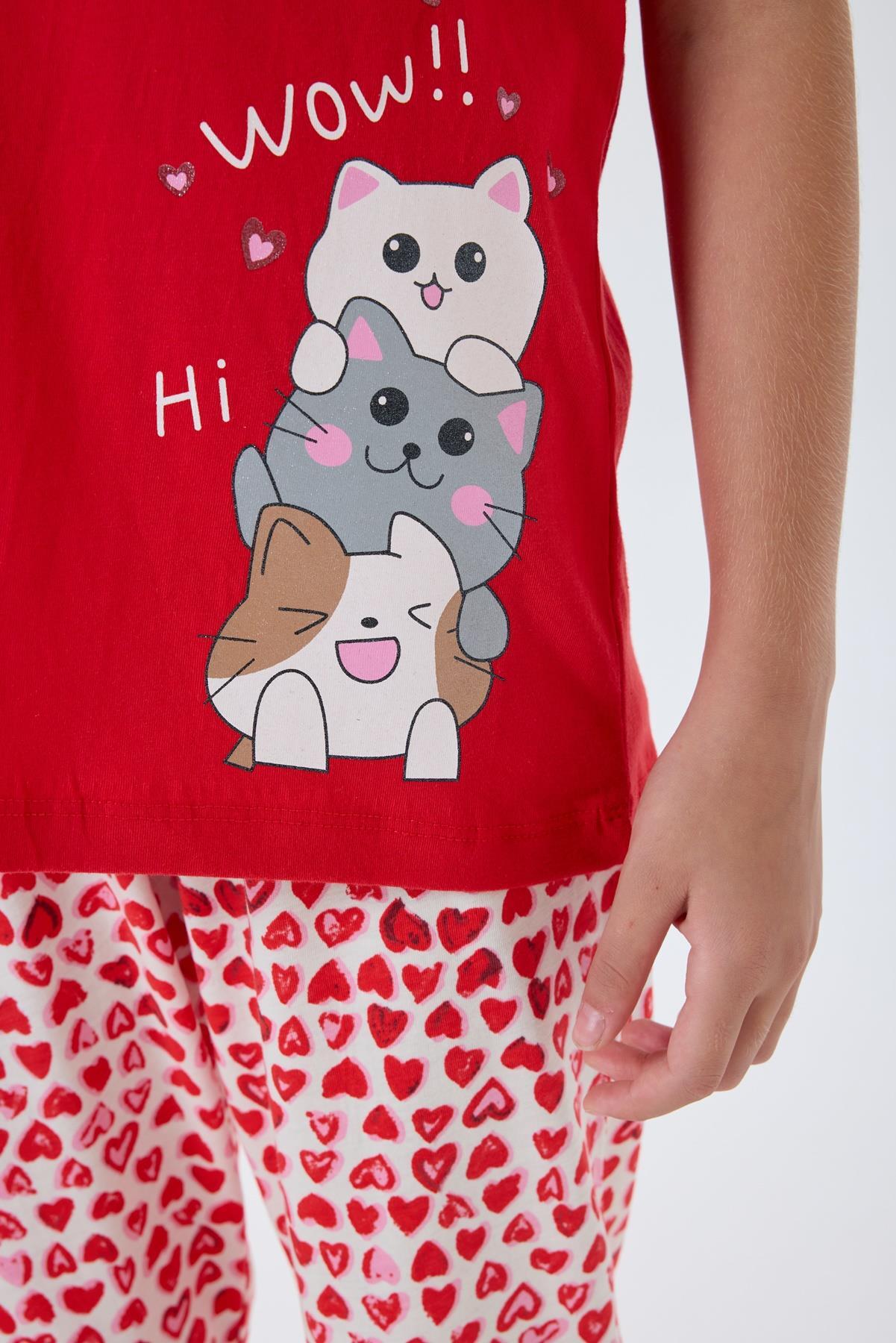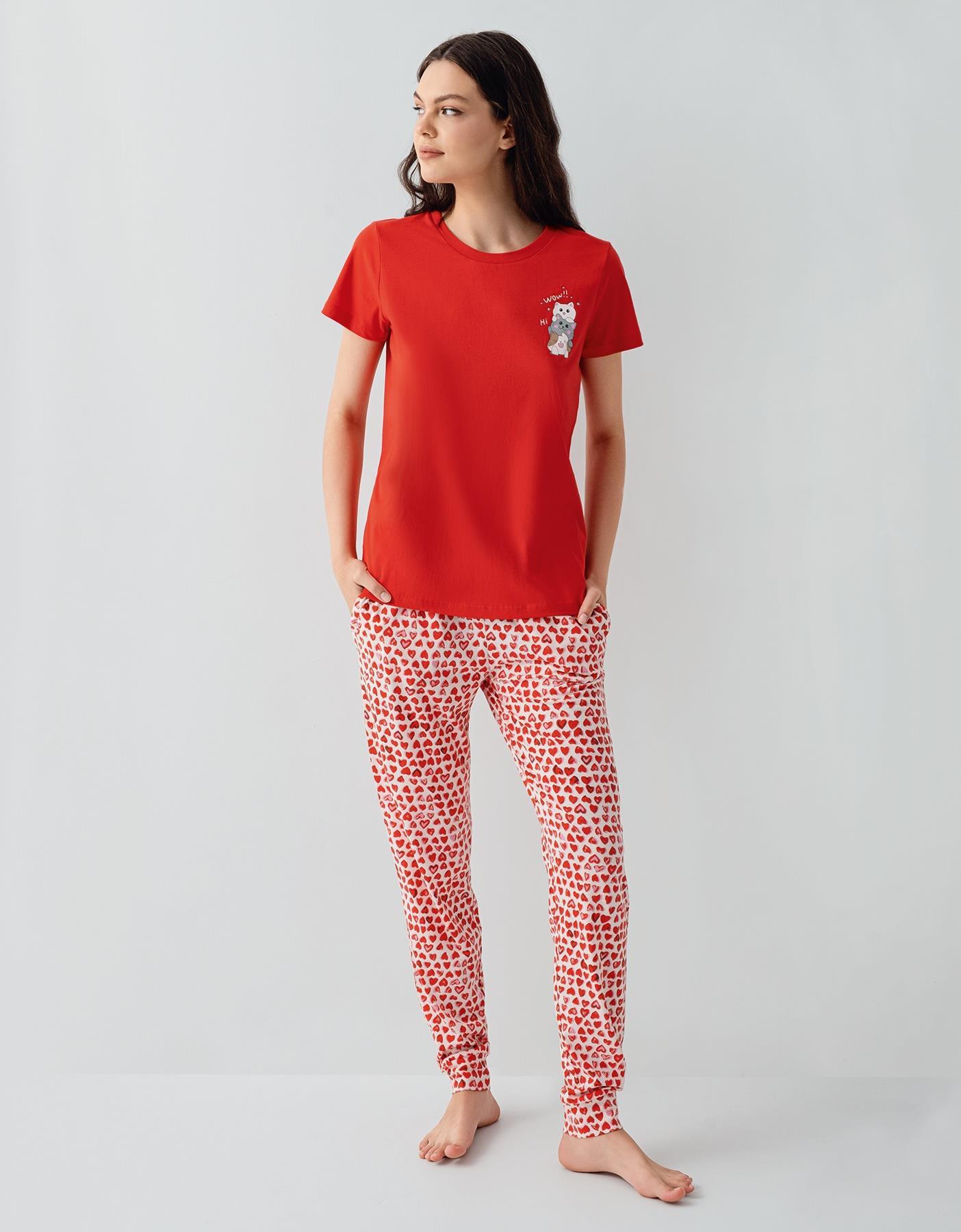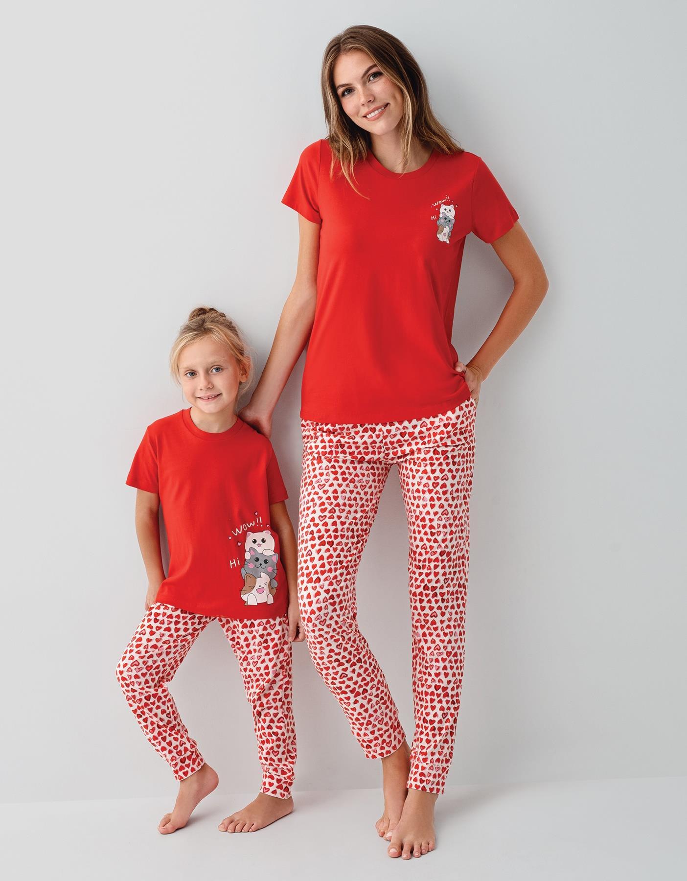 Anne Kız Pijama Takımı Kombini – %100 Pamuk, Kırmızı Kalpli Desen, Anne ve Çocuk Pijamaları Ayrı Ayrı Satılır