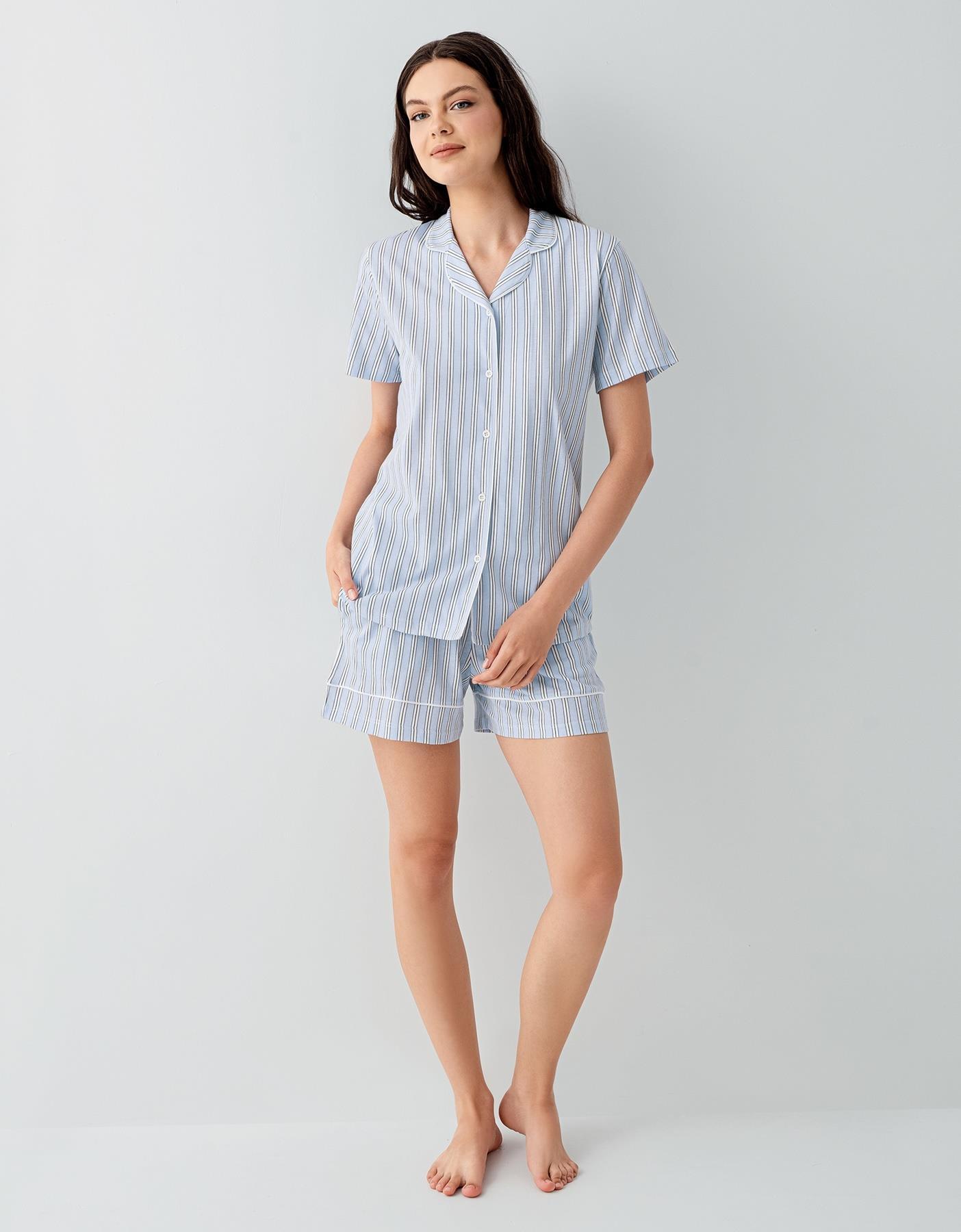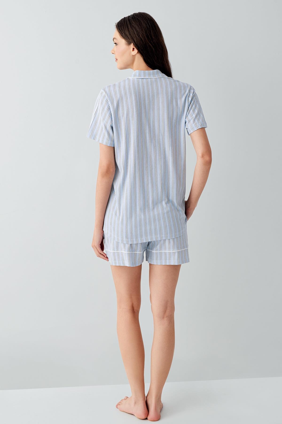 Modern dikey çizgili deseni, klasik düğmeli yaka detayı ve kısa kollu üst formu ile hem şık hem de konforlu bir kullanım sunar. Şortlu alt tasarımı hareket özgürlüğü sağlarken, evde gün boyu rahat hissetmenizi destekler.