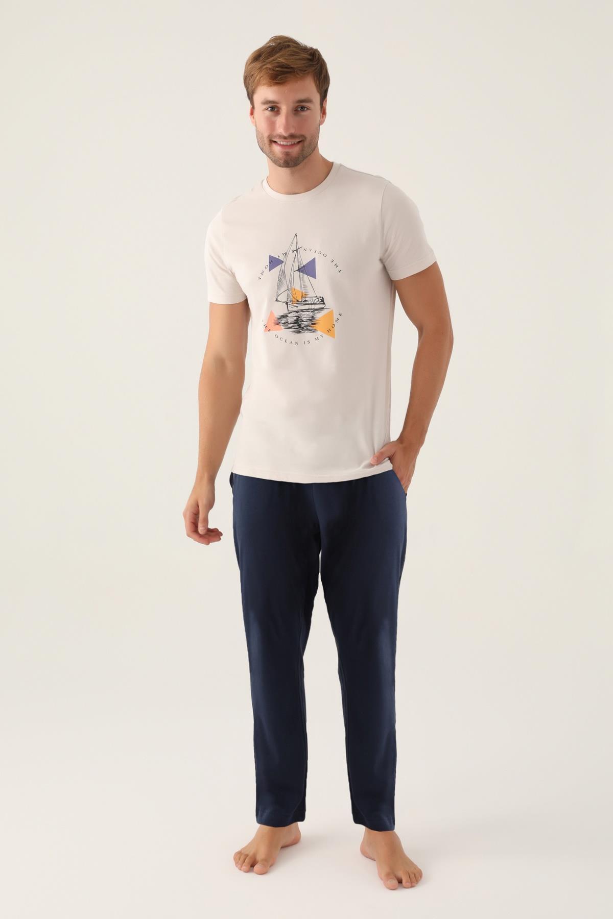 Erkek %100 Pamuk Pijama Takımı – Kısa Kollu T-Shirt & Uzun Pijama Altı