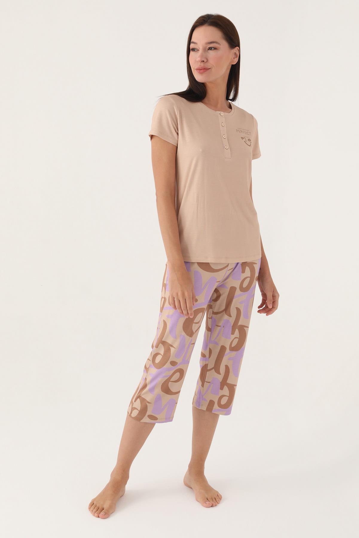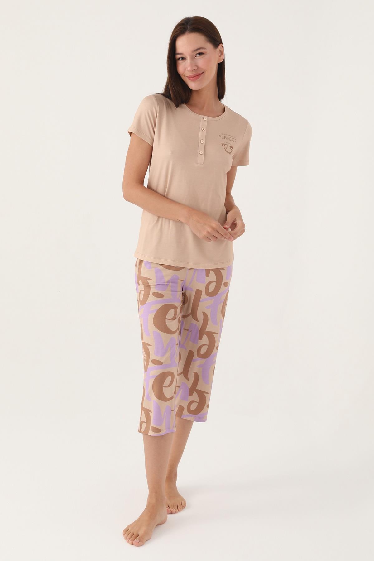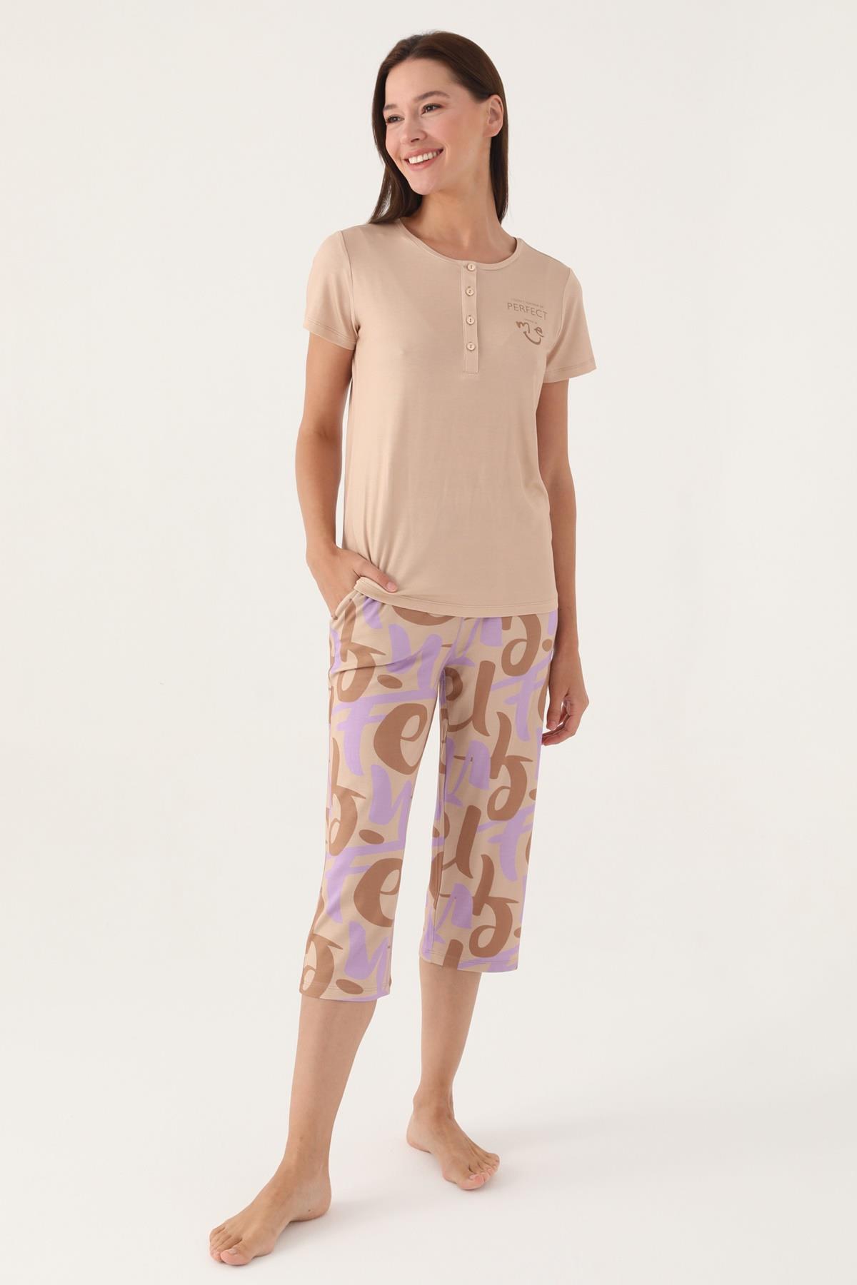 Arnetta Düğmeli Yaka Kısa Kol Kapri Takım, Büyük Beden Kapri, %100 Pamuk