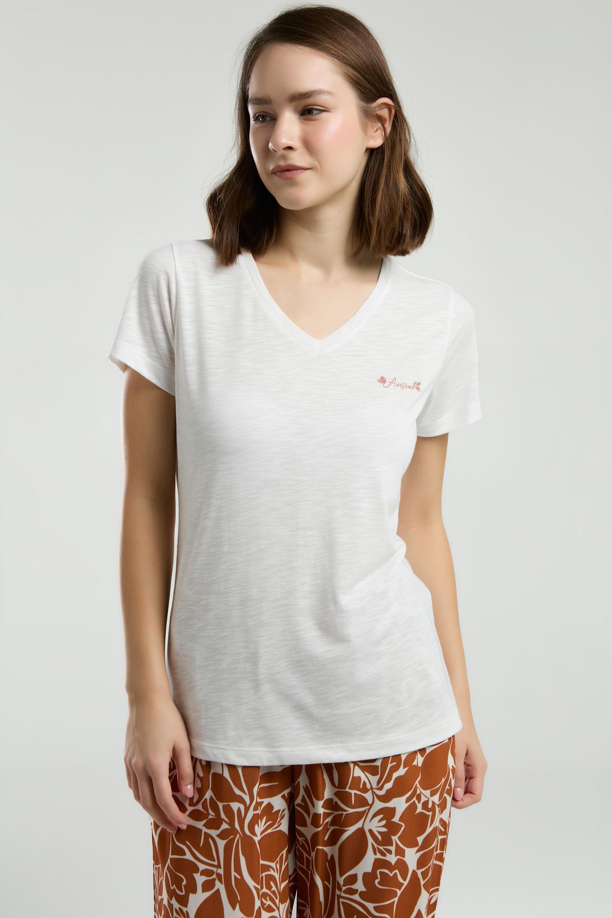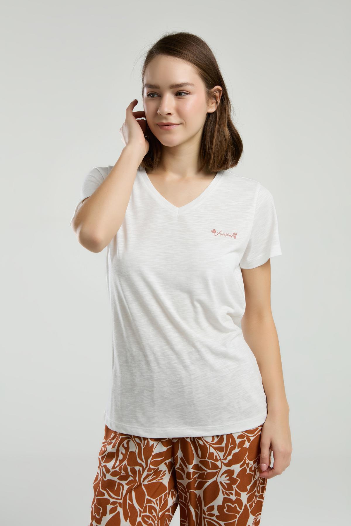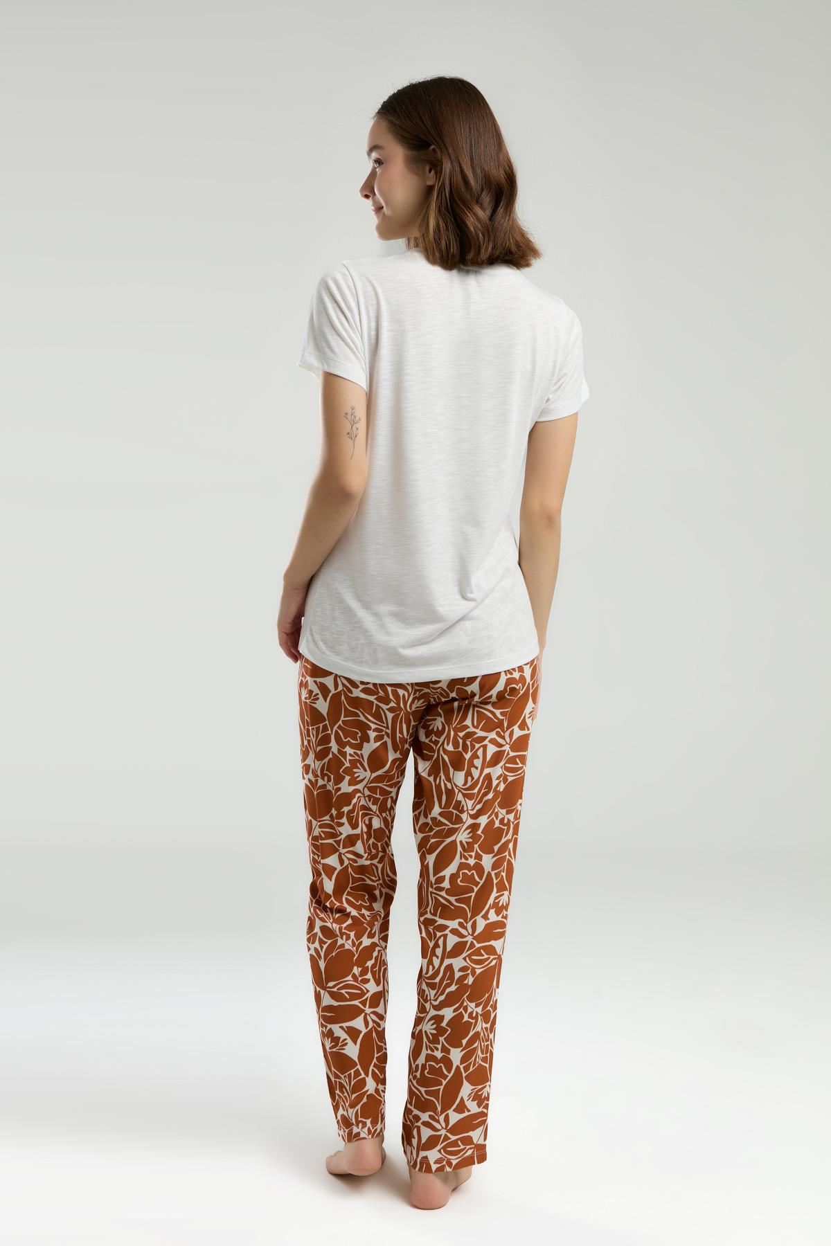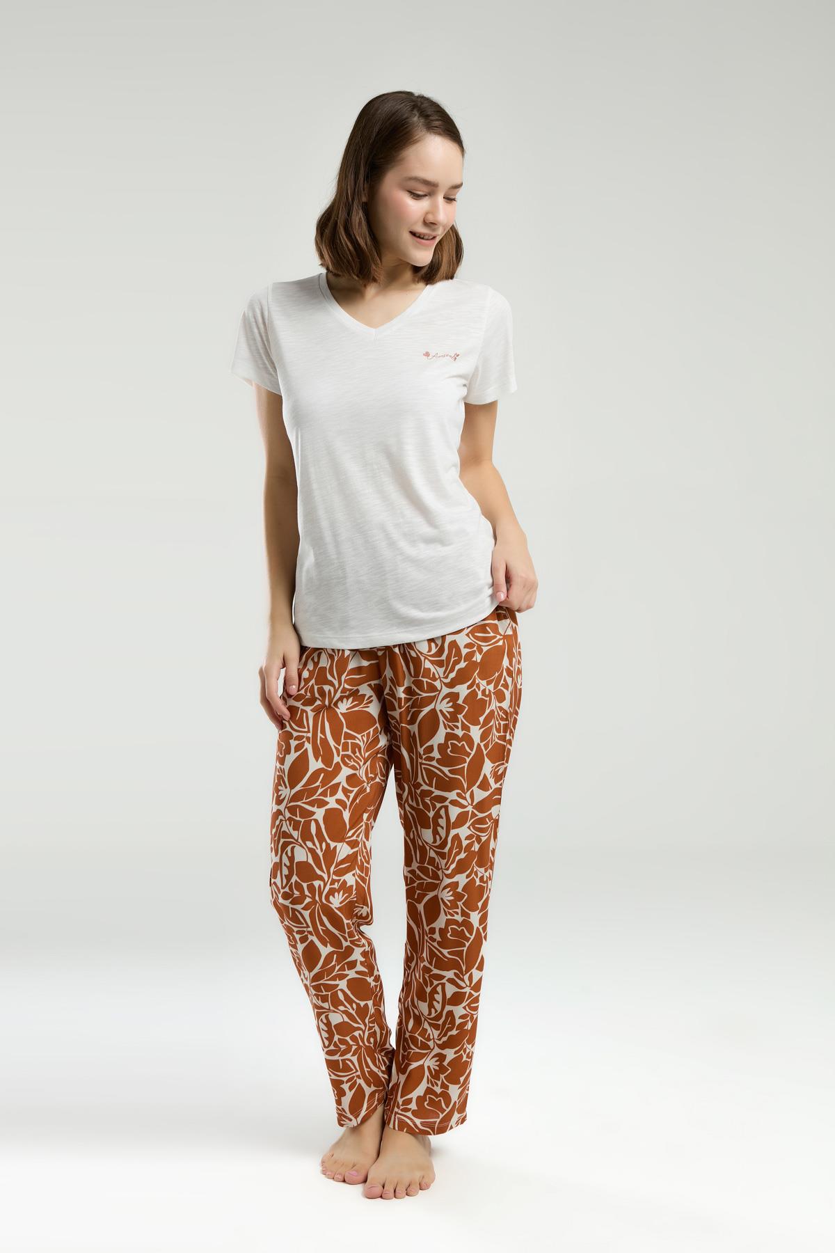 Arnetta Üst Düz Krem Alt Desenli Kahverengi Yazlık Pijama Takım, Dep Detaylı