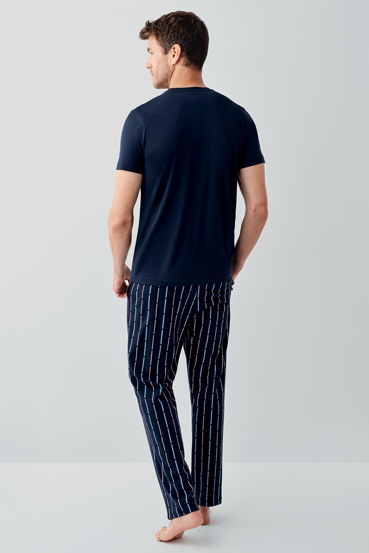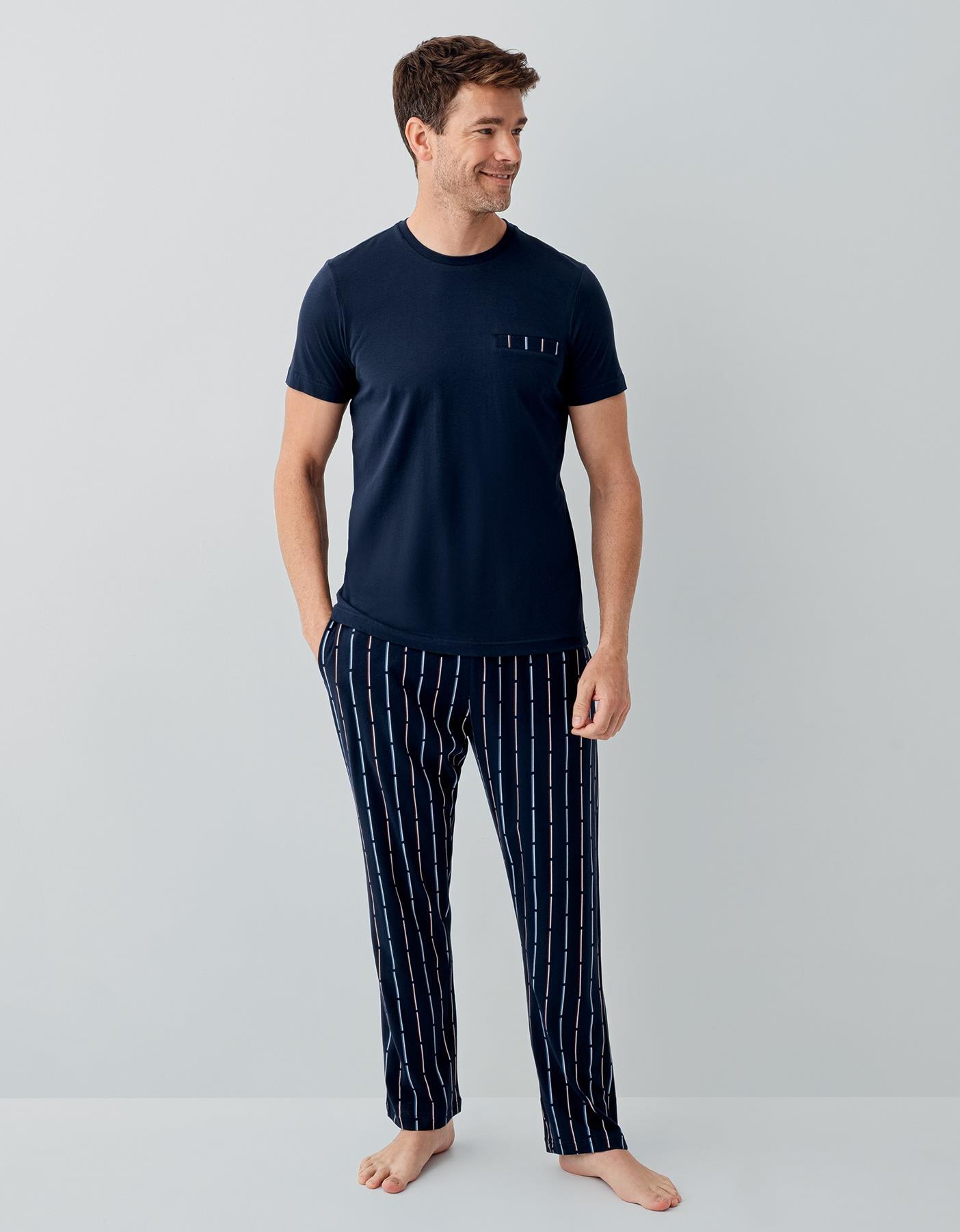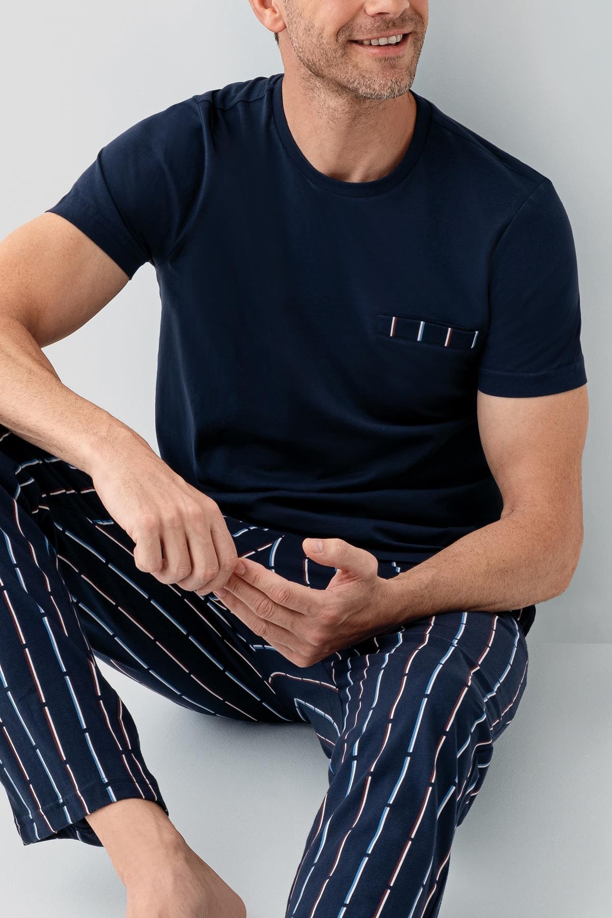 Erkek Lacivert %100 Pamuk Kısa Kollu Pijama Takımı – Çizgili Cepli Alt, Düz Renk Üst, Rahat Kesim