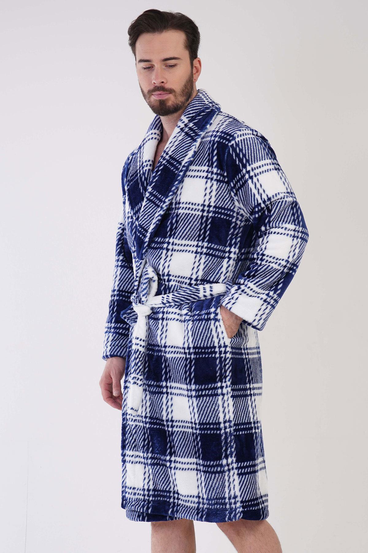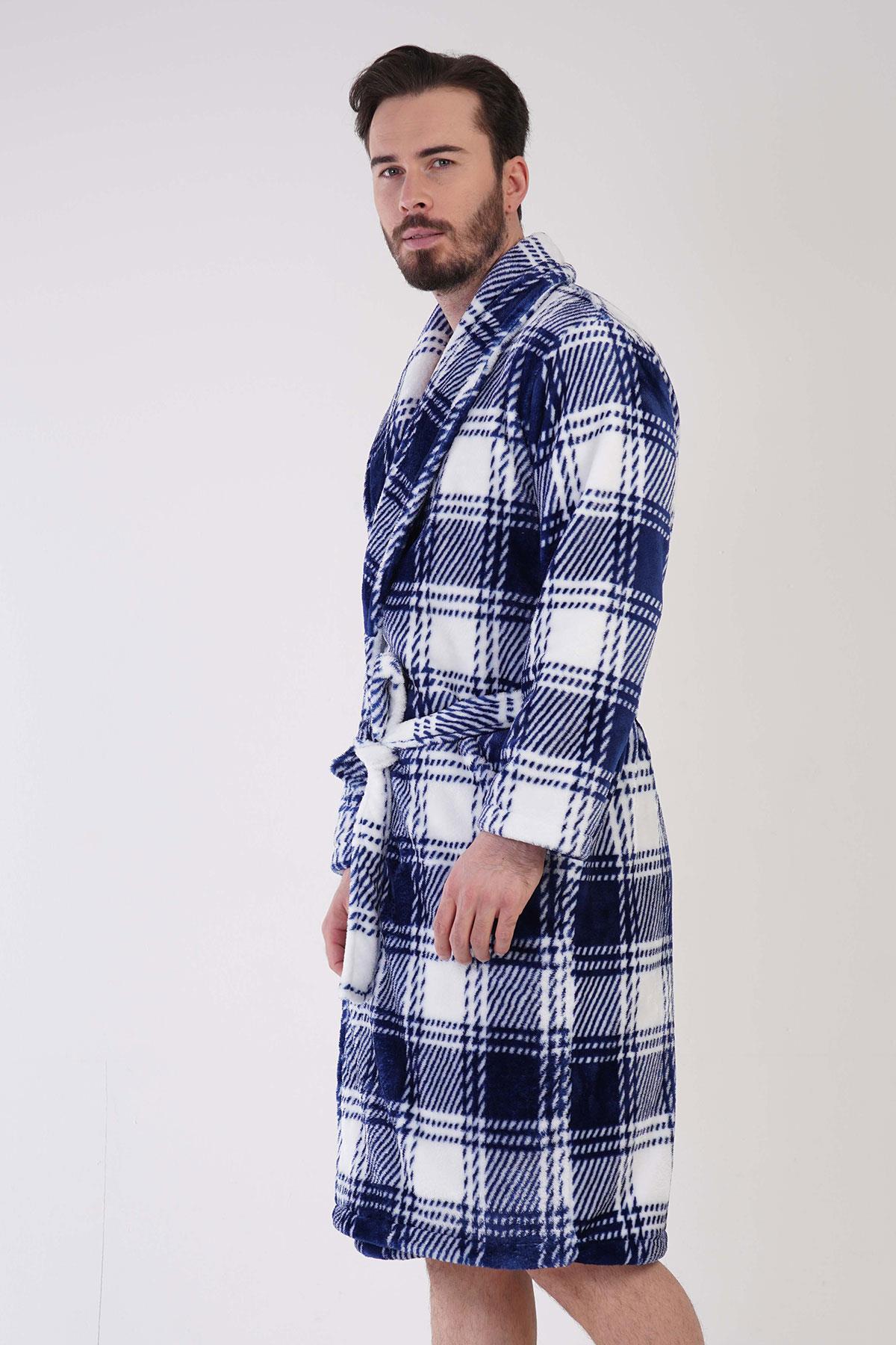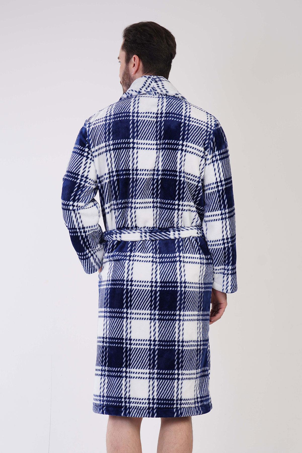 Erkek Mavi Süper Yumuşak Ekoseli Vienetta Welsoft Şal Yaka Uzun Kol Cepli Polar Sabahlık