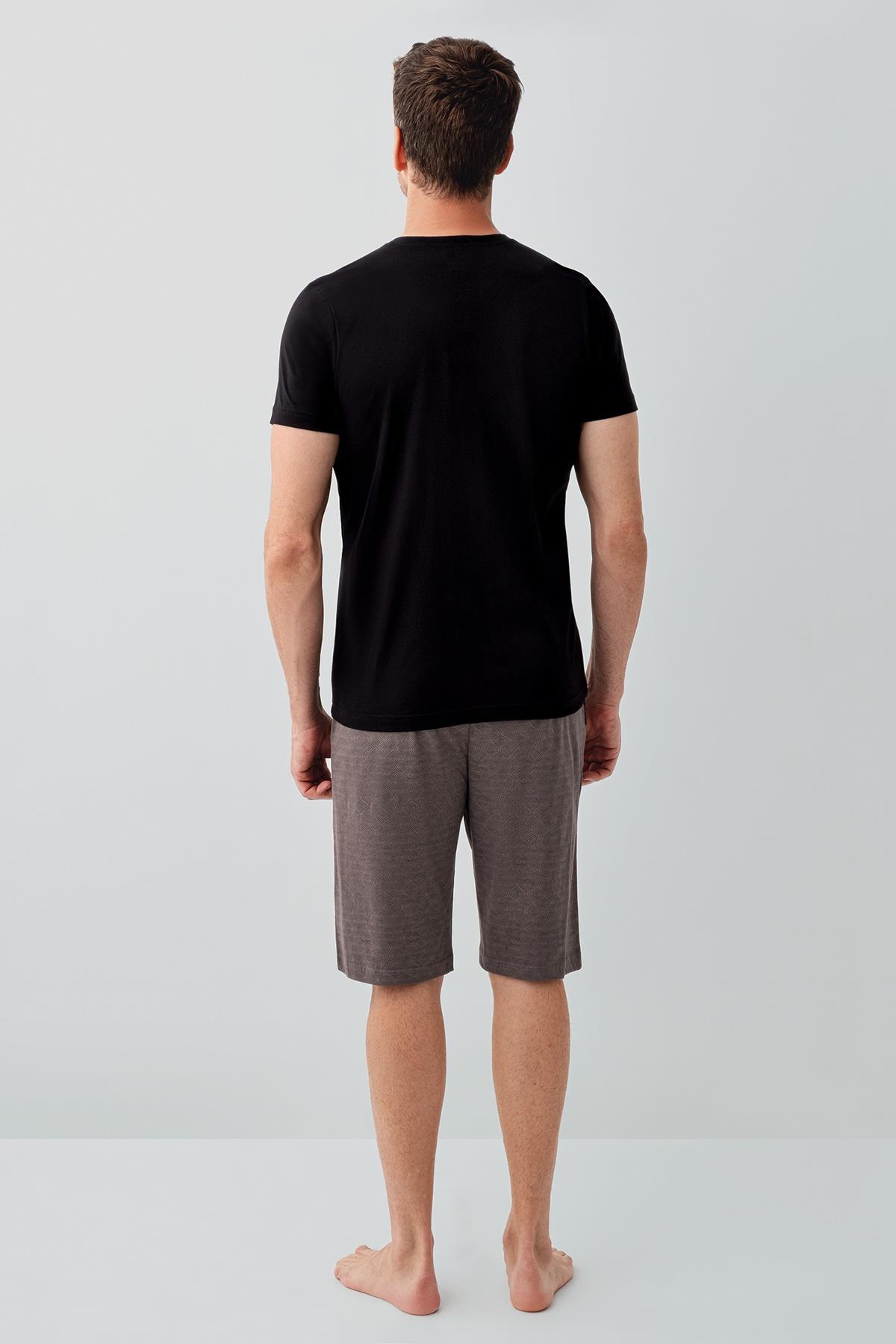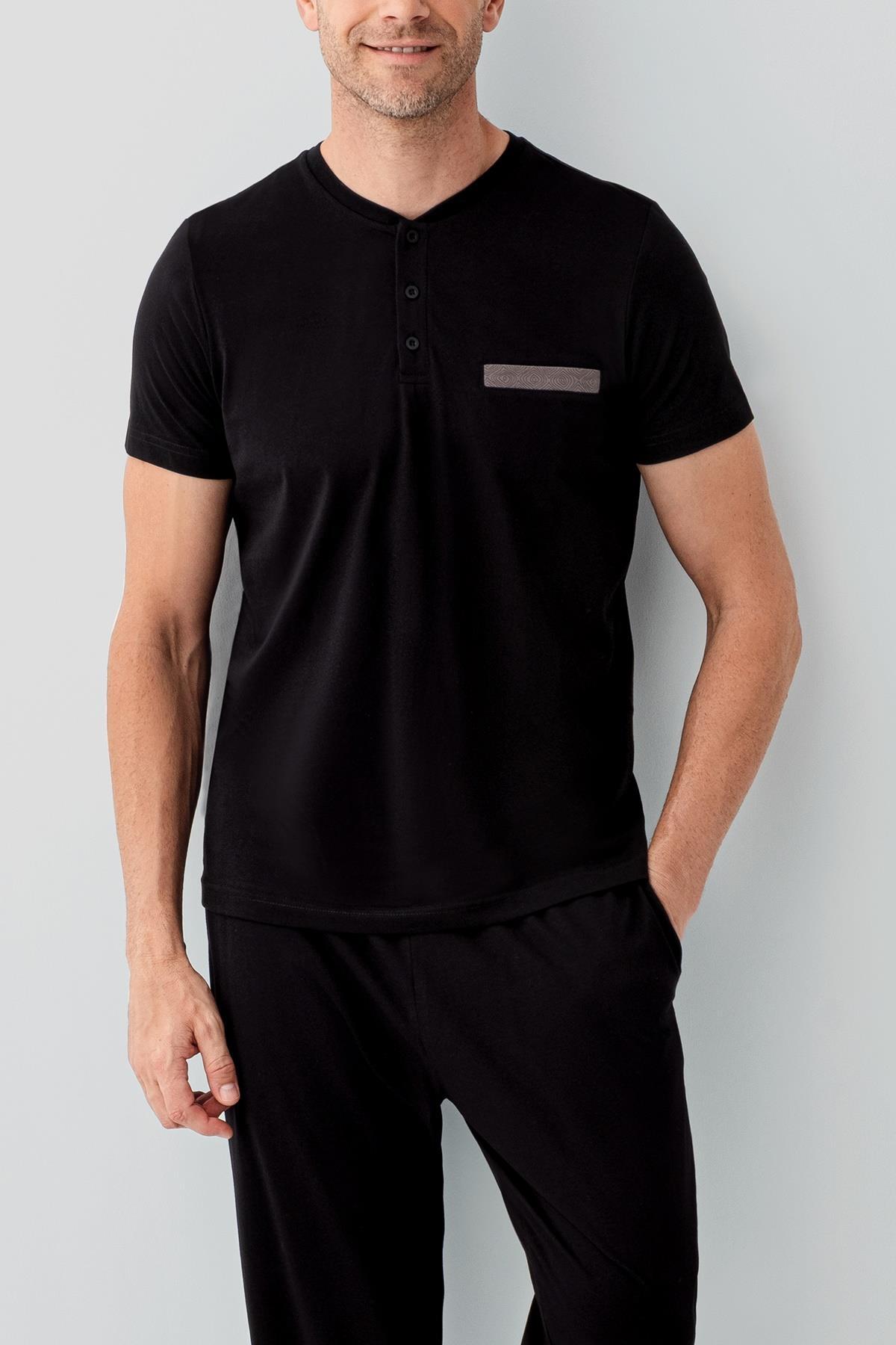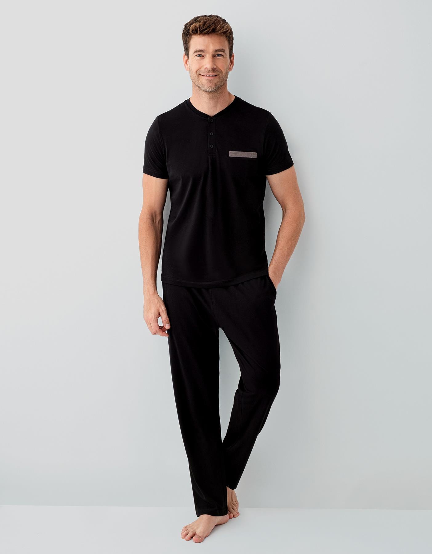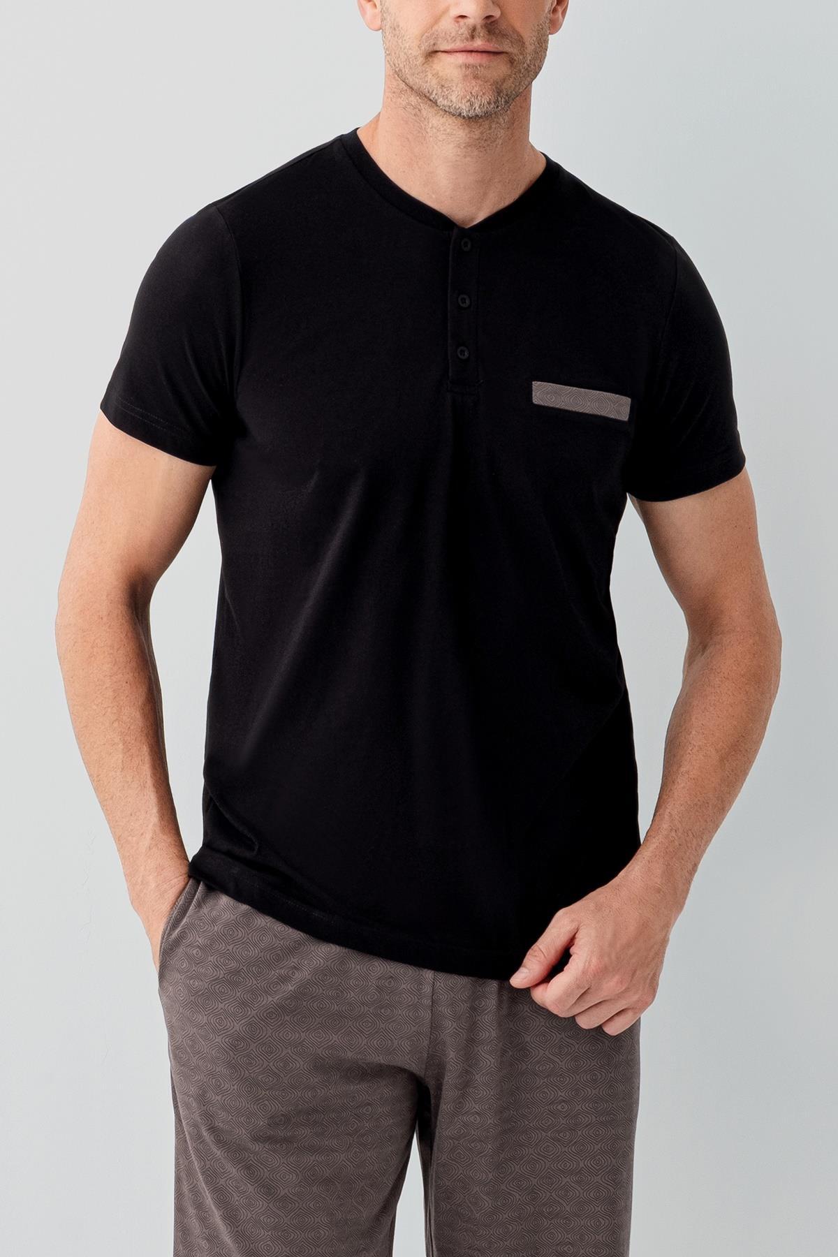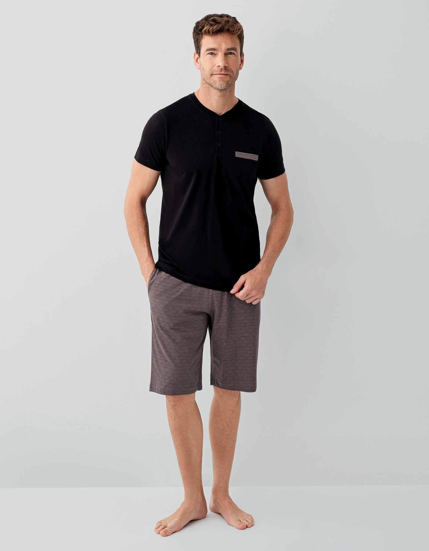 Erkek Siyah Kutulu 3’lü %100 Pamuk Pijama Takımı – Kısa Kollu Düğmeli Üst & Cepli Uzun Alt, Cepli Şort Set