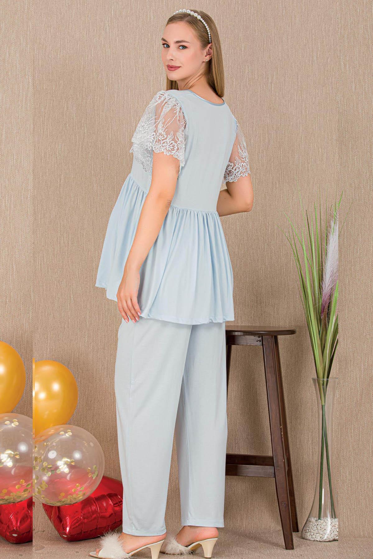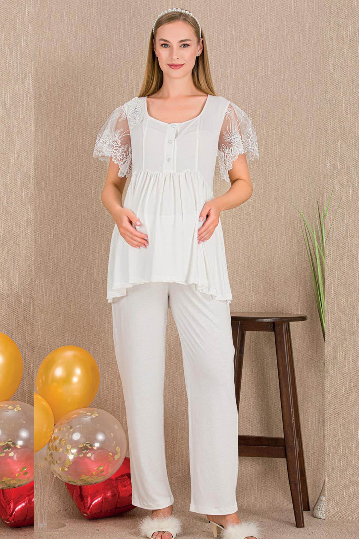 Kadın 2'li Kısa Kol Hamile Lohusa Pijama Takım, Kolları tül Dantel Detay, Emzirme Düğmeli