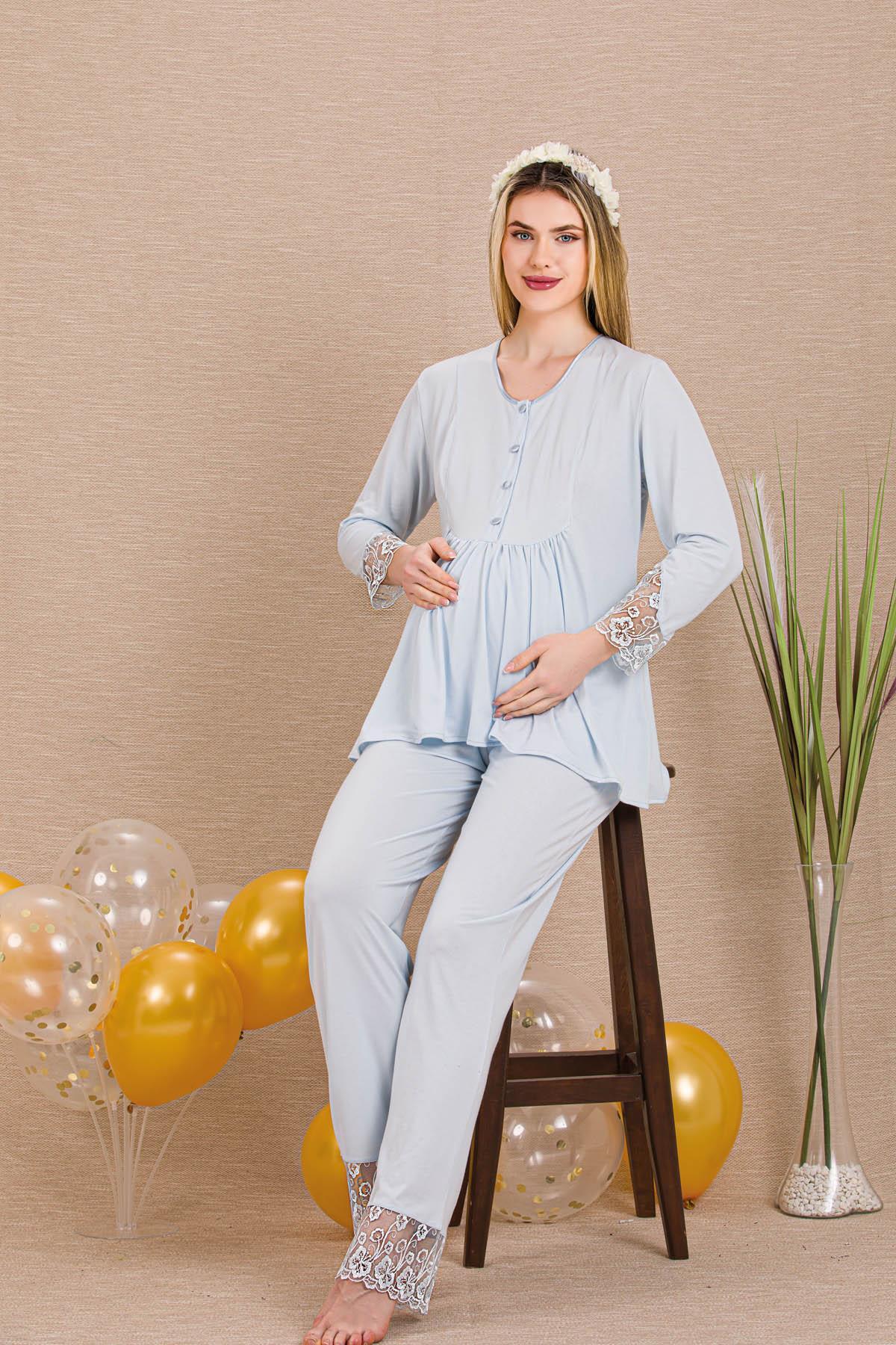 Kadın 2'li Uzun Kol Hamile Lohusa Pijama Takım, Emzirme Düğmeli, Bilek ve Paça Dantel Detaylı
