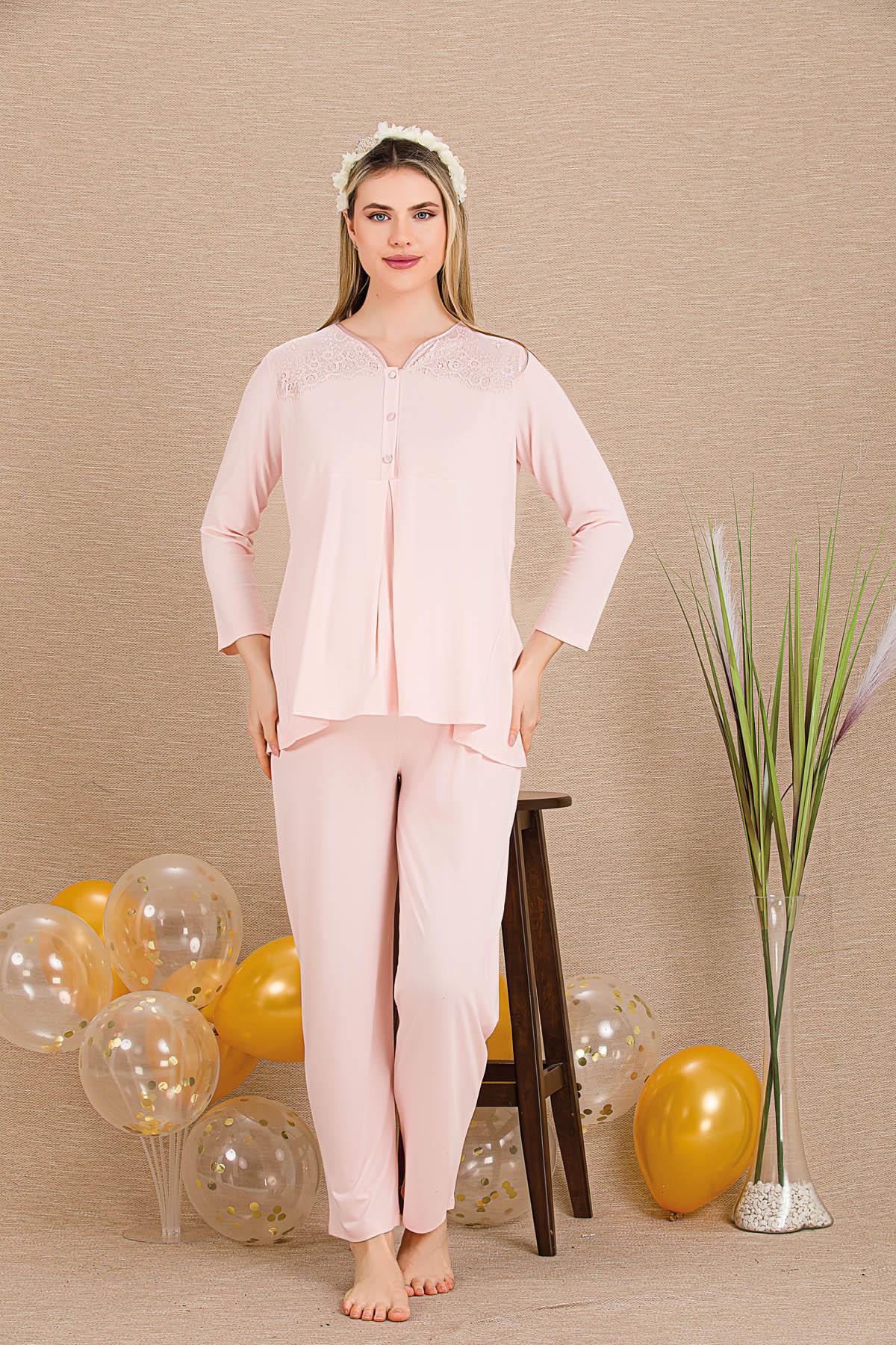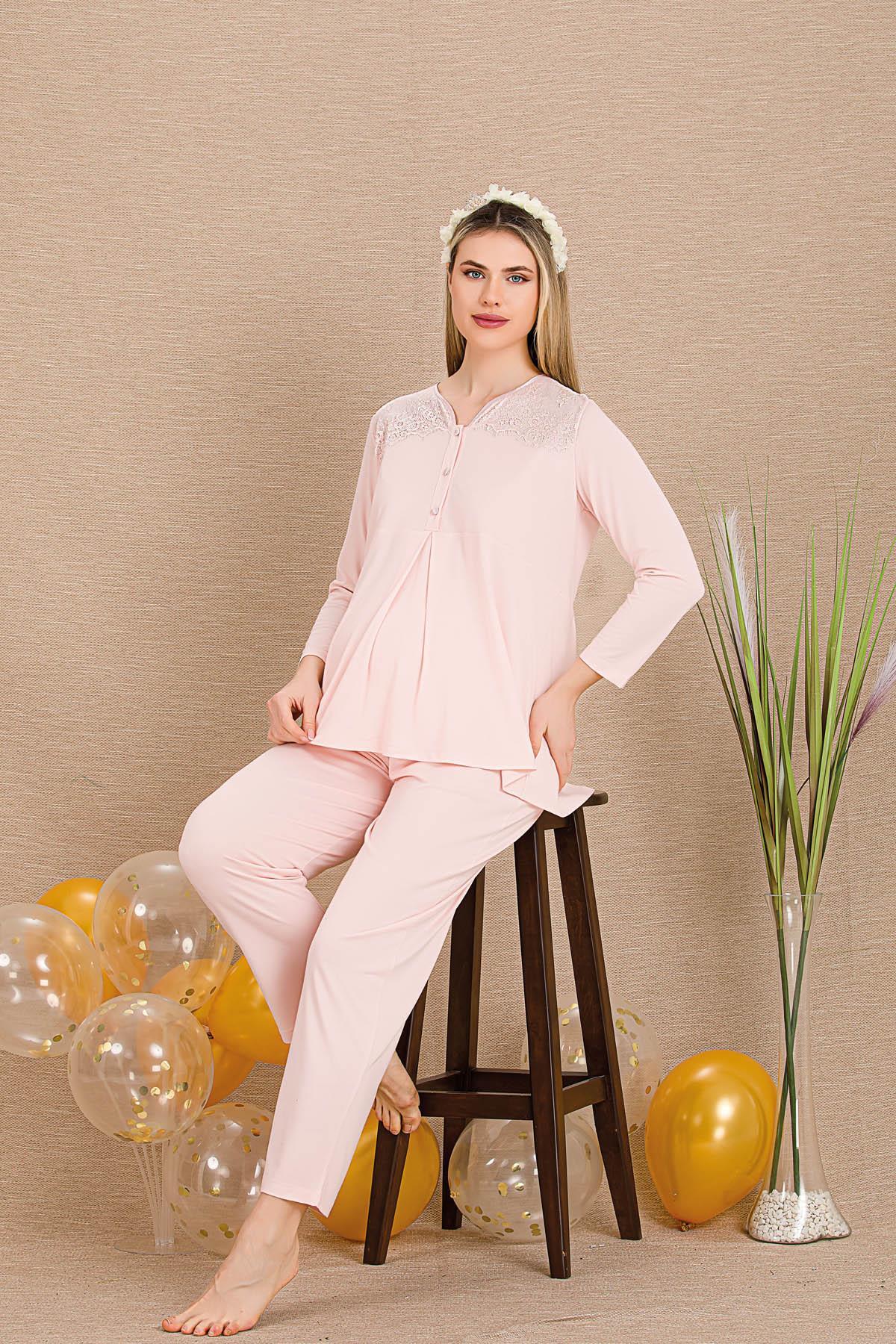 Kadın 2'li Uzun Kol Hamile Lohusa Pijama Takım, Emzirme Düğmeli, Bilek ve Paça Dantel Detaylı