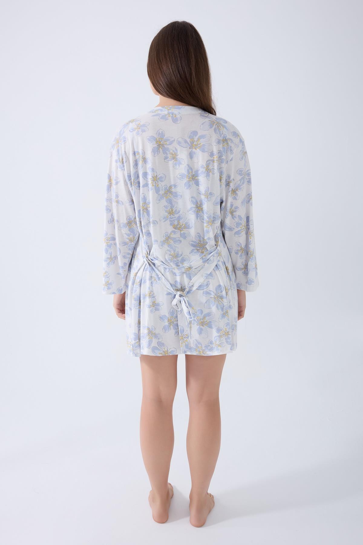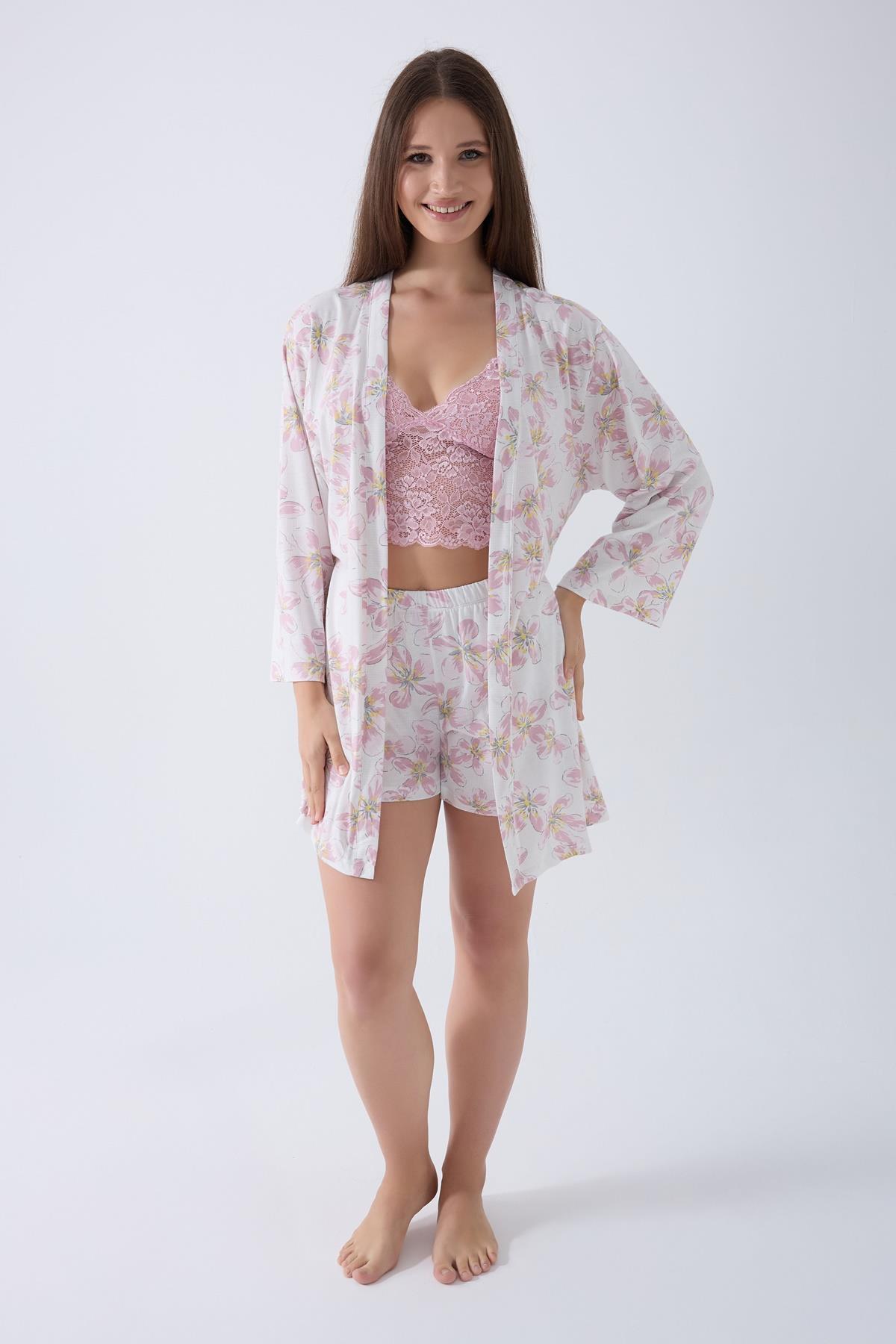 %50 Pamuk %50 Modal kumaşıyla hafif ve konforlu kadın 3’lü dantelli şort pijama ve sabahlık seti. Şık, nefes alan ve rahat tasarım.