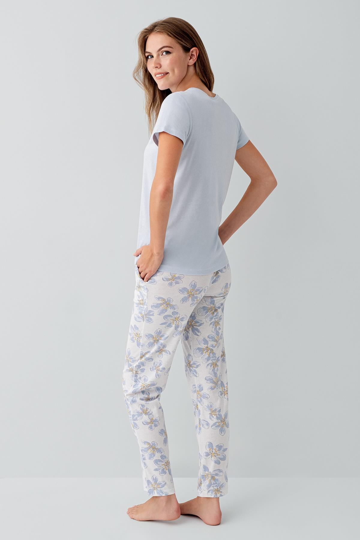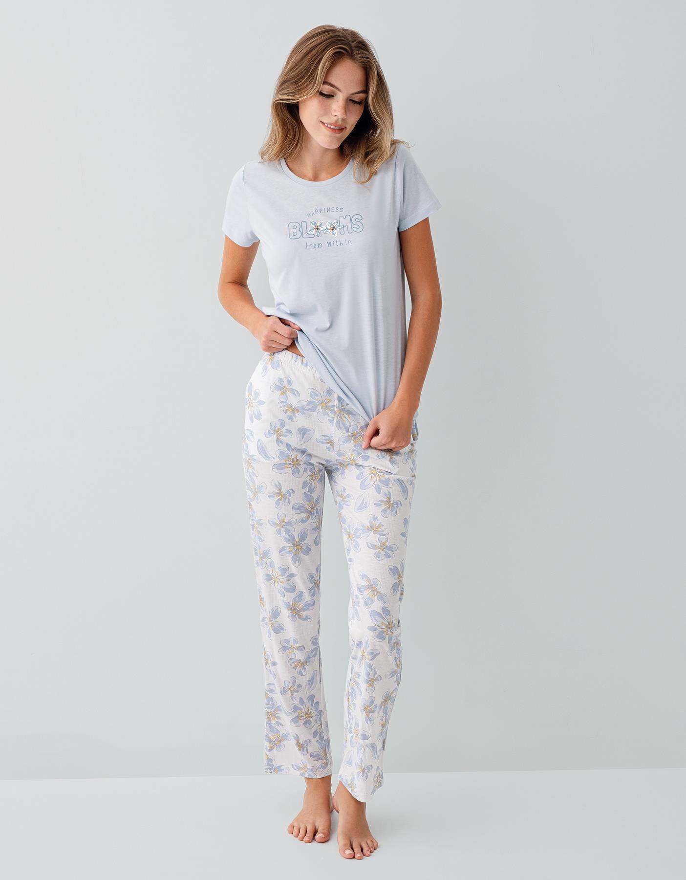 Baskılı kısa kollu üst parça sade ve modern bir görünüm sağlarken, çiçek desenli uzun paçalı alt parça rahat kesimiyle hareket özgürlüğü sunar. Hafif ve dökümlü yapısı sayesinde hem uyku sırasında hem de ev içinde keyifle kullanılabilir.