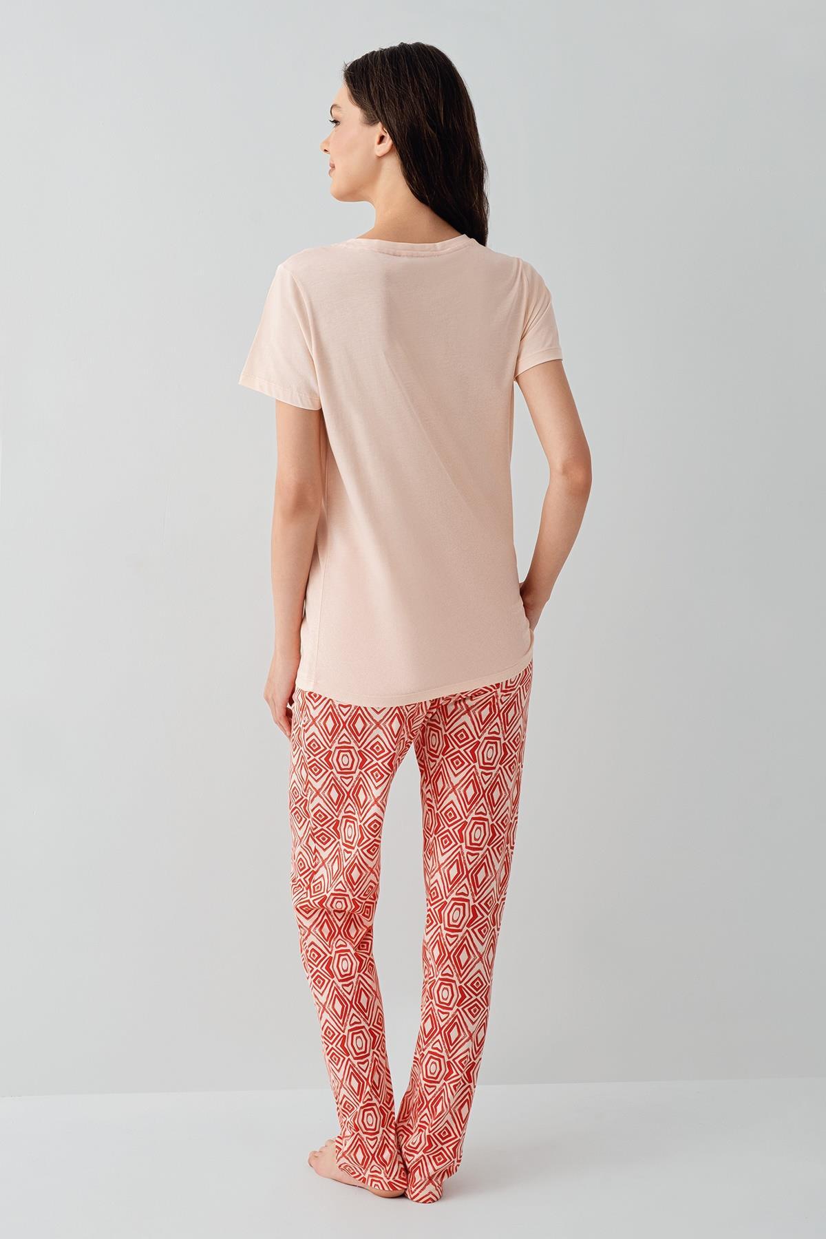 Kadın %50 Pamuk %50 Modal Kısa Kollu Pijama Takımı – Yumuşak Dokulu, Desenli Alt, Rahat Kalıp