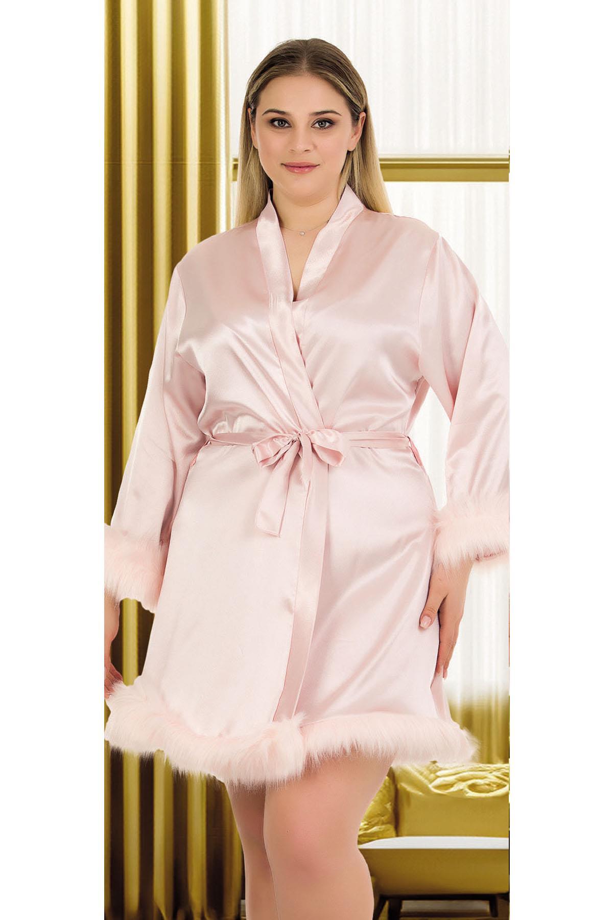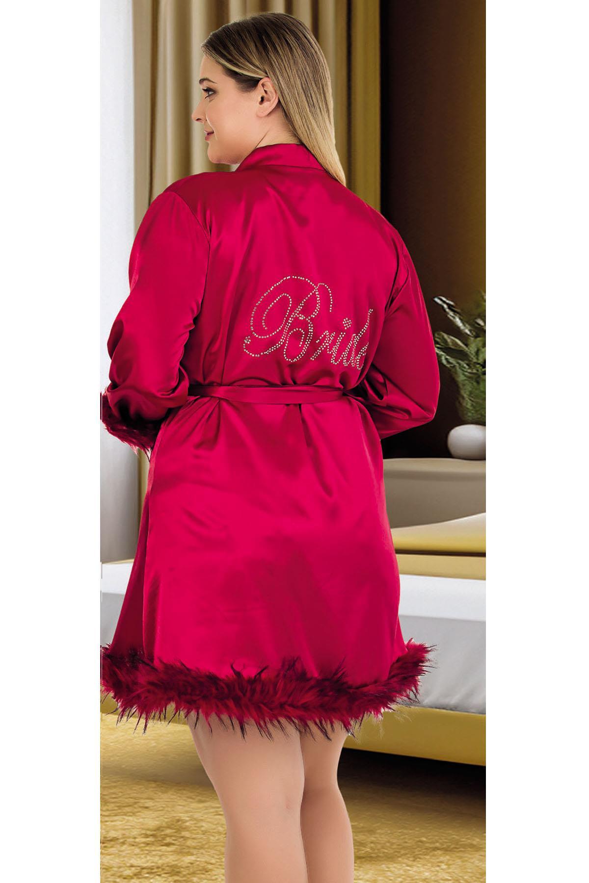 Kadın Büyük Beden Düz Renk Tüylü Saten Bride Sabahlık