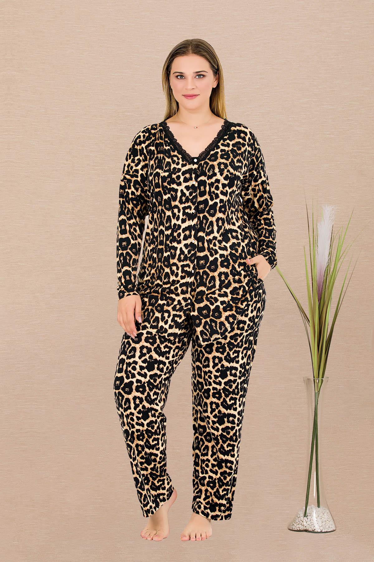 Kadın Büyük Beden Leopar Desenli Ev Giyim Pijama Takım, Uzun kollu, Boydan Düğmeli, viskon kumaş