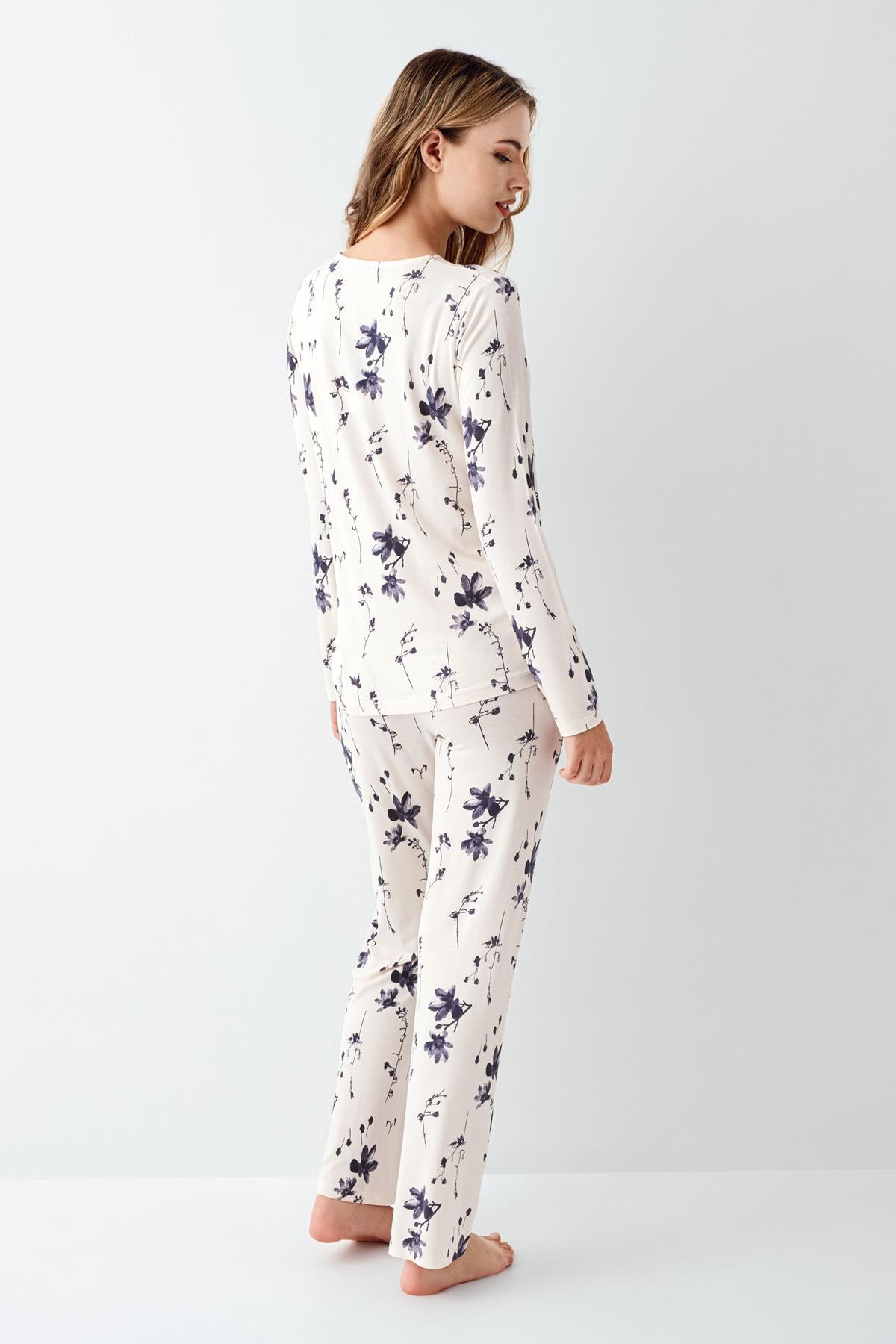 Kadın Çiçek Desenli Uzunkol Pijama Takım, Dantel detaylı