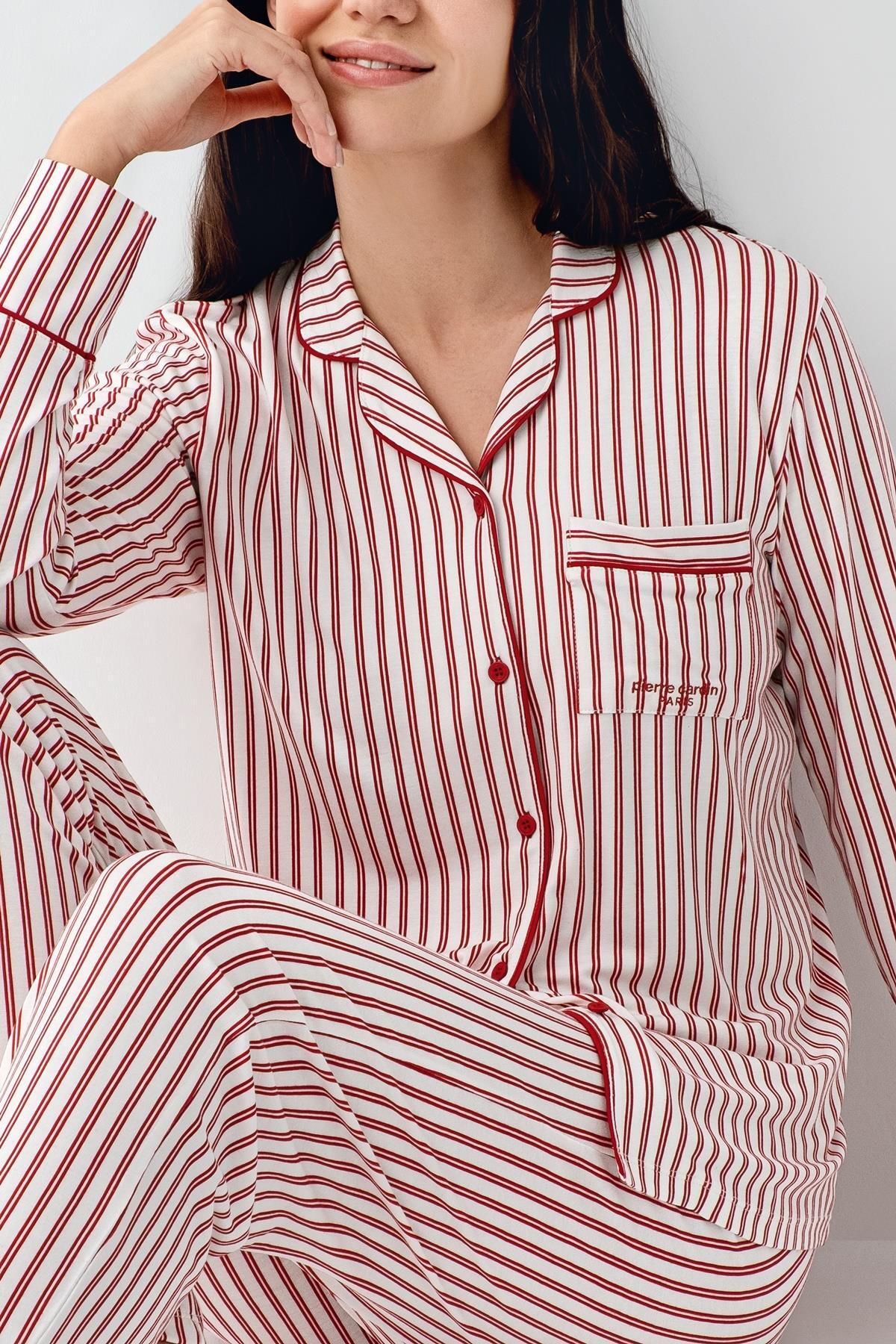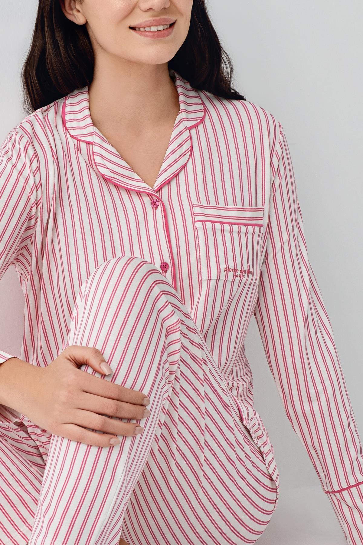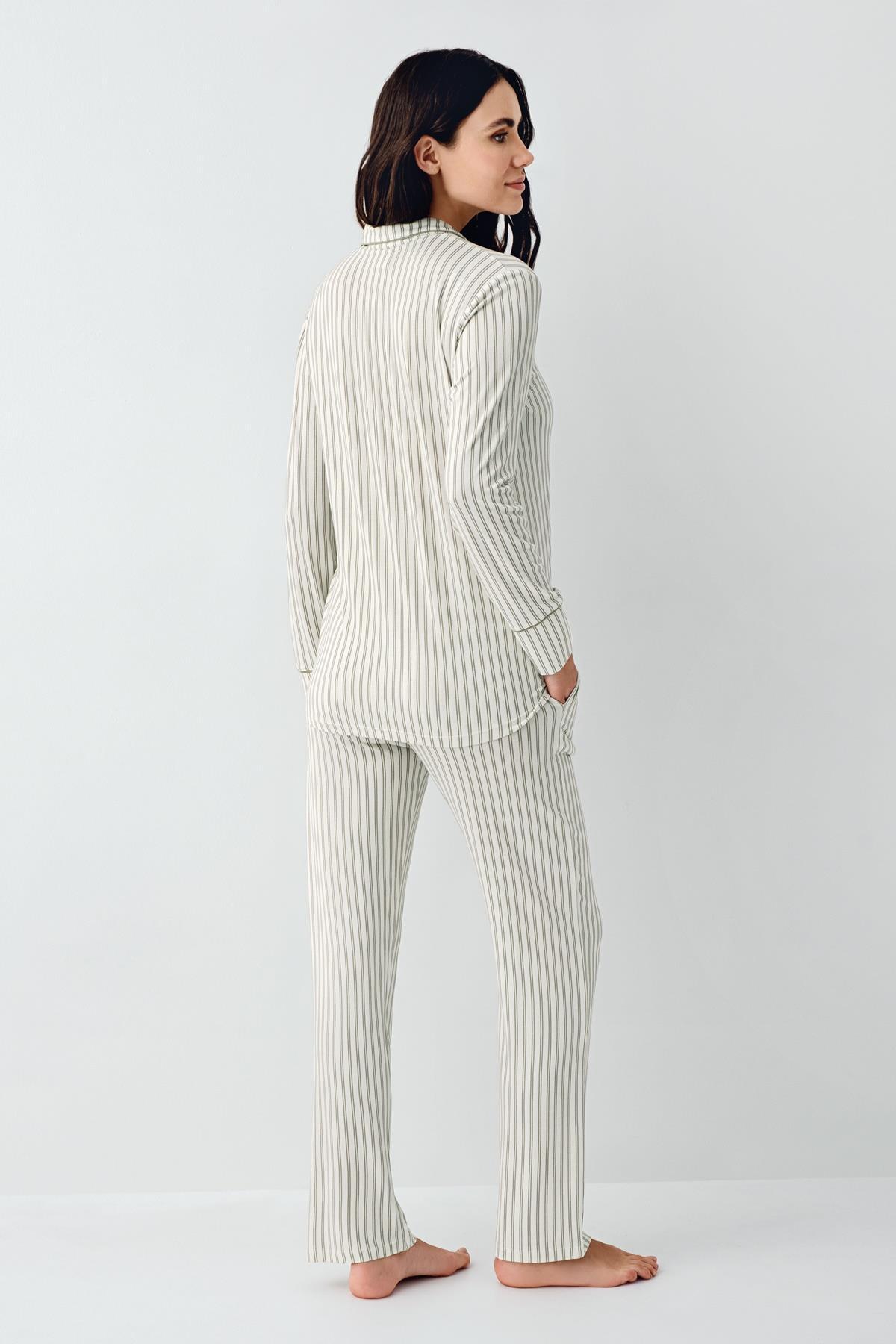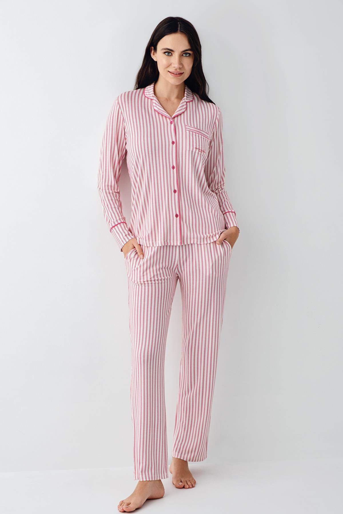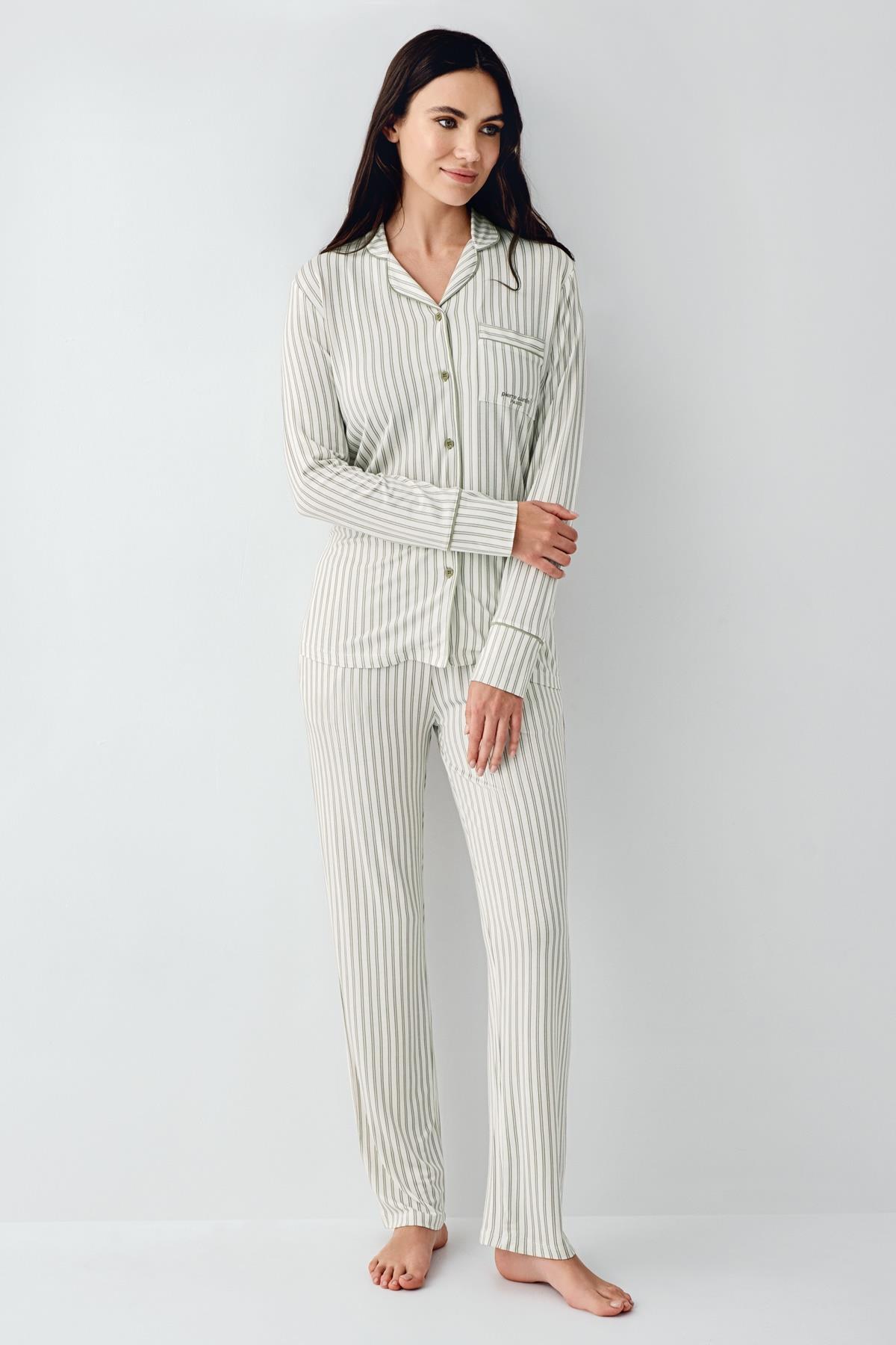 Kadın Çizgili Önden Düğmeli Pijama Takım, %50 Modal %50 Pamuk Gömlek Pijama Takım