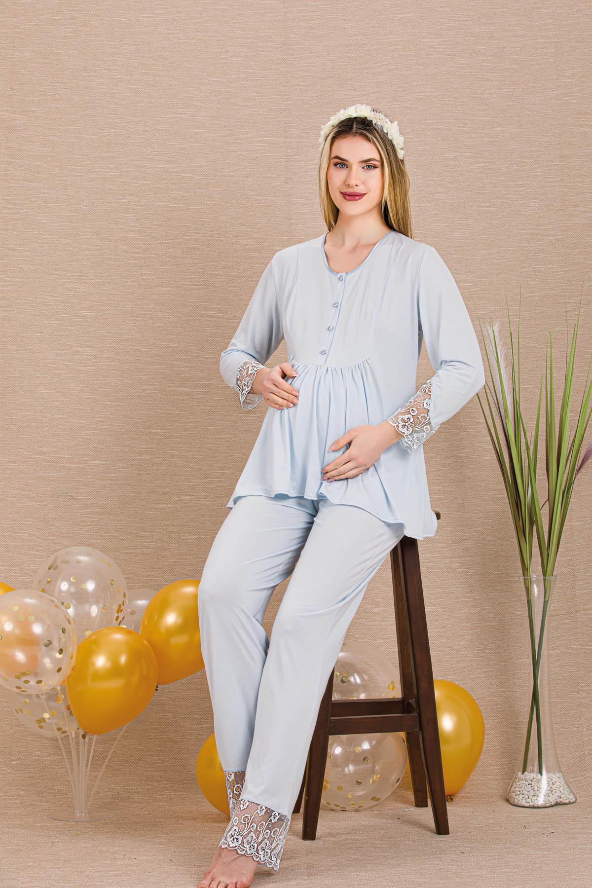 Kadın Tül Güpür Detay 3'lü Hamile Lohusa Pijama Takım, Uzun Hamile Lohusa Sabahlık ve Pijama Takımı