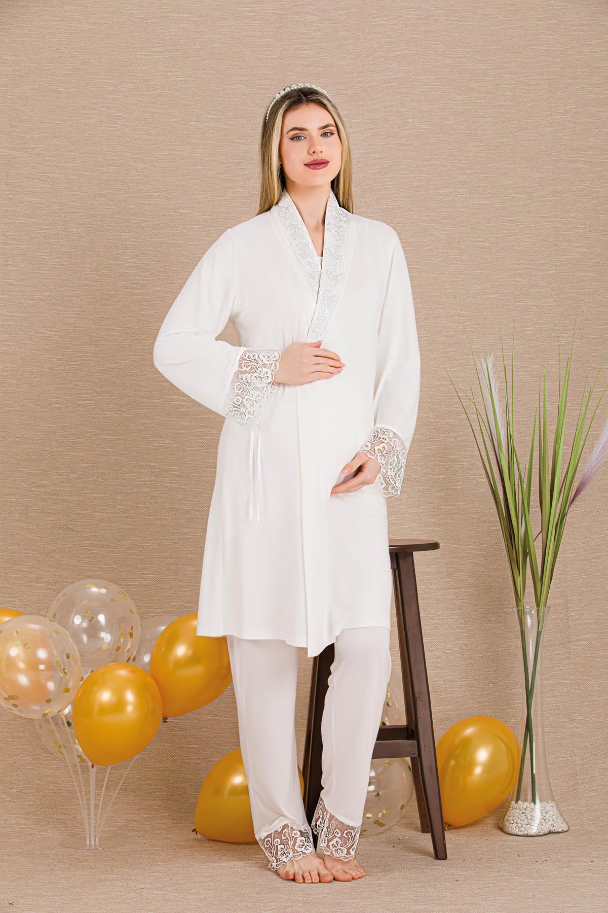 Kadın Dantel Detaylı 3'lü Hamile Lohusa Pijama Takım, Hamile Lohusa Uzun Sabahlık ve Pijama Takımı