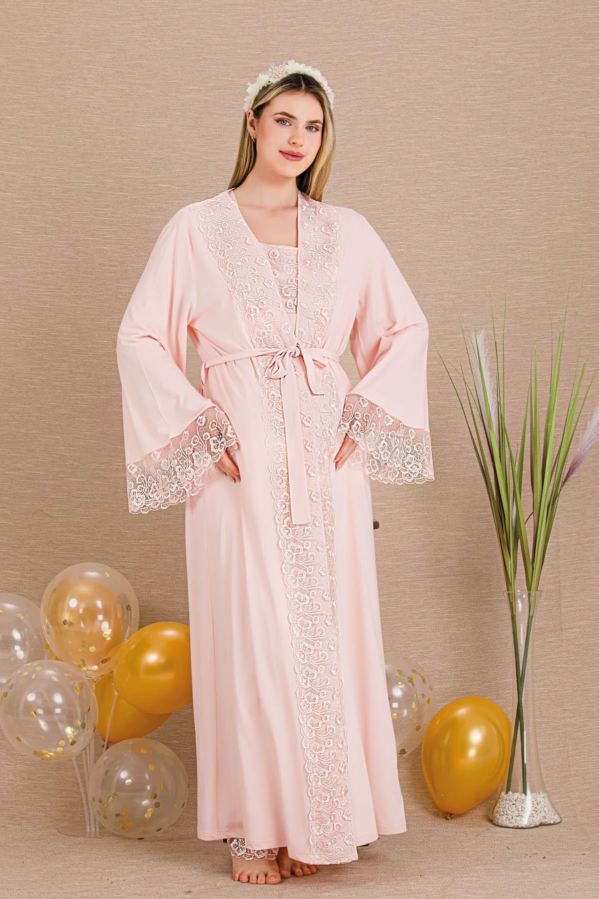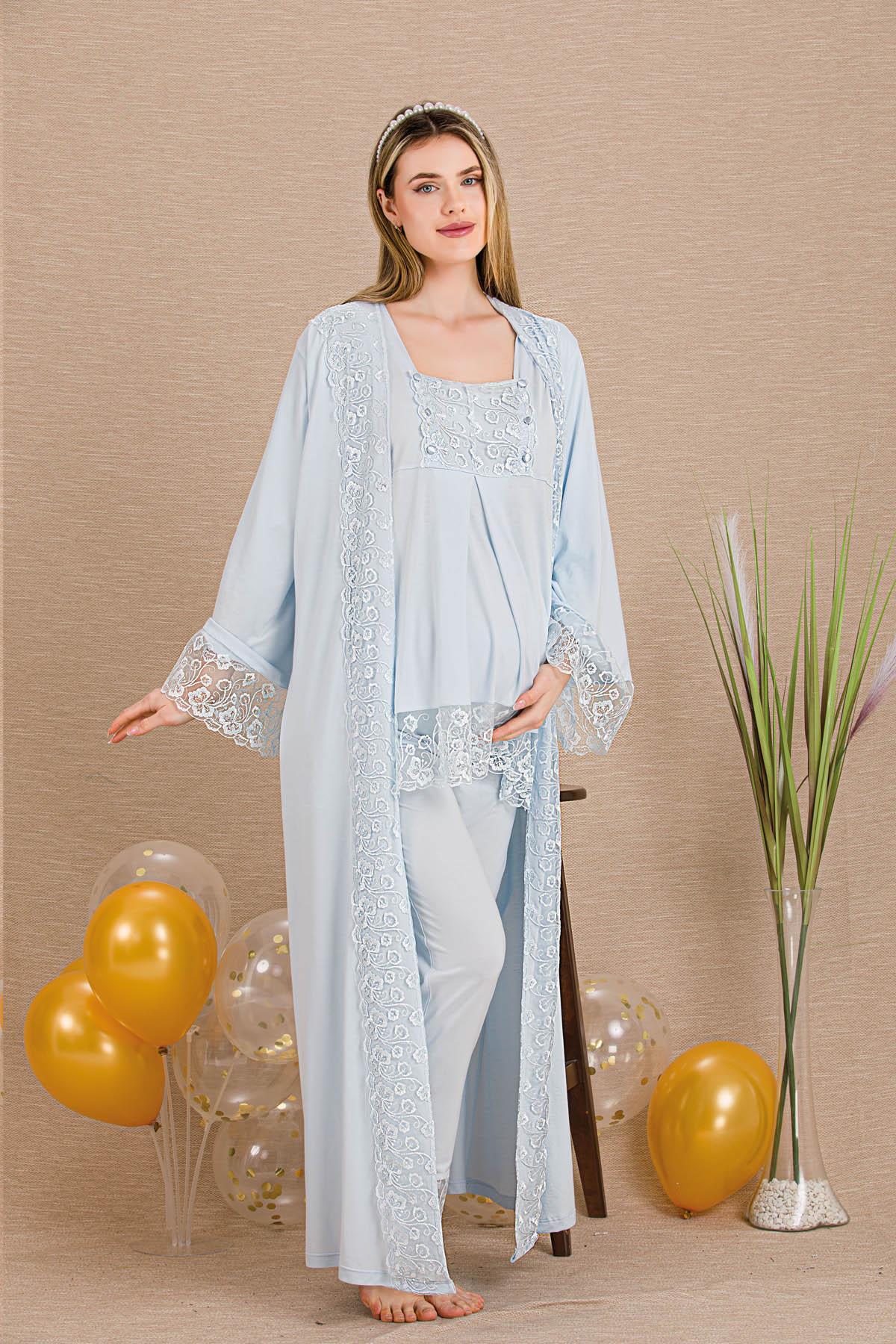 Kadın Dantel Detaylı 3'lü Hamile Lohusa Pijama Takım, Hamile Lohusa Uzun Sabahlık ve Pijama Takımı