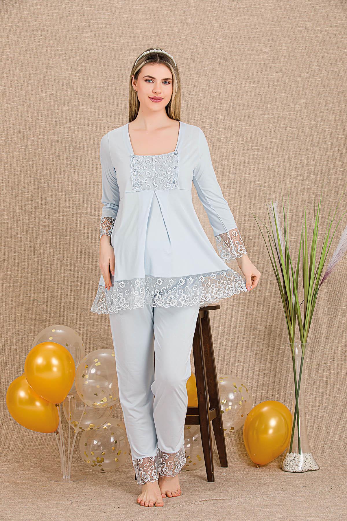 Kadın Tül Güpür Detay 3'lü Hamile Lohusa Pijama Takım, Uzun Hamile Lohusa Sabahlık ve Pijama Takımı