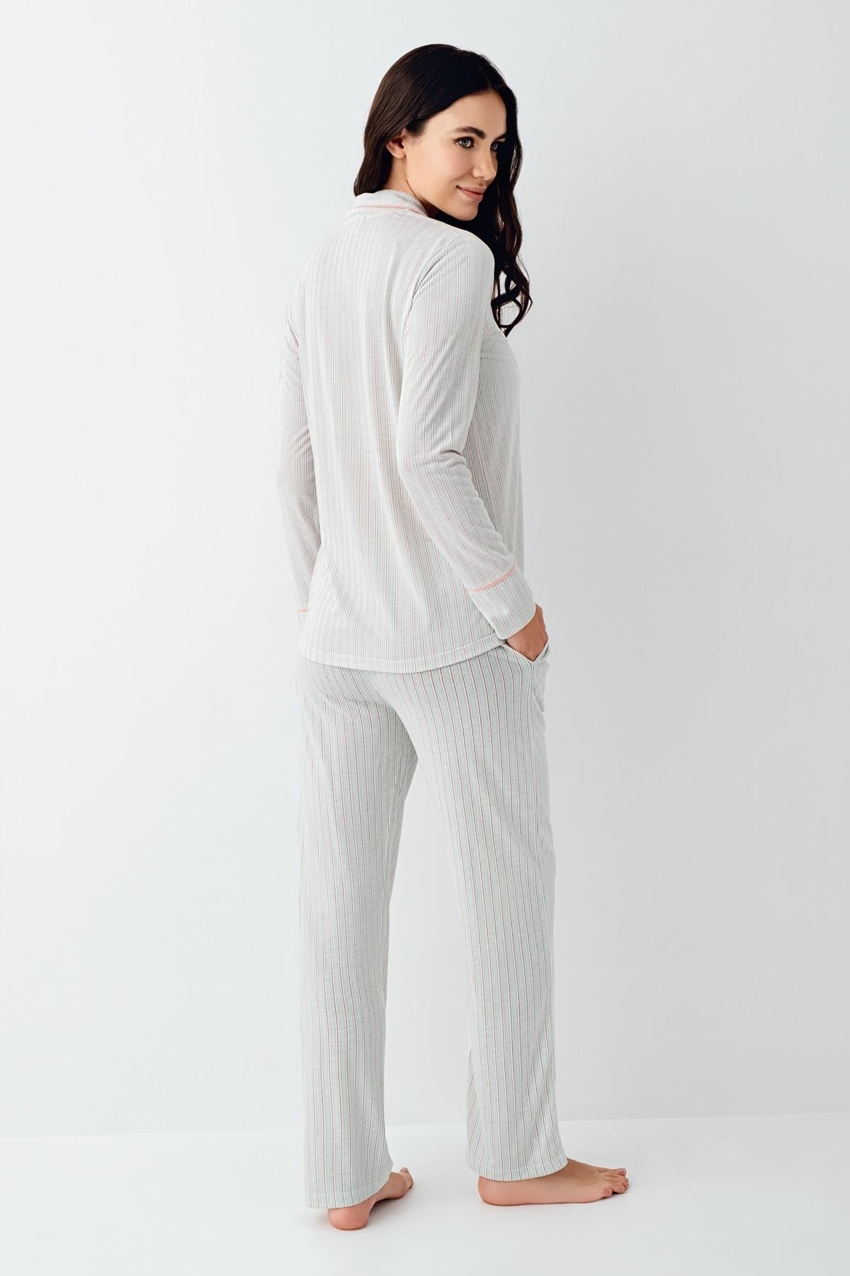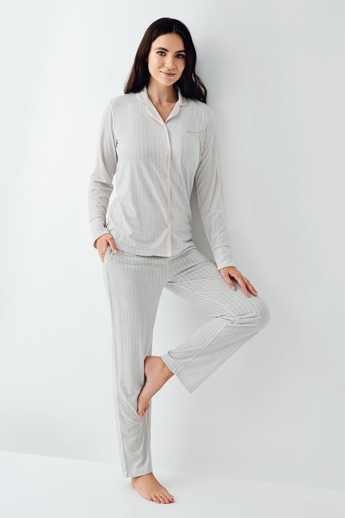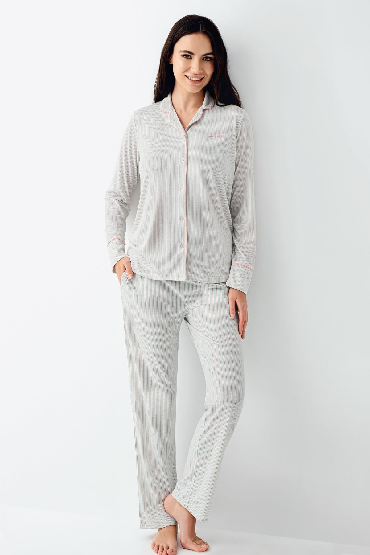 Kadın Düğmeli Çizgili Pijama Takım, Uzun kollu ve Cepli, %50 Pamuk %50 Modal