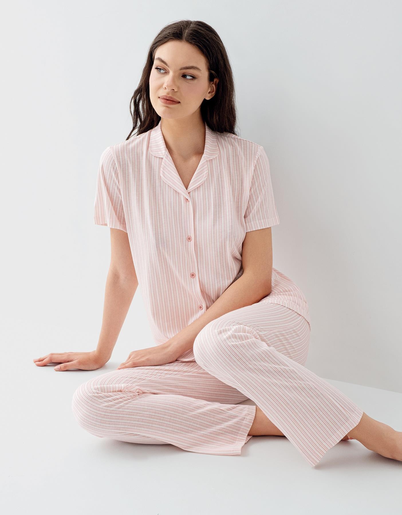 Kadın Düğmeli Çizgili Pijama Takımı – %50 Modal %50 Pamuk, İpek Yumuşaklığında, Nefes Alan Konfor