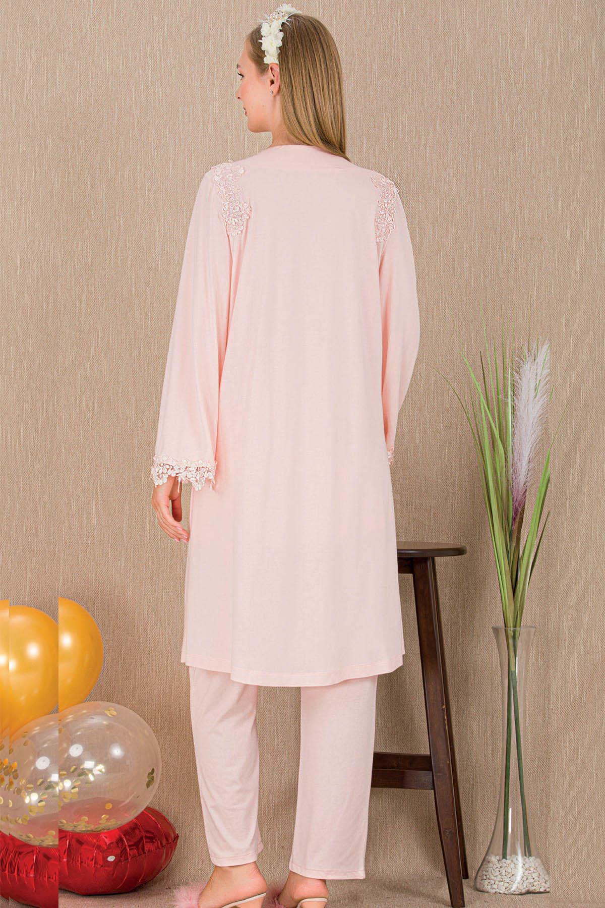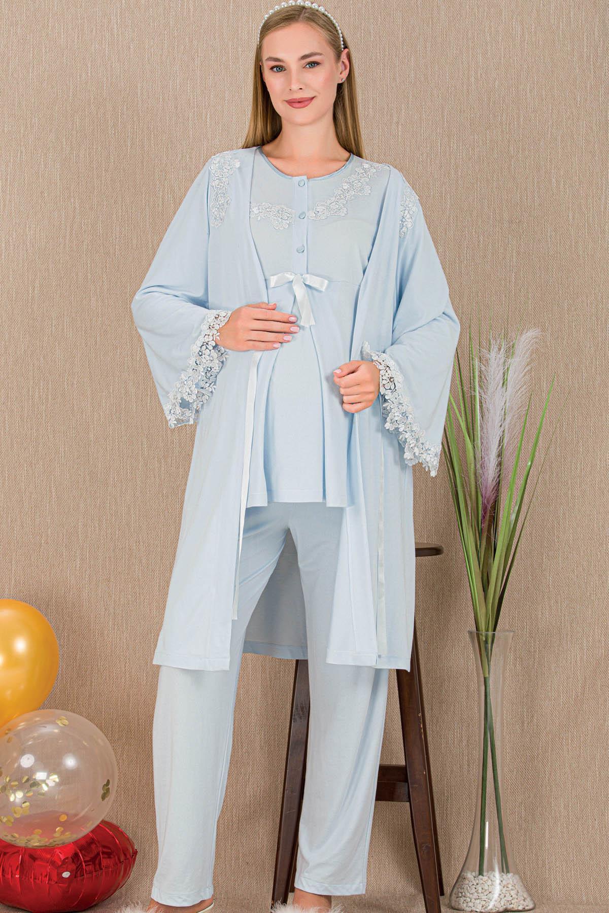 Kadın Dantel Detaylı 3'lü Hamile Lohusa Pijama Takım, Hamile Lohusa Uzun Sabahlık ve Pijama Takımı
