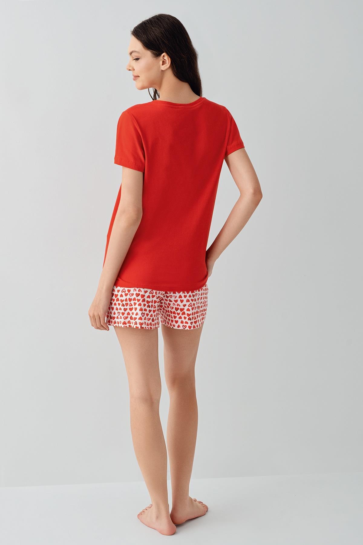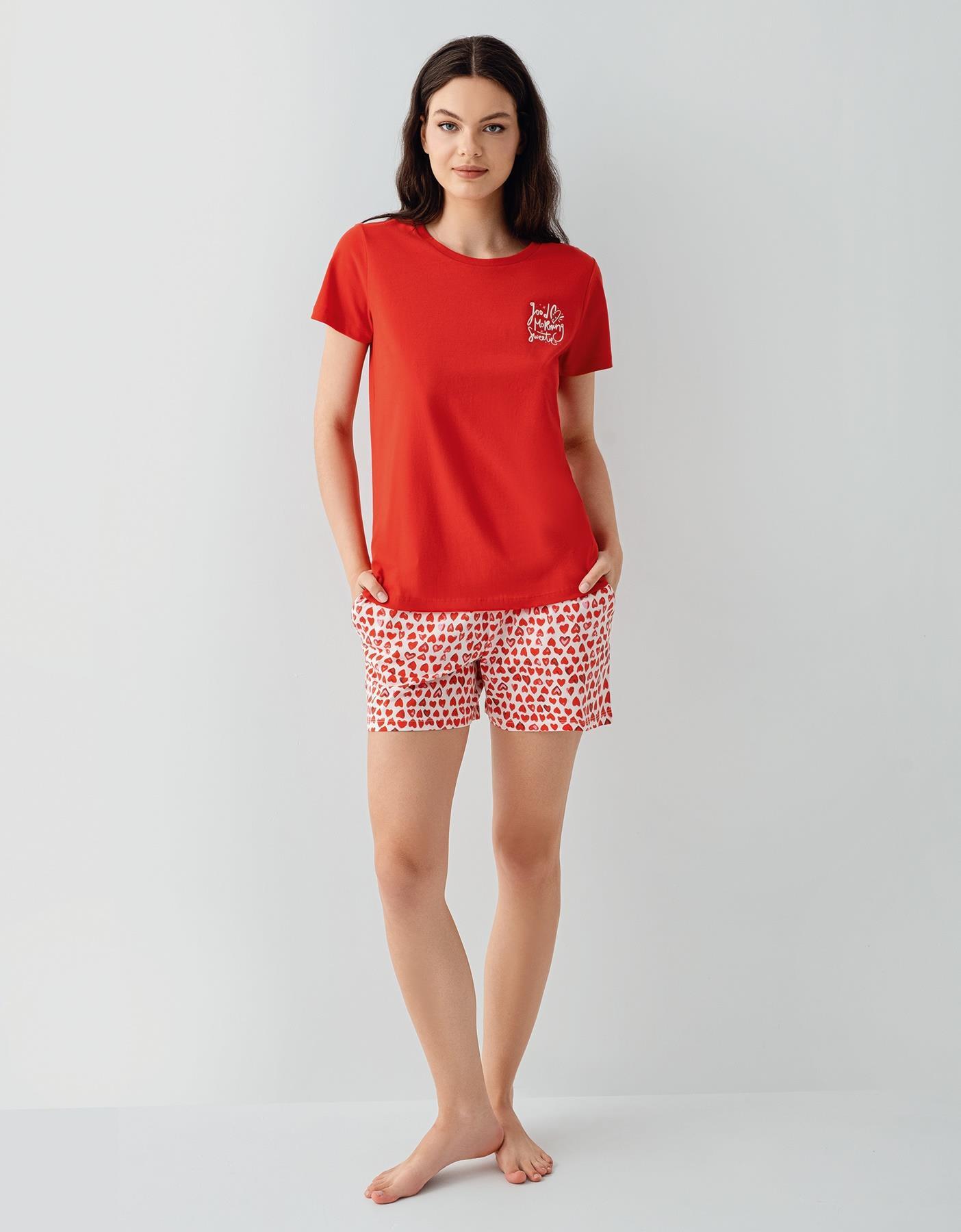 Kırmızı renkli kadın şortlu pijama takımı, yaz aylarında konforlu ve ferah bir kullanım sunmak üzere tasarlanmıştır. Minimal baskılı kısa kollu üst parça ile kalp desenli şort alt, şık ve rahat bir ev giyim deneyimi sağlar.
