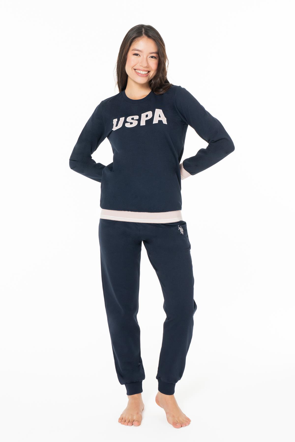 Kadın Kışlık 2 İplik Dokuma USPA Yazılı Ev Giyim Pijama Takım, Kol ve Paça Manşetli, Cepli, Lacivert alt ve üst %100 pamuk, pembe üst %100 pamuk alt %50 pamuk %polyamid