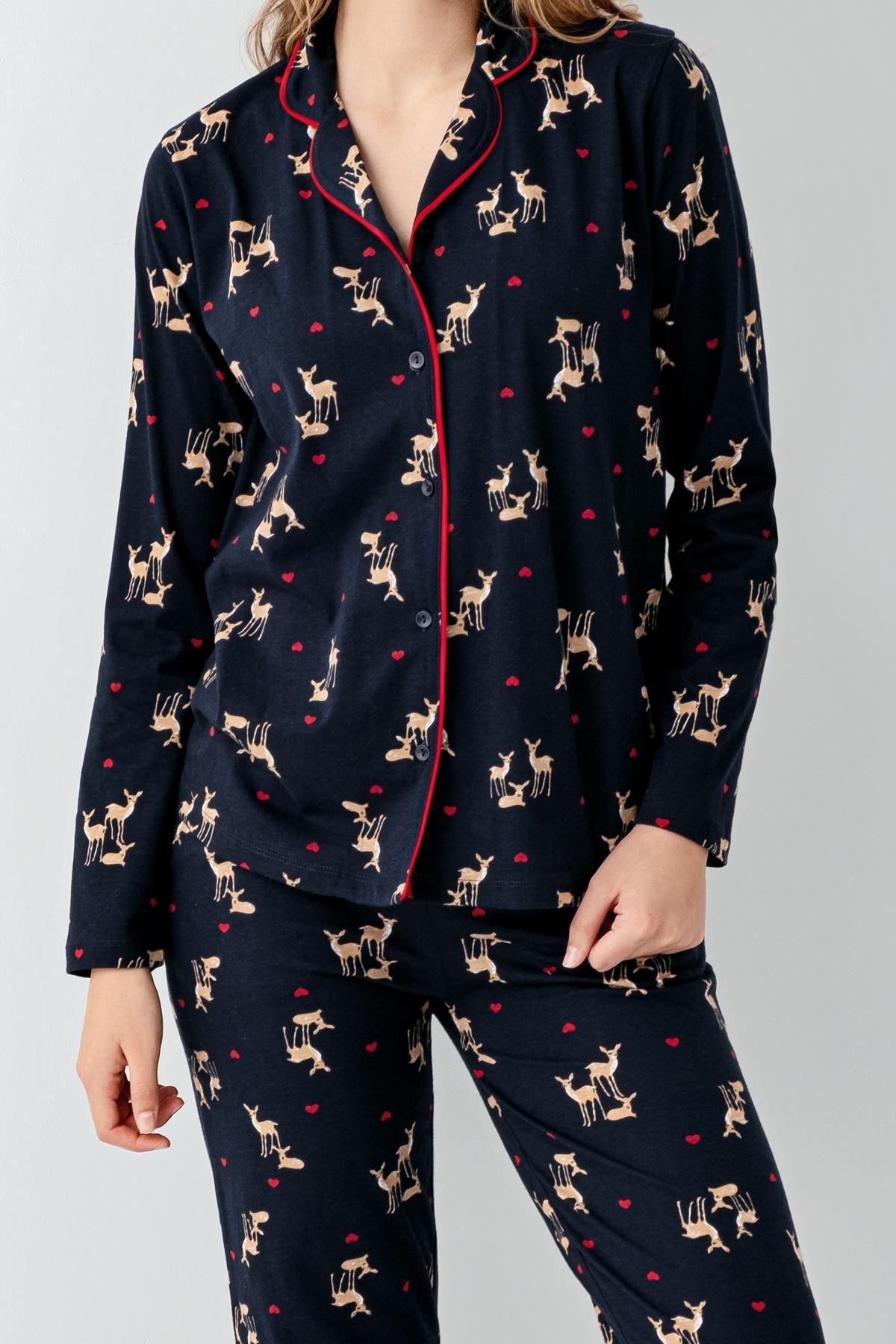 Kadın Lacivert Gömlek Pijama Takım, Geyik Baskılı, %100 Pamuk
