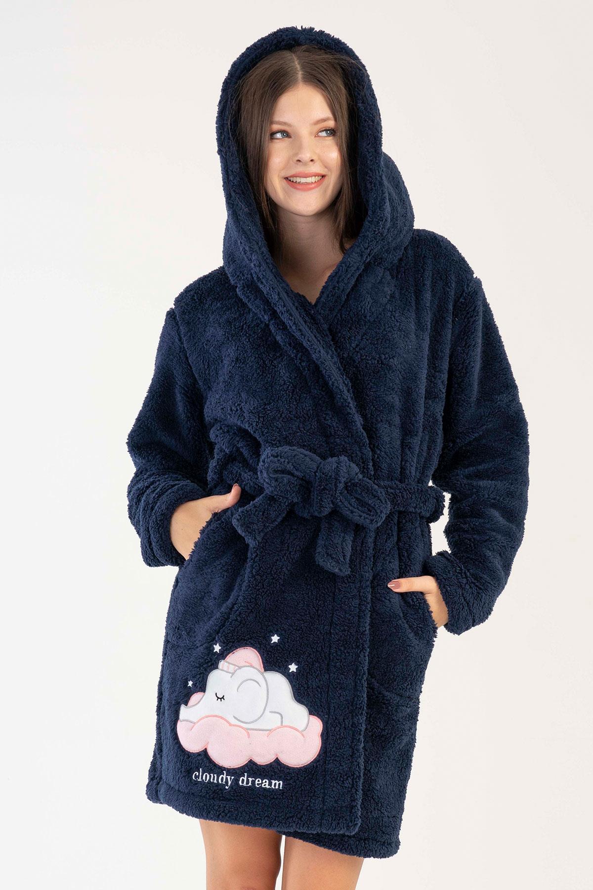 Kadın Lacivert Süper Yumuşak Vienetta Welwelsoft Kapsonlu Uzun Kol Kısa Sabahlık