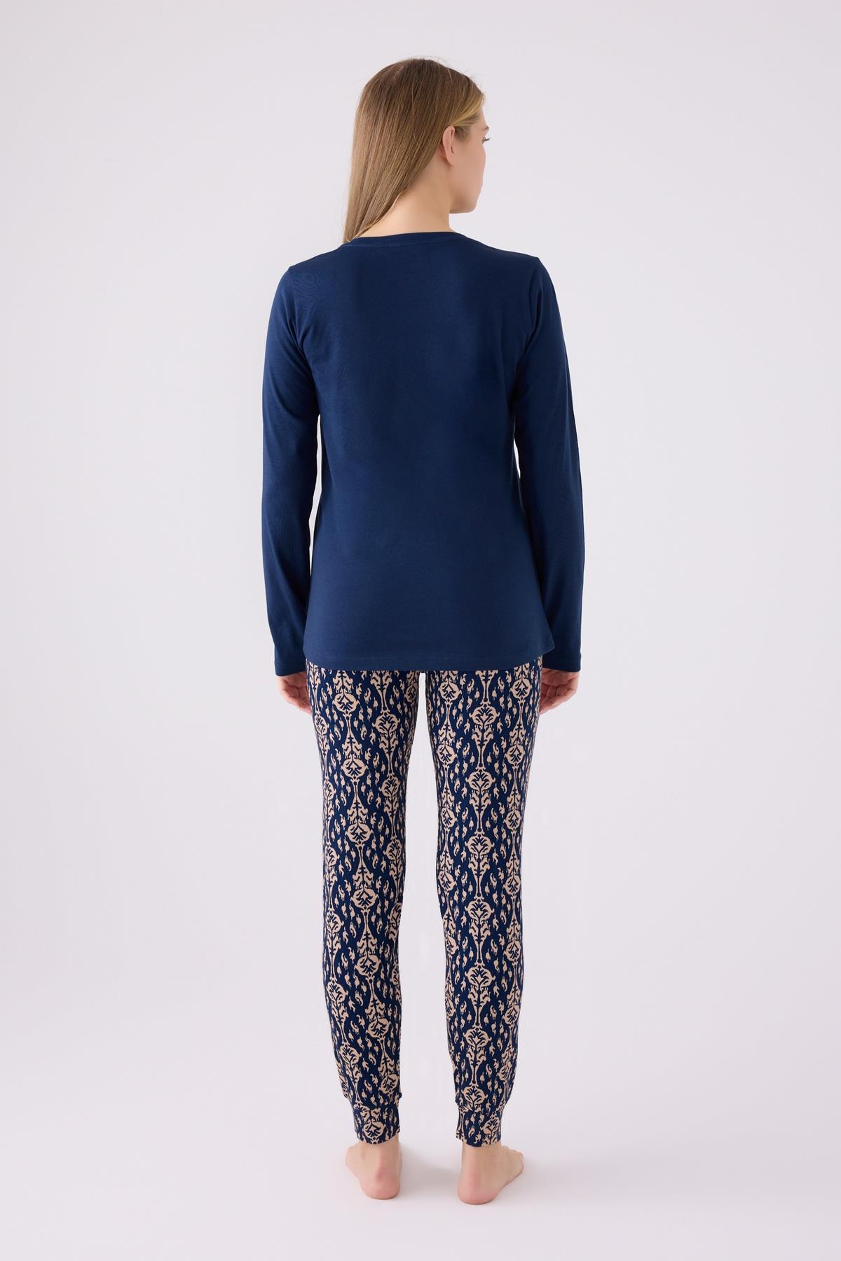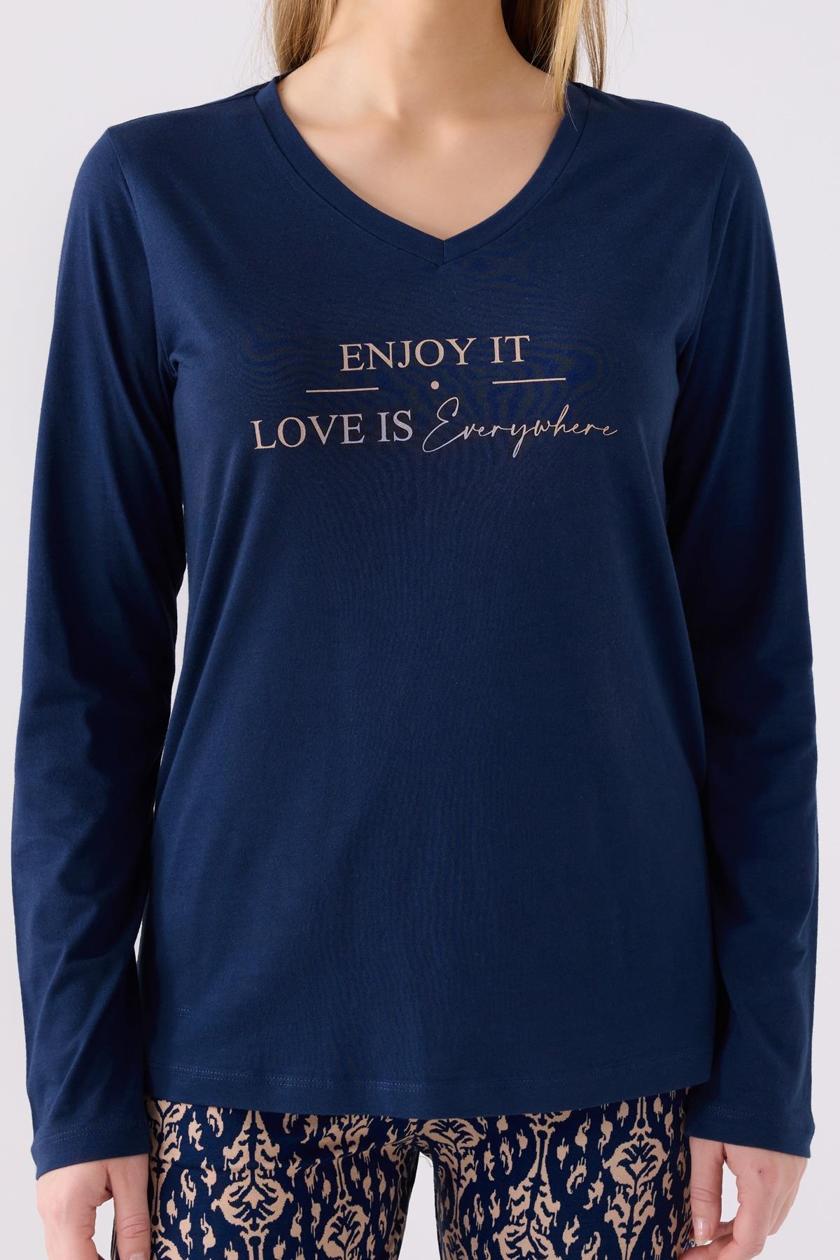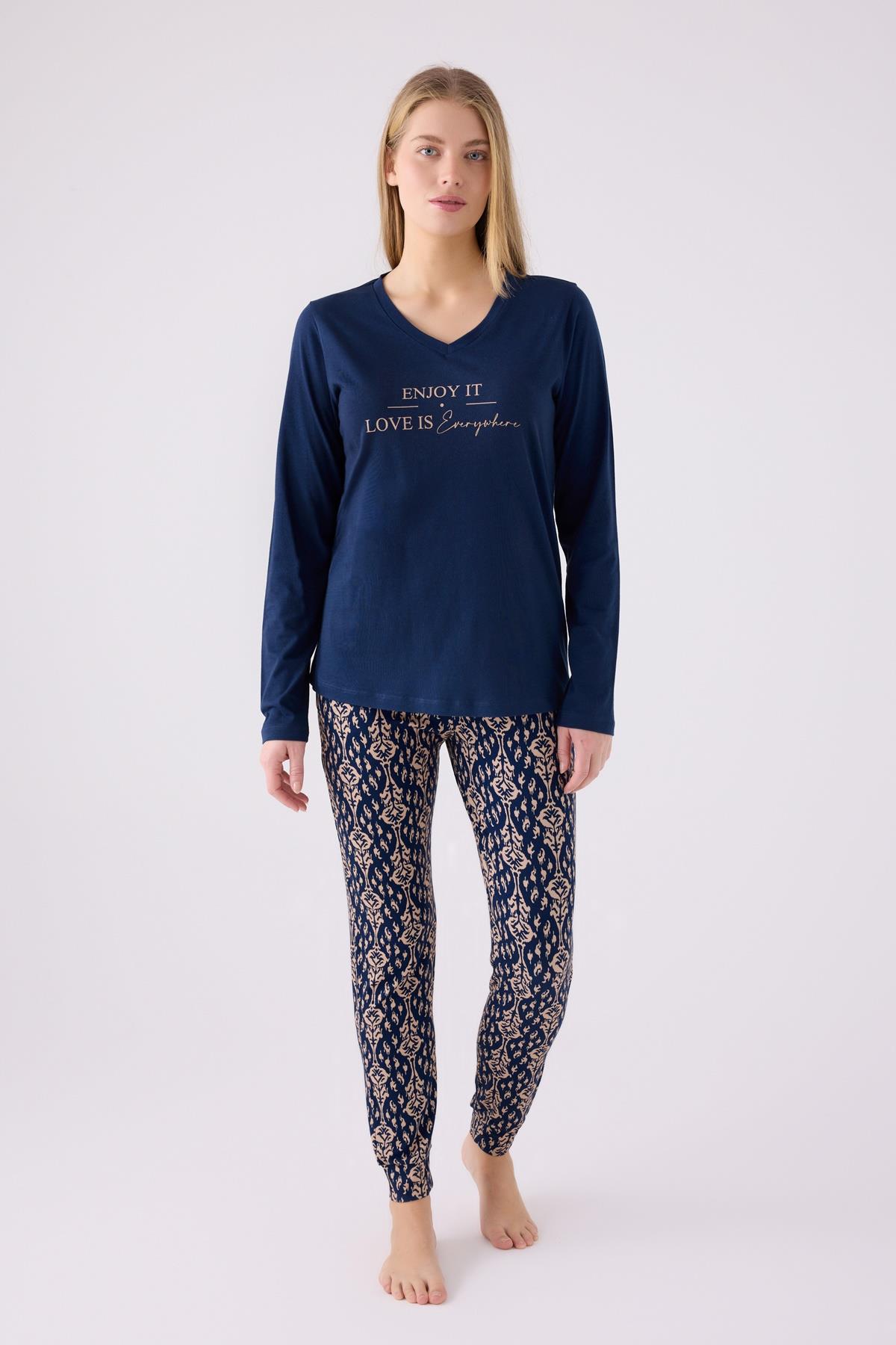 Kadın Lacivert V Yaka Uzunkol Dar Paça Cepli Pijama Takım, Viskon Dokuma