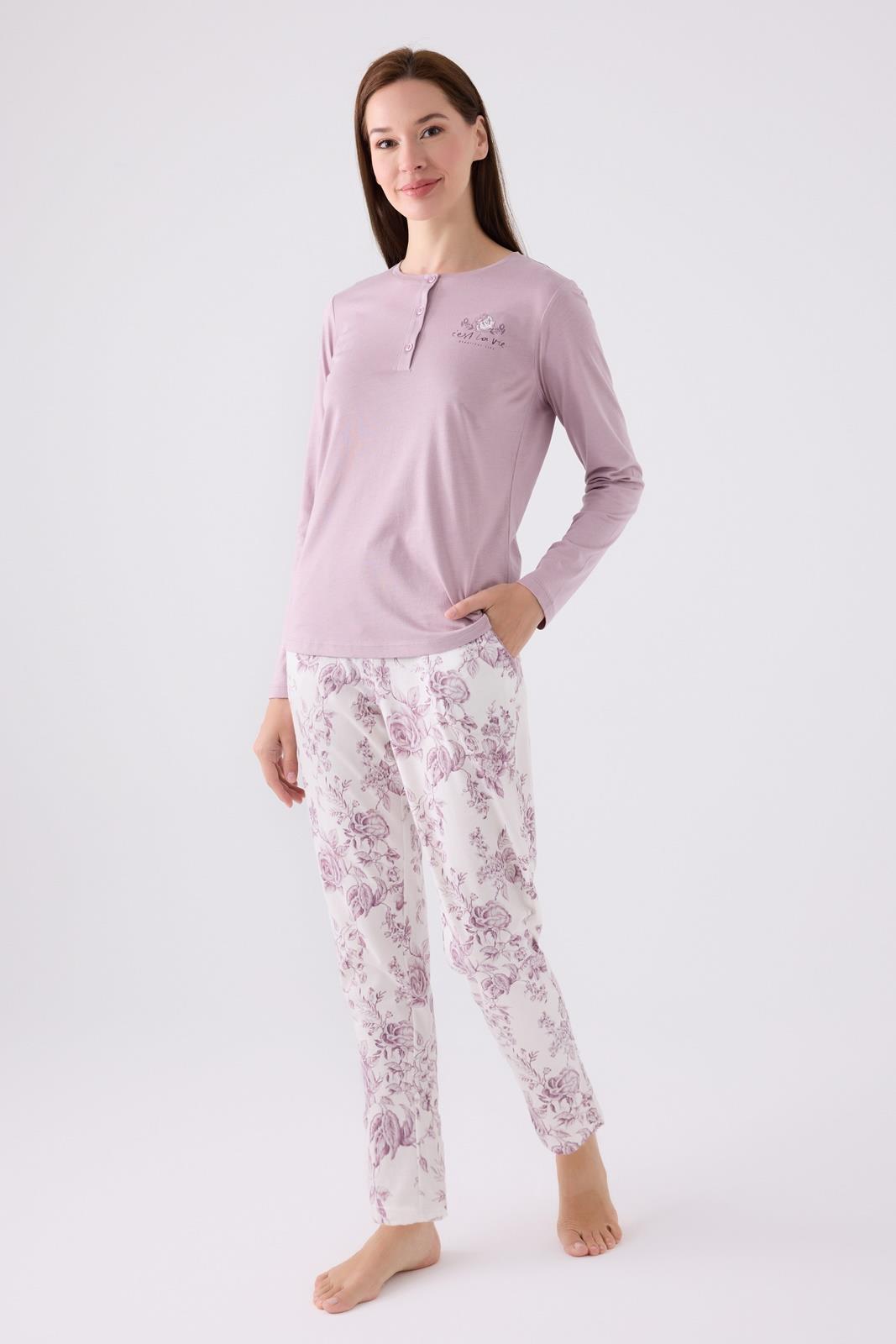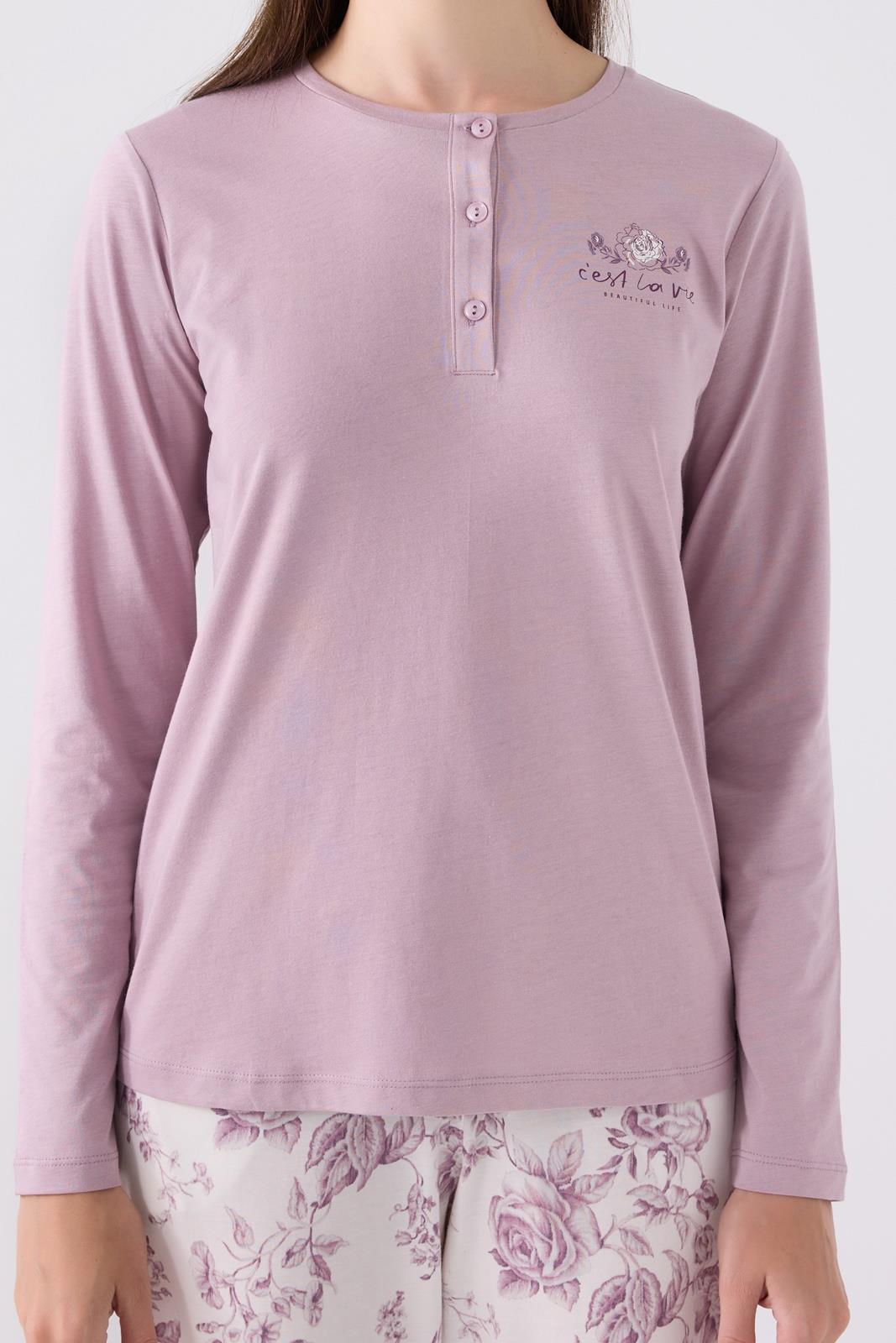 Kadın Lila Düğmeli Yaka Uzunkol Pijama Takım, Büyük Beden Kadın Pijama Takım