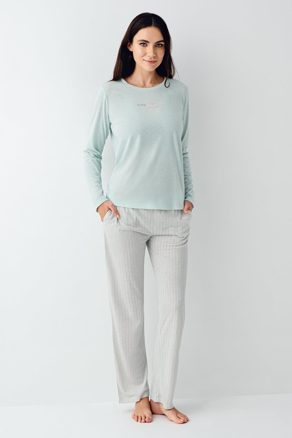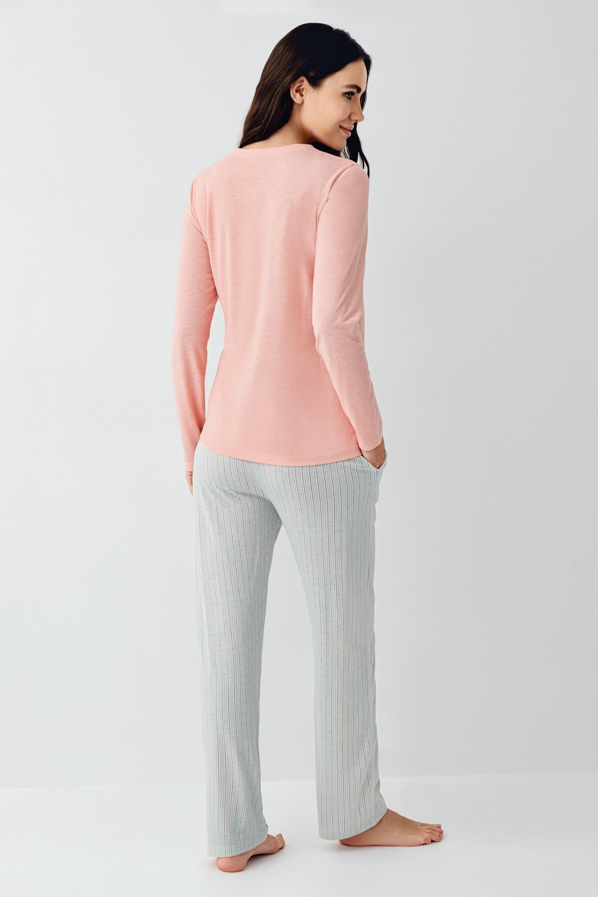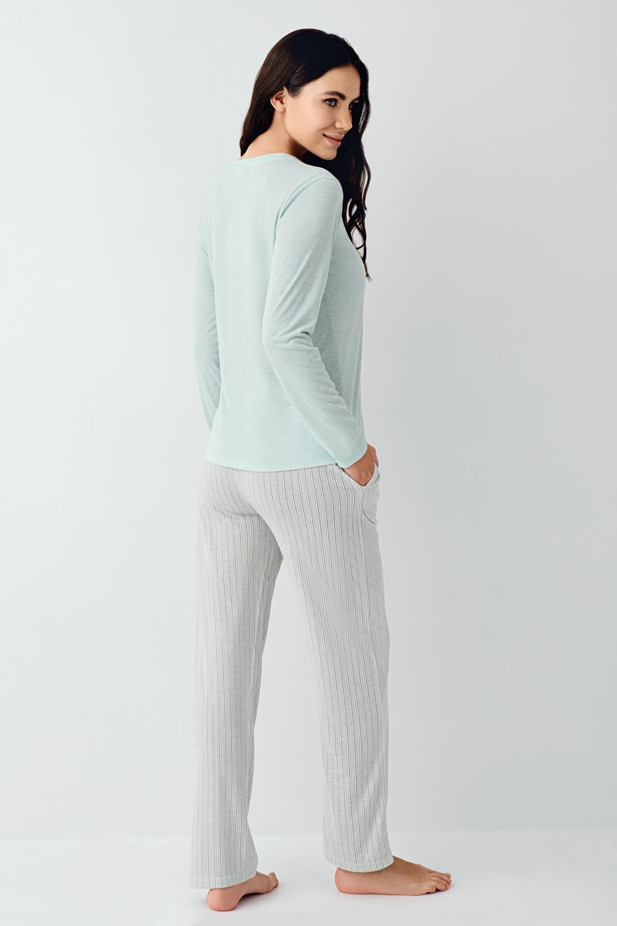 Kadın Mevsimlik Uzunkol Cepli Pijama Takımı %50 Pamuk %50 Modal, alt çizgili üst düz renk
