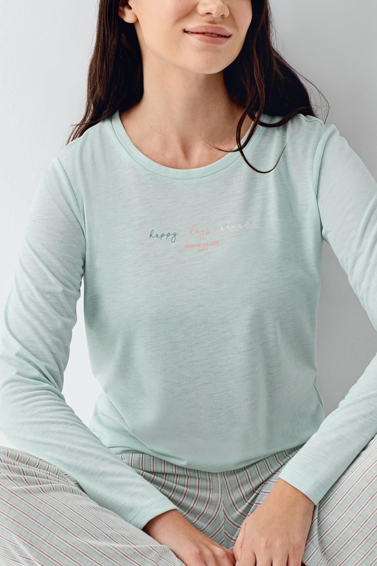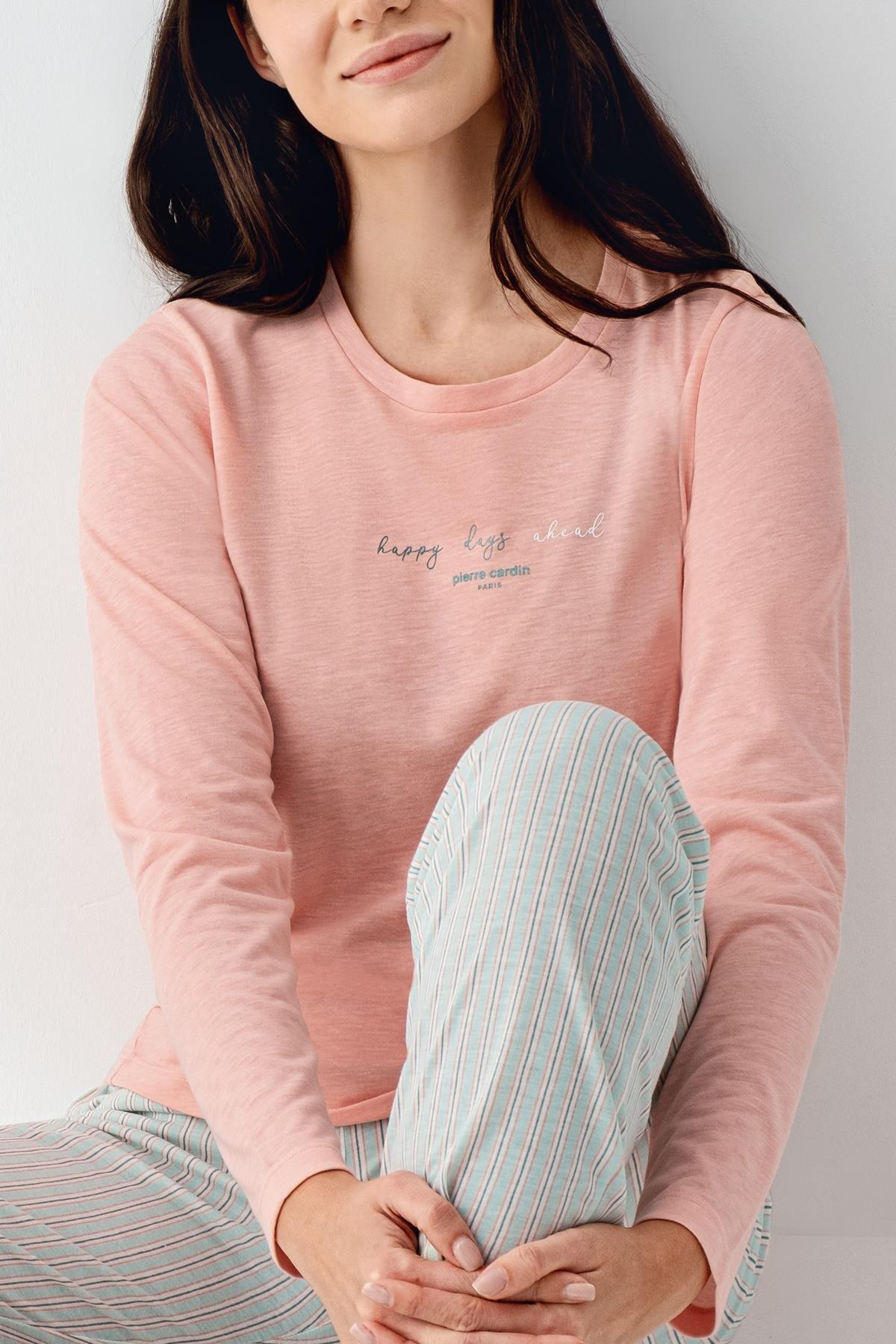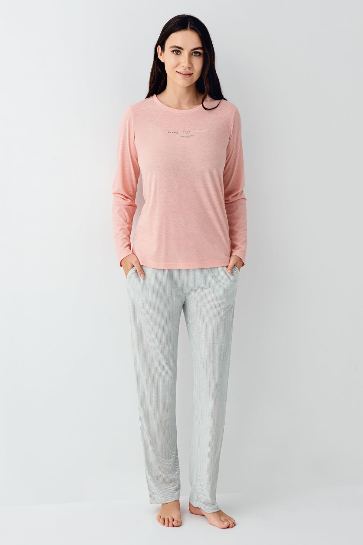 Kadın Mevsimlik Uzunkol Cepli Pijama Takımı %50 Pamuk %50 Modal, alt çizgili üst düz renk