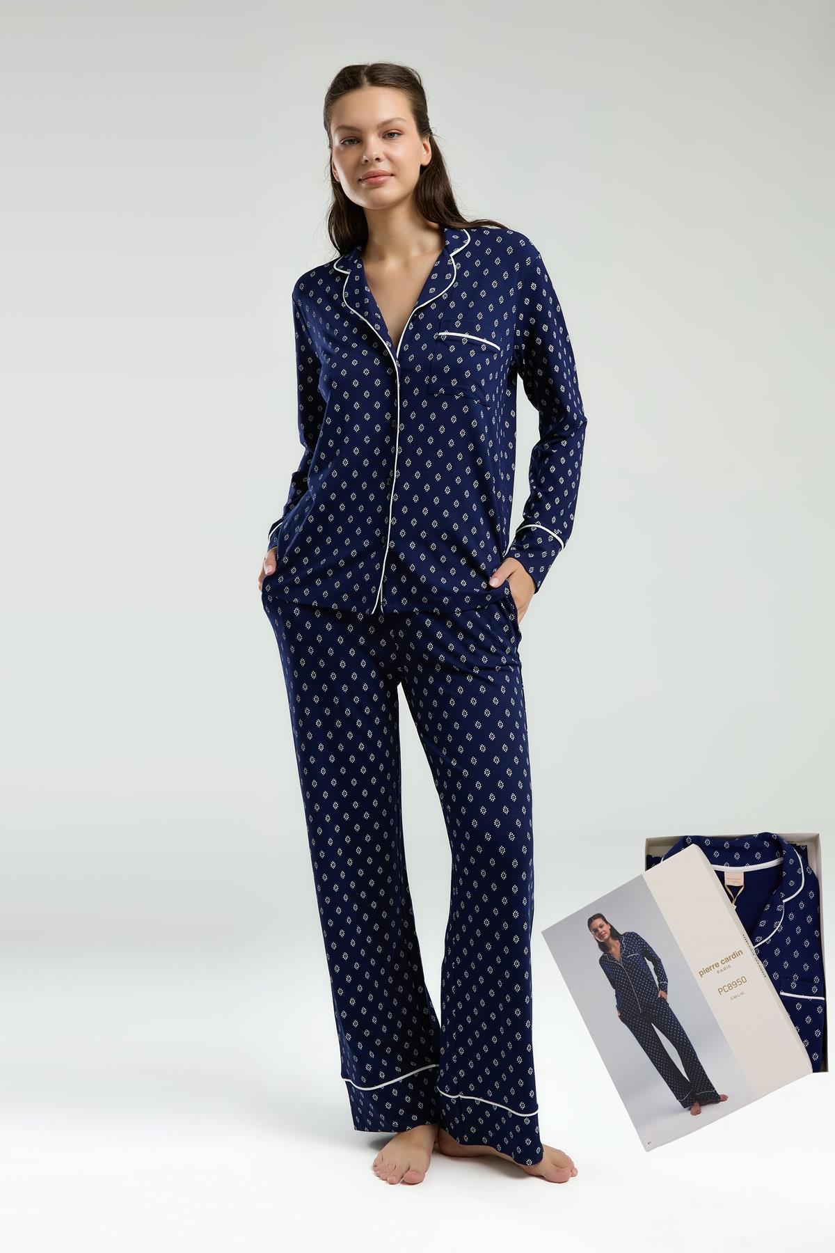 Pierre Cardin Boydan Düğmeli, Uzunkol Desenli Pijama Takım, Kutulu Çeyizlik Pijama Takım, %96 Viskon %4Elastan