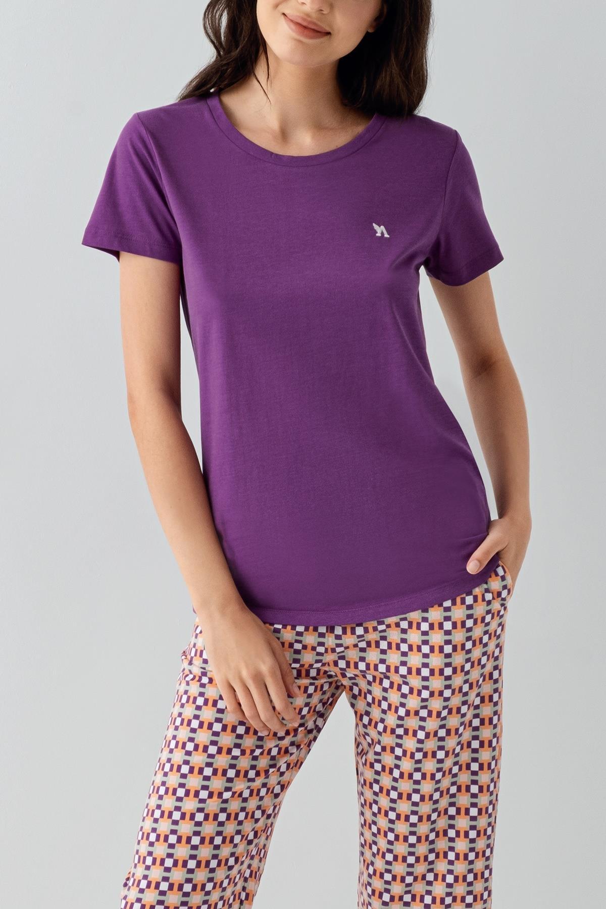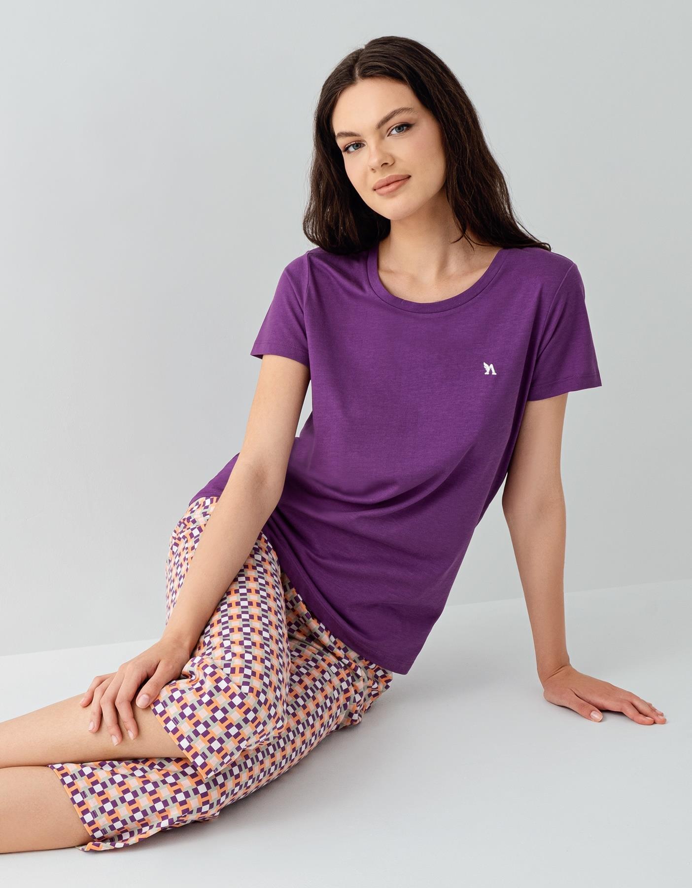 Mor renkli kısa kollu bisiklet yaka üst, sade ve zamansız bir tasarıma sahiptir. Desenli kapri pantolon ise pijama takımına hareketli ve şık bir hava katar. Evde dinlenirken, uyku sırasında veya günlük ev giyimi olarak rahatlıkla tercih edilebilir.