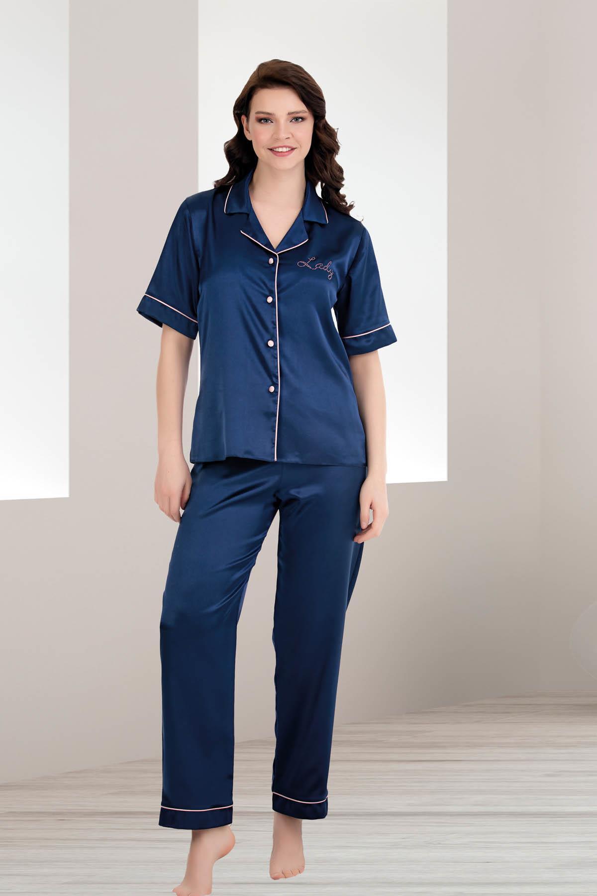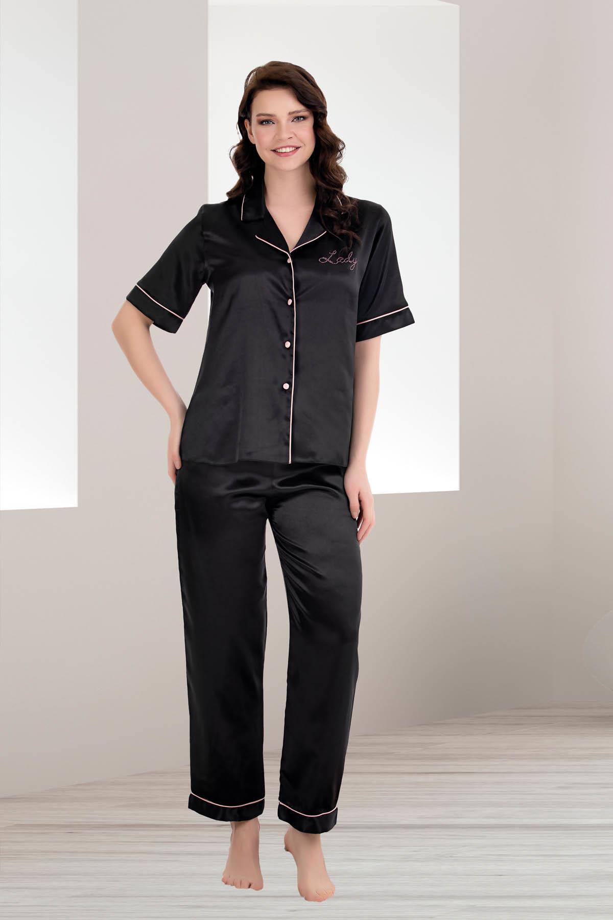 Kadın Saten Düz Renk Önden Düğmeli Biyeli Kısa Kol Saten Pijama Takım