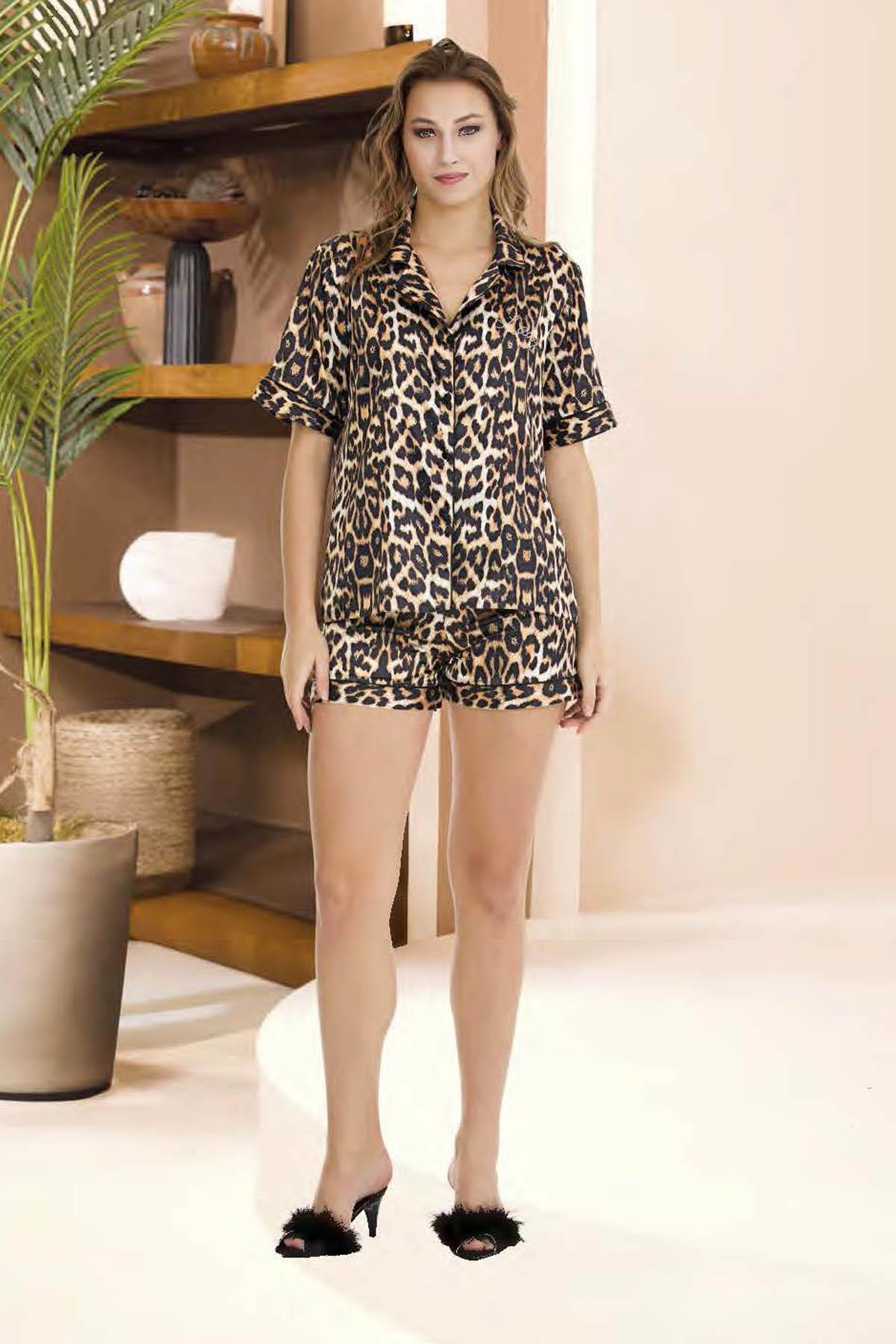 Kadın Leopar Desenli Büyük Beden Kısakollu Saten Pijama Takım