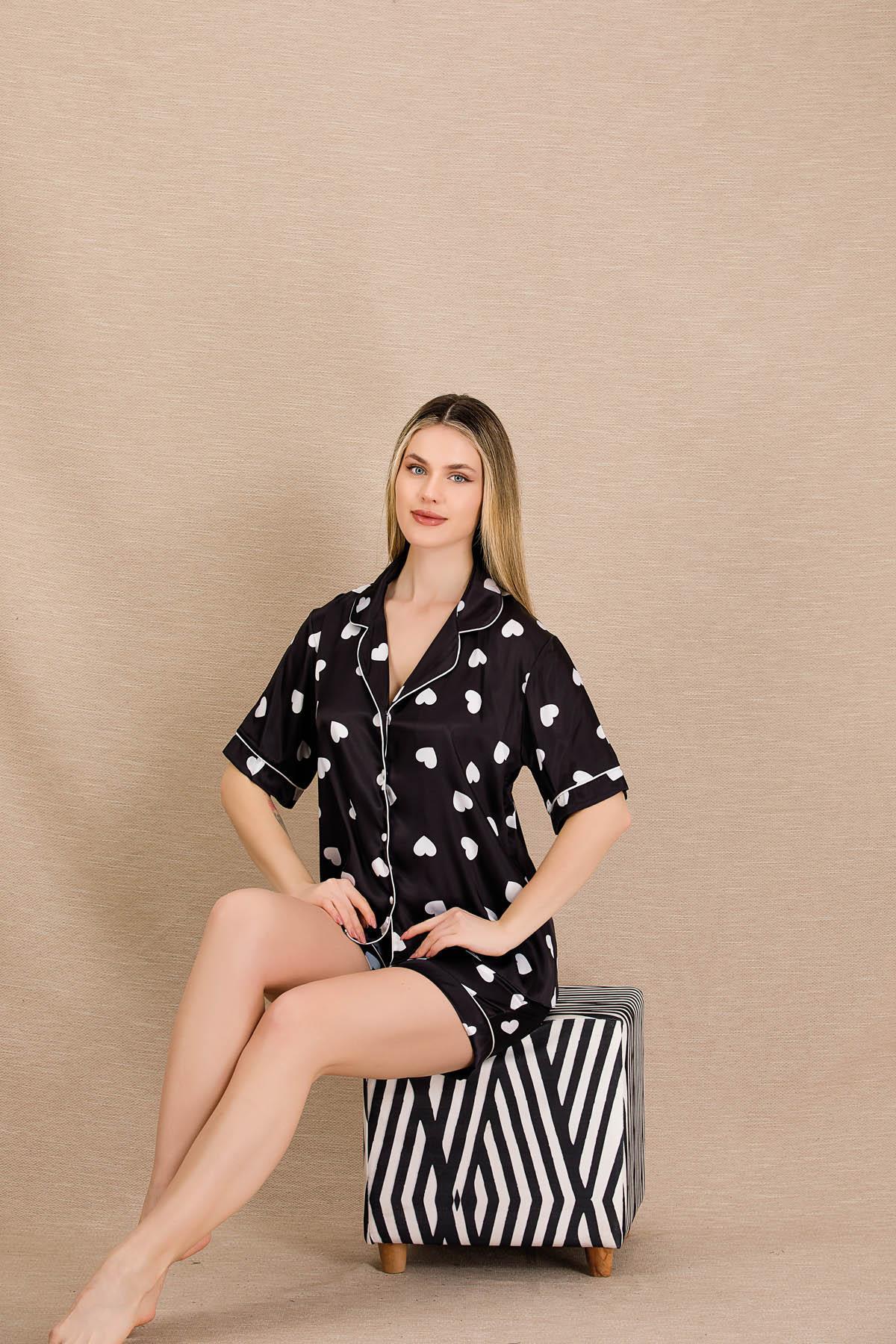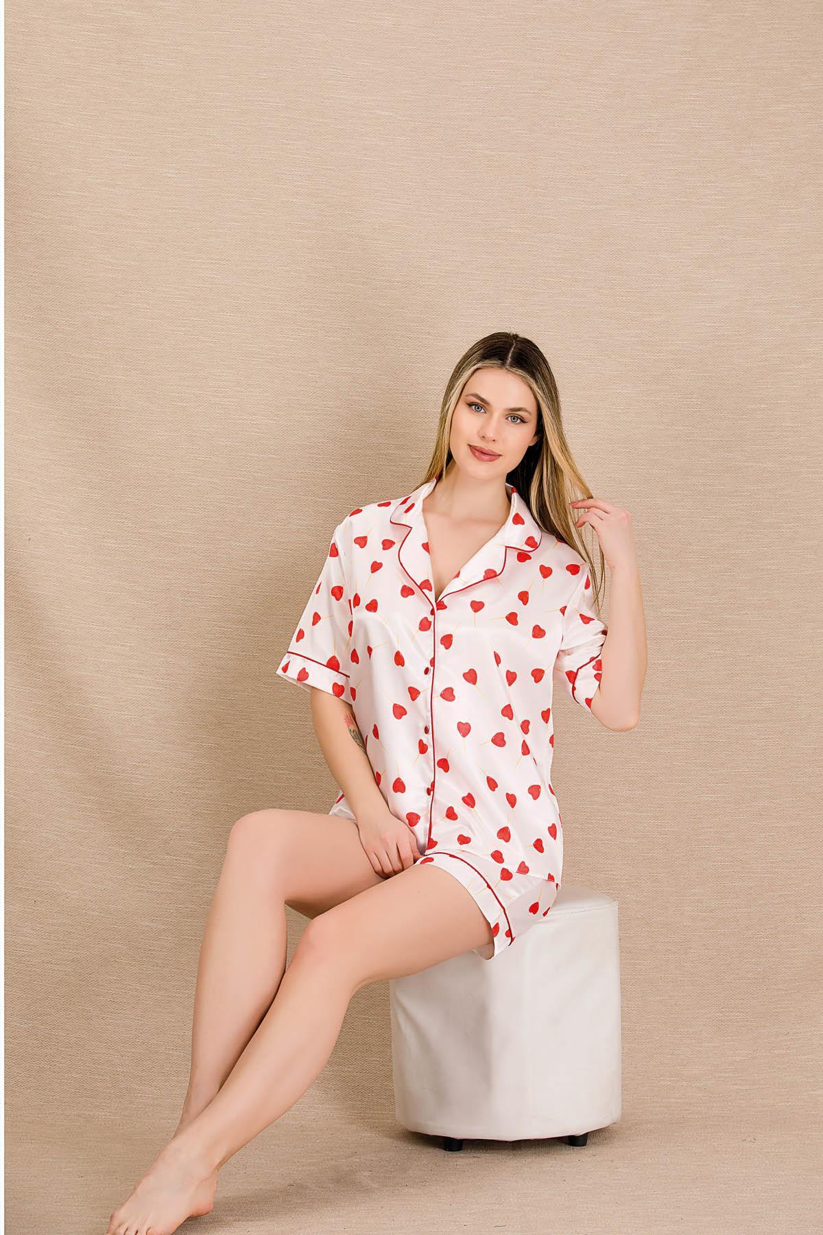 Kadın Saten Kalp Baskılı Gömlek Şort Takım, Önden Düğmeli