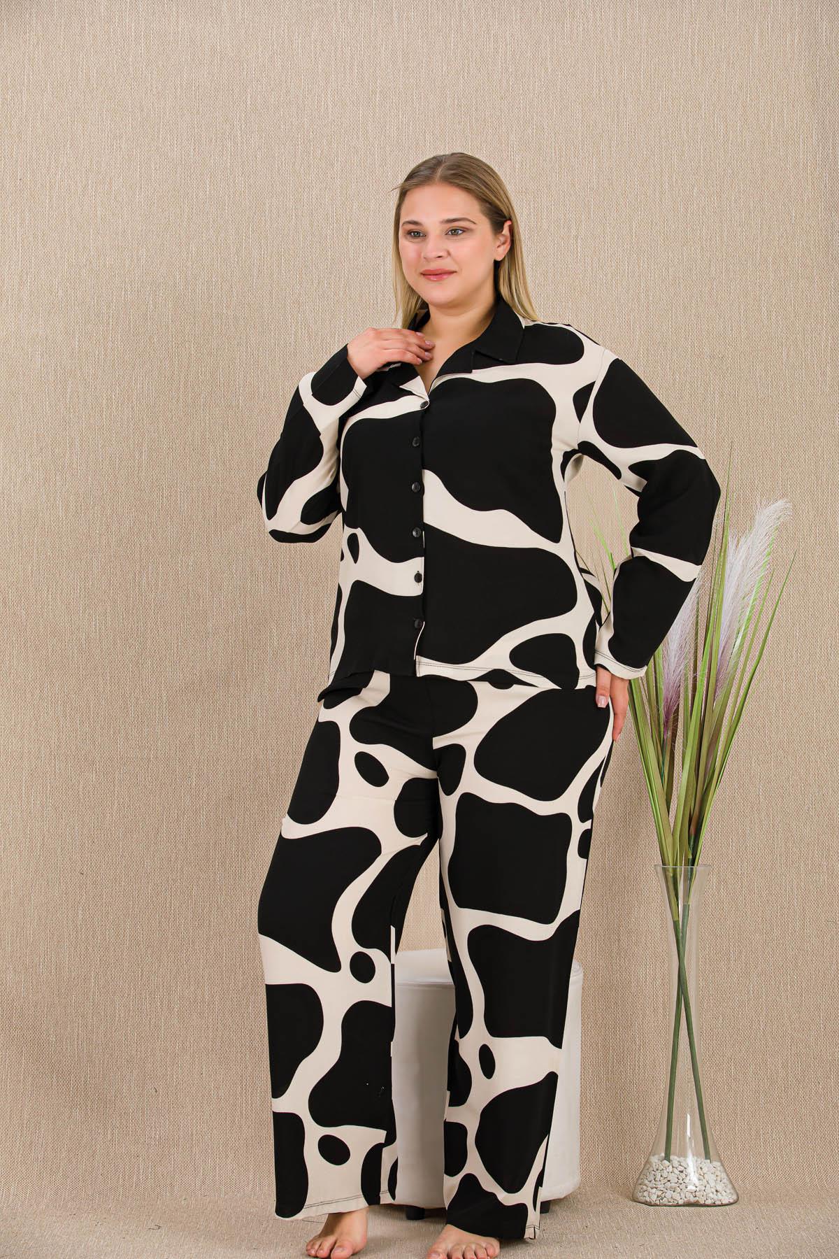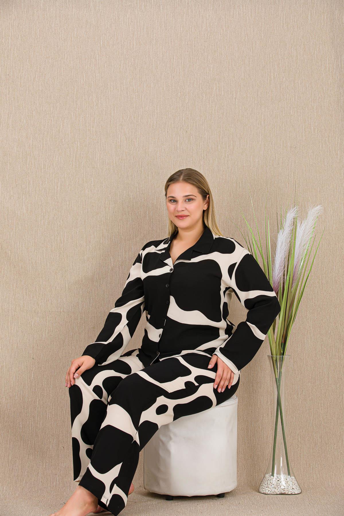 Kadın Siyah Beyaz Desen Büyük Beden Düğmeli Pijama Takım, Belmando Dokuma Viskon kumaş