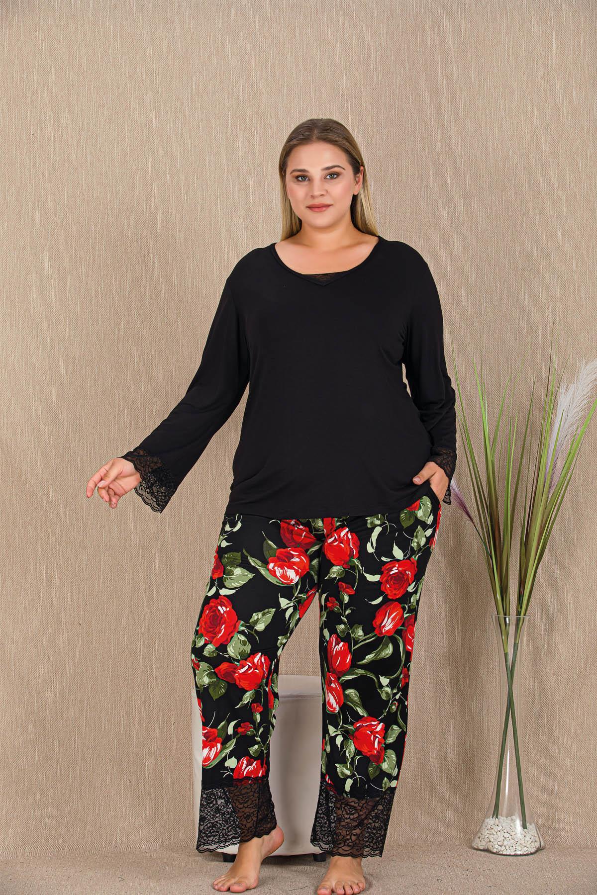 Kadın Siyah Büyük Beden Pijama Takım, Dantel Detay, Cepli ve Çiçekli, Viskon kumaş