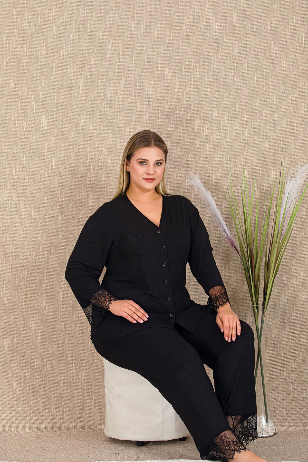 Kadın Siyah Büyük Beden Pijama Takım, Düğmeli ve Uzunkollu, bilek ve paça dantelli, viskon Kumaş