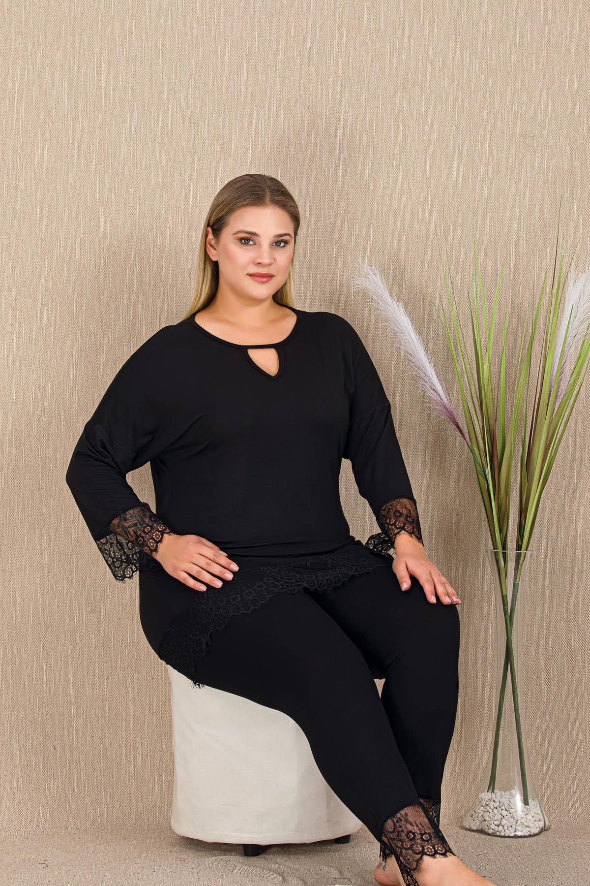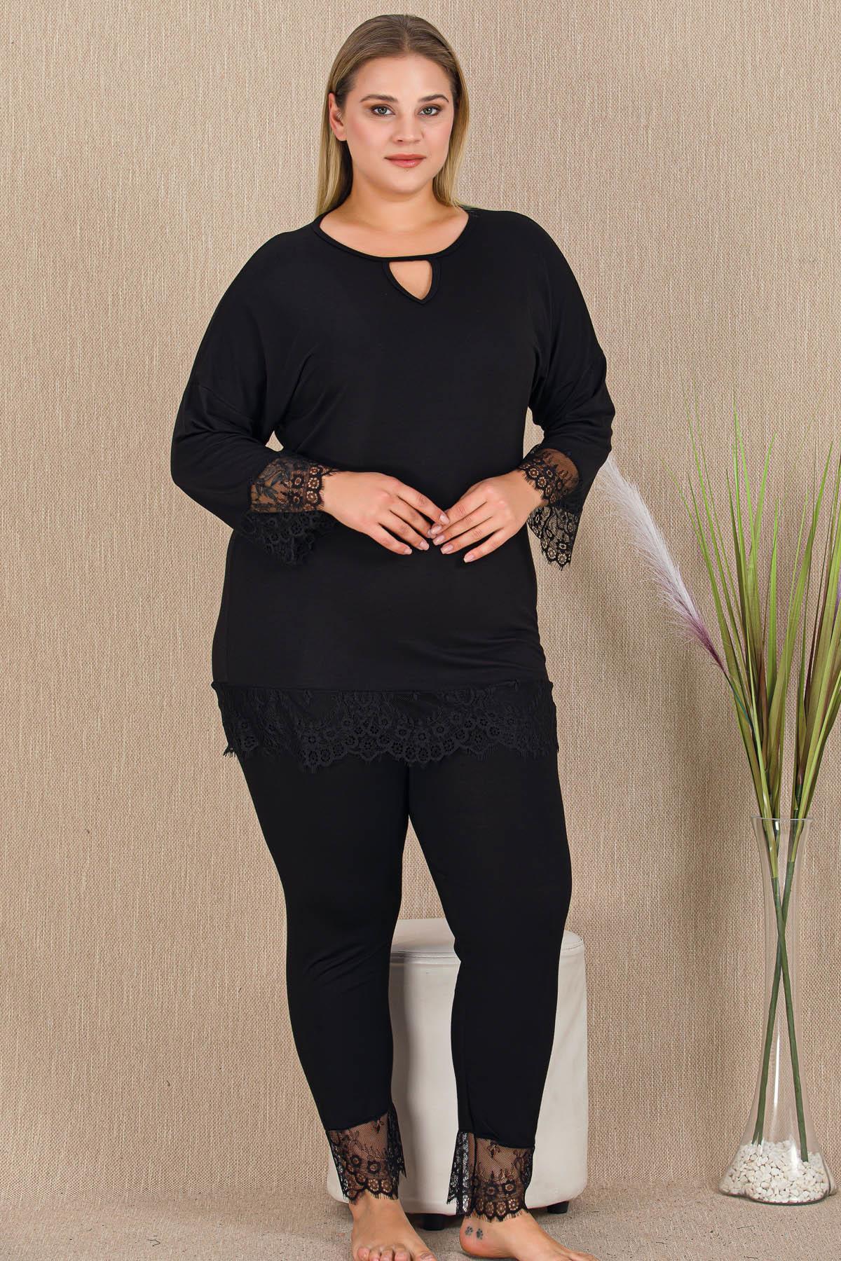Kadın Siyah Büyük Beden Tunik Tayt Takım, Uzunkollu, Kol ve Paça Dantelli , viskon Kumaş