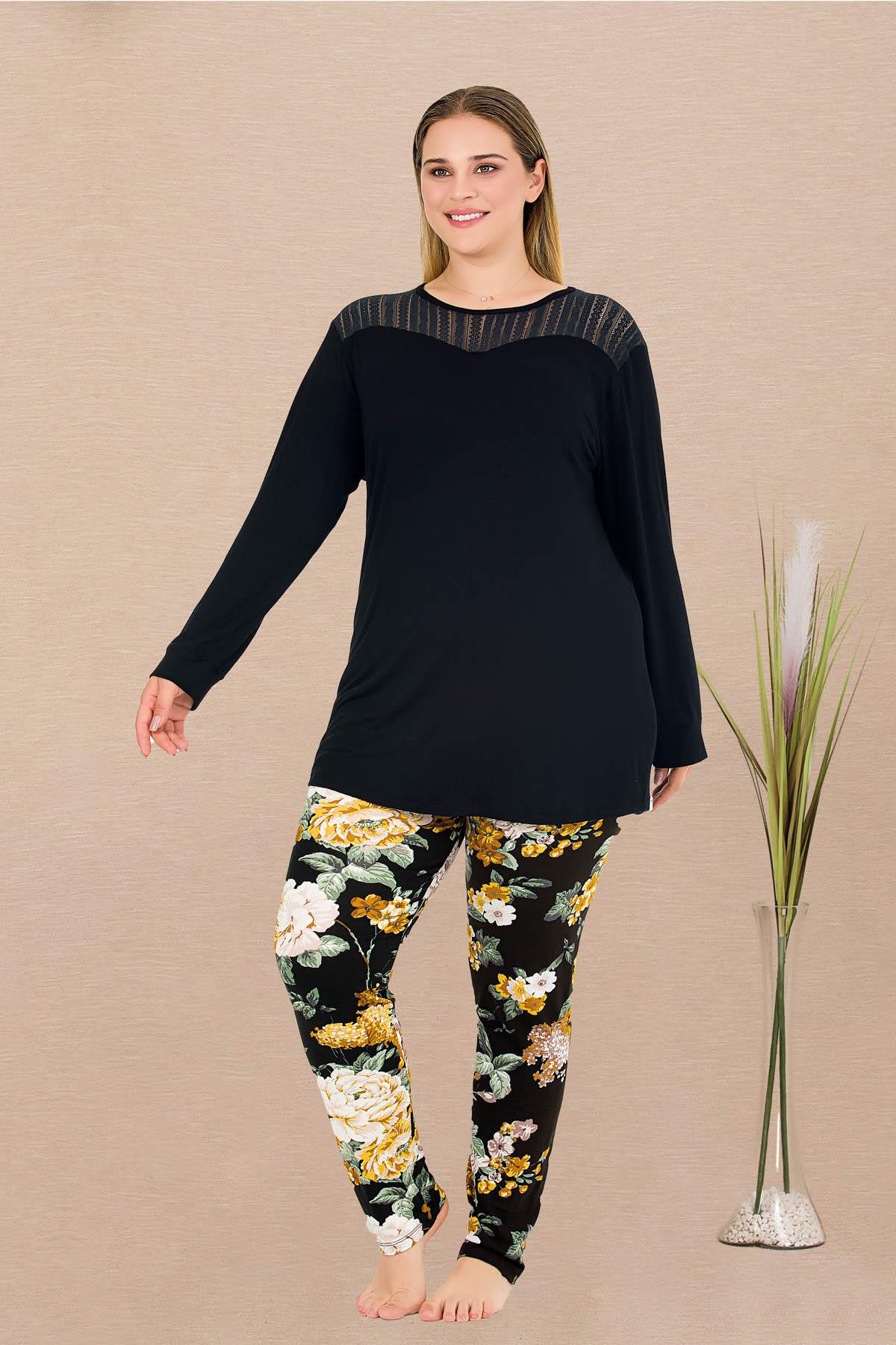 Kadın Siyah Büyük Beden Tunikli Pijama Takım, Üst Uzunkollu Düz Renk , Alt çiçek Desenli, Viskon Kumaş