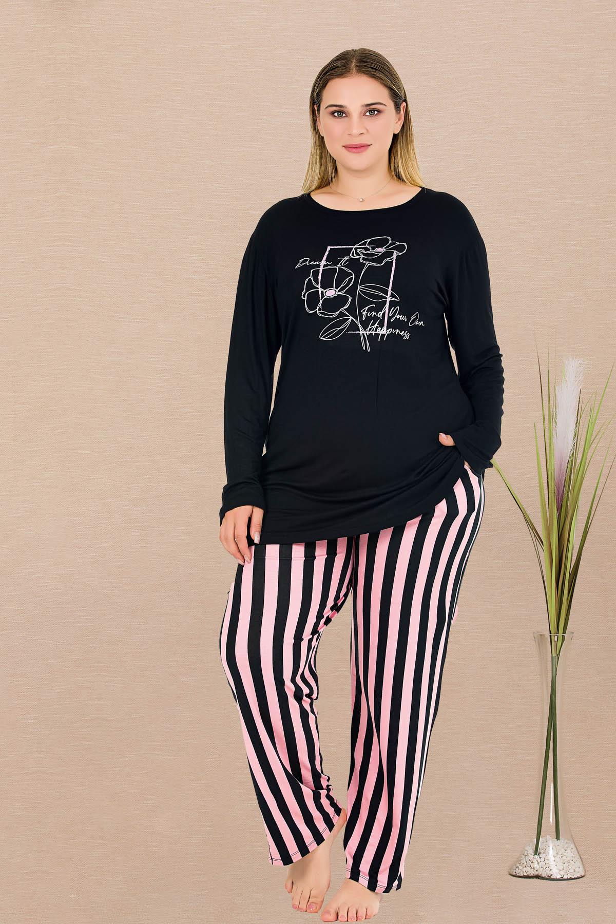 Kadın Siyah Pembe Çizgili Büyük Beden Pijama Takım, Üst Uzunkollu Baskılı, Alt Çizgili ve Düz Paçalı, Viskon Kumaş