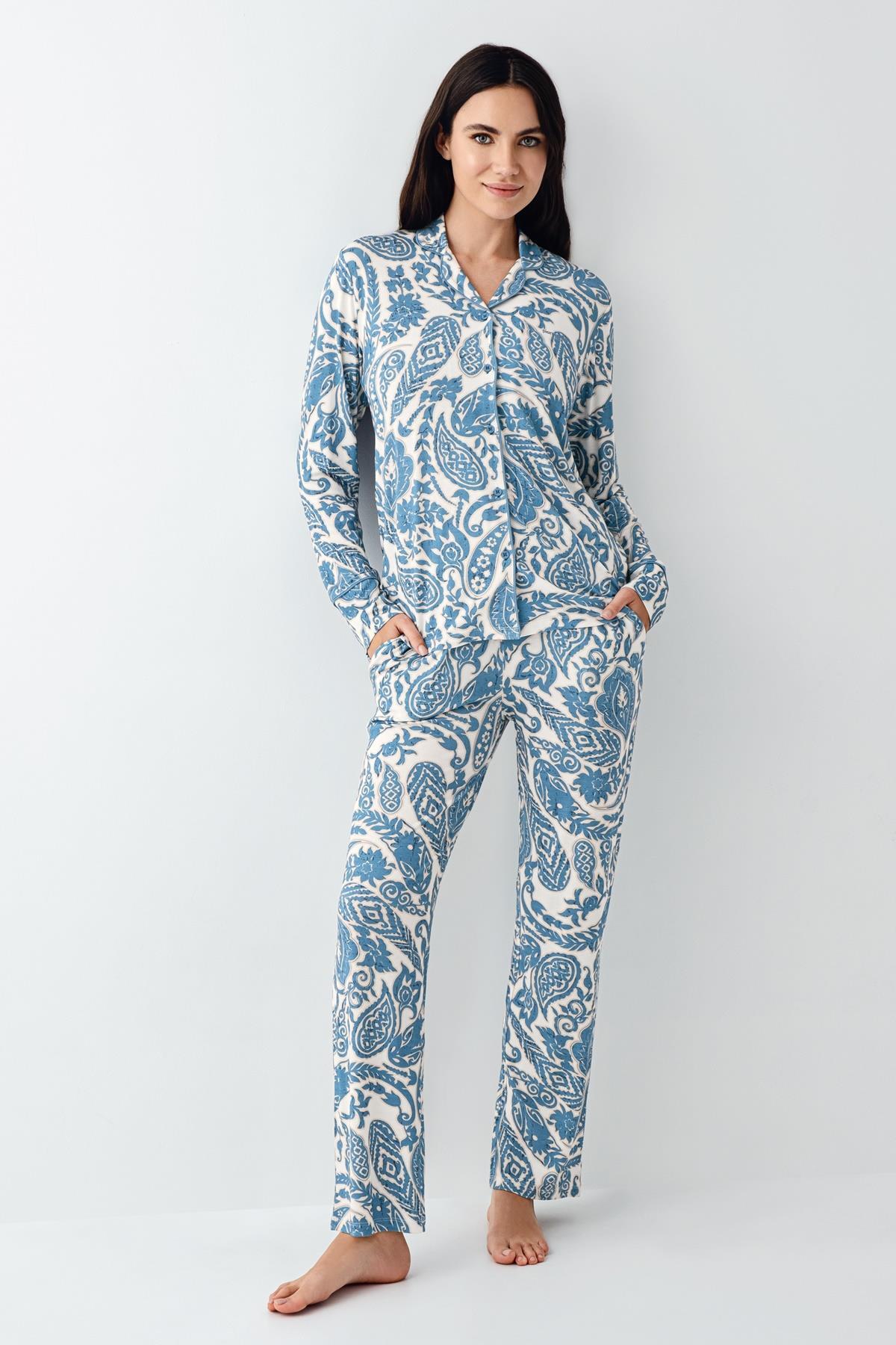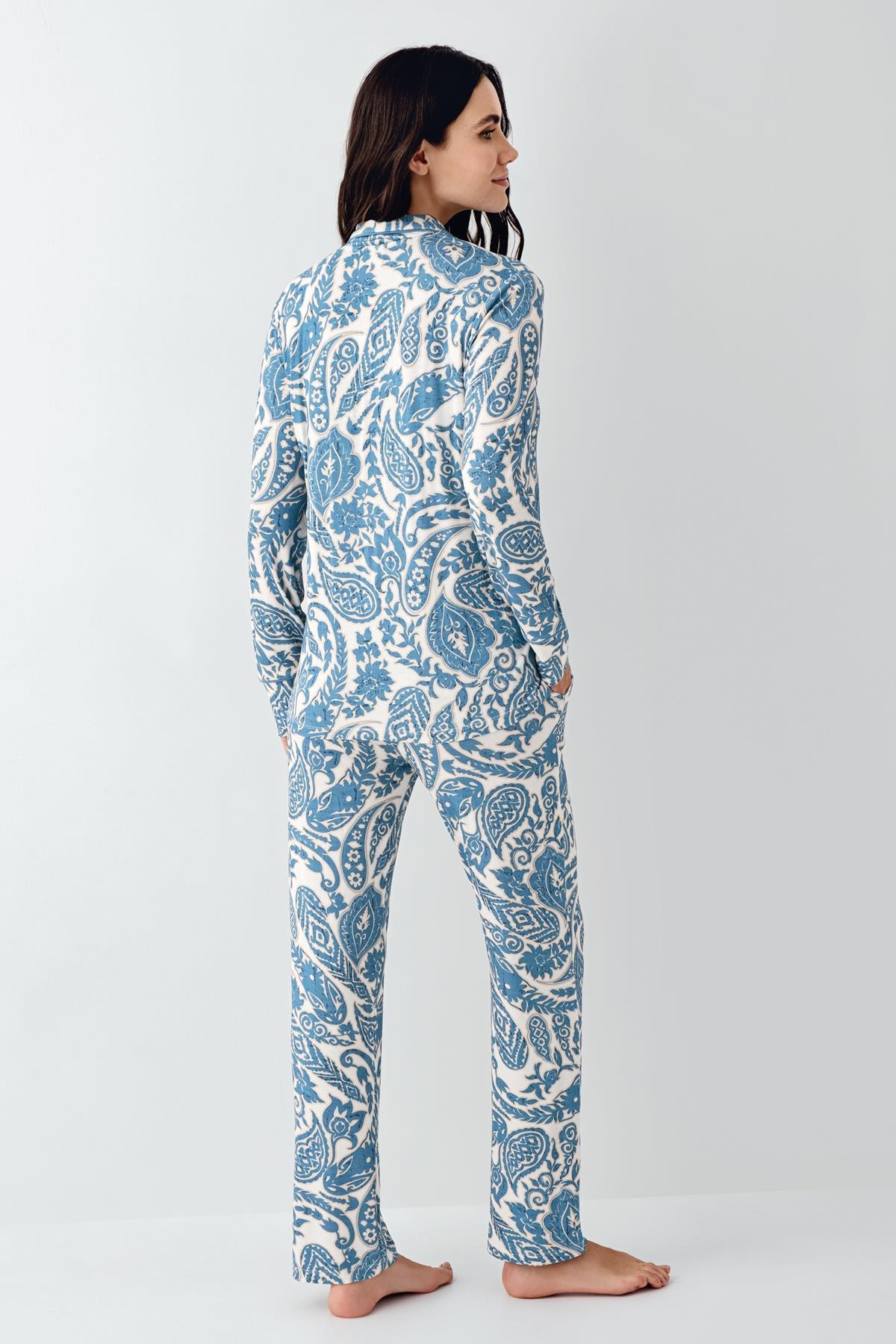 Kadın Turkuaz Gömlek Pijama Takım, %48 Pamuk %48 Modal %4 Elastan